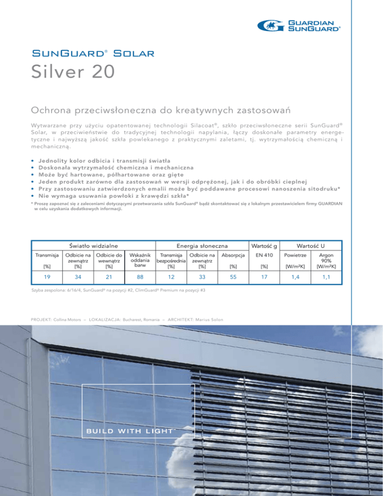 SunGuard Solar ® Silver 20 Ochrona przeciwsłoneczna do kreatywnych zastosowań Wytwarzane przy użyciu opatentowanej technologii Silacoat ® , szkło przeciwsłoneczne serii SunGuard ® Solar, w przeciwieństwie do tradycyjnej technologii napylania, łączy doskonałe parametry energetyczne i najwyższą jakość szkła powlekanego z praktycznymi zaletami, tj. wytrzymałością chemiczną i mechaniczną. • • • • • • Jednolity kolor odbicia i transmisji światła Doskonała wytrzymałość chemiczna i mechaniczna Może być hartowane, półhartowane oraz gięte Jeden produkt zarówno dla zastosowań w wersji odprężonej, jak i do obróbki cieplnej Przy zastosowaniu zatwierdzonych emalii może być poddawane procesowi nanoszenia sitodruku* Nie wymaga usuwania powłoki z krawędzi szkła* * Proszę zapoznać się z zaleceniami dotyczącymi przetwarzania szkła SunGuard® bądź skontaktować się z lokalnym przestawicielem firmy GUARDIAN w celu uzyskania dodatkowych informacji. Światło widzialne Transmisja Energia słoneczna [%] Odbicie na zewnątrz [%] Odbicie do wewnątrz [%] Wskaźnik oddania barw 19 34 21 88 Transmisja Odbicie na bezpośrednia zewnątrz [%] [%] 12 Wartość g Wartość U Absorpcja EN 410 Powietrze [%] [%] [W/m²K] Argon 90% [W/m²K] 55 17 1,4 1,1 33 Szyba zespolona: 6/16/4, SunGuard® na pozycji #2, ClimGuard® Premium na pozycji #3 PROJEKT: Collina Motors – LOKALIZACJA: Bucharest, Romania – ARCHITEKT: Marius Solon Produkty serii SunGuard ® dostępne są w różnych miejscach w Europie za pośrednictwem niezależnej sieci zakładów przetwarzających szkło GUARDIANa. W celu uzyskania dodatkowych informacji, należy skontaktować się z lokalnym przedstawicielem firmy GUARDIAN. GUARDIAN Industries U.K. Ltd. GUARDIAN Luxguard I, S.A. GUARDIAN Glass España, S.L. GUARDIAN Orosháza Kft. United Kingdom Luxembourg Spain Hungary Phone: 0044 (0) 800 032 6322 Phone: 00 352 50301 Phone: 00 34 948 817255 Phone: 0036 (0) 68 887 200 e-Mail: [email protected] e-Mail: sales_bascharage@ e-Mail: [email protected] e-Mail: oroshaza_sales@ guardian.com guardian.com GUARDIAN Thalheim GmbH GUARDIAN Częstochowa Sp. z o.o. GUARDIAN Steklo Ryazan LLC Germany Poland Russia Phone: 0049 (0) 3494 361 800 Phone: 0048 (0) 34 323 9200 Phone: 007 (8) 4912 956600 e-Mail: anwendungstechnik@ e-Mail: tech_poland@ e-Mail: [email protected] guardian.com guardian.com Podane wartości są wartościami nominalnymi podlegającymi tolerancjom produkcyjnym. Podane wartości spektrofotometryczne są zgodne z EN 410; wartości współczynnika przenikania ciepła U są zgodne z EN 673. Sprzedaż produktów przedstawionych w tej publikacji podlega ogólnym warunkom sprzedaży firmy GUARDIAN, jak rownież dodatkowym obowiązującym pisemnym gwarancjom. Nabywca jest odpowiedzialny za potwierdzenie, że produkty są odpowiednie do ich zamierzonego zastosowania. W celu uzyskania wszelkich stosownych instrukcji użytkowania i obsługi, jak rownież aktualnych informacji o produkcie, prosimy o kontakt z Państwa lokalnym przedstawicielem firmy GUARDIAN. www.sunguardglass.pl GUARDIAN Europe Numer referencyjny: 6-16-4 / S S 20 / PL / 12-11 ©2011 GUARDIAN Industries Corp. Nazwa SunGuard ® jest zastrzeżonym znakiem towarowym należącym do GUARDIAN Industries Corp.
