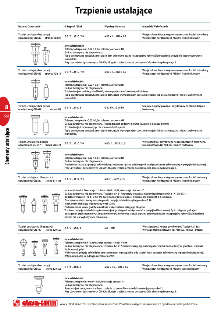 Trzpienie ustalające Nazwa / Oznaczenie Ø Trzpień / Skok Wymiary / Montaż Materiał / Wykończenie Trzpień ustalający bez pozycji odwiedzionej GN 617 strona 508/509 Ø 5 / 5 ... Ø 10 / 10 M10 x 1 ... M20 x 1,5 Wersja stalowa: Korpus oksydowany na czarno, Trzpień utwardzany Wersja ze stali nierdzewnej-NI: AISI 303, Trzpień niklowany Inne właściwości: Tolerancja trzpienia: -0,02 / -0,04, tolerancja otworu: H7 Gałka z tworzywa, nie zdejmowana. Typ z gwintowaną końcówką stosuje się tam gdzie wymagana jest specjalna rękojeść lub ustalanie pozycji nie jest wykonywane manualnie. Przy użyciu tulei dystansowych GN 609, długość trzpienia można dostosować do określonych wymagań. Trzpień ustalający bez pozycji odwiedzionej GN 613 strona 512/513 Ø 5 / 5 ... Ø 10 / 10 M10 x 1 ... M20 x 1,5 Wersja stalowa: Korpus oksydowany na czarno, Trzpień utwardzany Wersja ze stali nierdzewnej-NI: AISI 303, Trzpień niklowany Inne właściwości: Tolerancja trzpienia: -0,02 / -0,04, tolerancja otworu: H7 Gałka z tworzywa, nie zdejmowana. Trzpień ten jest podobny do GN 617, ale nie posiada sześciokątnego kołnierza. Typ z gwintowaną końcówką stosuje się tam, gdzie wymagana jest specjalna rękojeść lub ustalanie pozycji nie jest wykonywane manualnie. 8 Trzpień ustalający bez pozycji odwiedzionej GN 618 strona 518 Elementy ustalające 506 Ø 5 / 5 ... Ø 8 / 8 Ø 12 h9 ... Ø 18 h9 Stalowy, do przyspawania, oksydowany na czarno, trzpień hartowany. Inne właściwości: Tolerancja trzpienia: -0,02 / -0,04, tolerancja otworu: G7 Gałka z tworzywa, nie zdejmowana. Trzpień ten jest podobny do GN 613, lecz nie posiada gwintu. Trzpień ten jest montowany przez spawanie lub klejenie. Typ z gwintowaną końcówką stosuje się tam, gdzie wymagana jest specjalna rękojeść lub ustalanie pozycji nie jest wykonywane manualnie. Trzpień ustalający z pozycją odwiedzioną GN 617.1 strona 510/511 Ø 5 / 5 ... Ø 10 / 10 M10x 1 ... M20 x 1,5 Wersja stalowa, oksydowana na czarno, trzpień hartowany. Stal nierdzewna NI: AISI 303, trzpień niklowany Inne właściwości: Tolerancja trzpienia: -0,02 / -0,04, tolerancja otworu: H7 Gałka z tworzywa, nie zdejmowana Trzpienie ustalające z pozycją odwiedzioną stosowane są tam, gdzie trzpień musi pozostawać zablokowany w pozycji odwiedzionej. Przy użyciu tulei dystansowych GN 609, długość trzpienia można dostosować do określonych wymagań. Trzpień ustalający z i bez pozycji odwiedzionej GN 817 strona 514-516 Ø 4 / 4 ... Ø 12 / 15 M8 x 1 ... M20 x 1,5 Wersja stalowa: Korpus oksydowany na czarno, Trzpień hartowany Wersja ze stali nierdzewnej-NI: AISI 303, Trzpień niklowany Inne właściwości: Tolerancja trzpienia: -0,02 / -0,04, tolerancja otworu: H7 Gałka z tworzywa, nie zdejmowana. Trzpienie GN 817 powstały w wyniku modernizacji trzpieni GN 617 i GN 617.1: dodatkowy trzpień – Ø 4 i Ø 12. Po dwie standardowe długości trzpienia dla średnic Ø 4, 5, 6 i 8 mm. Znacząco zmniejszone wymiary trzpieni z pozycją odwiedzioną i trzpienia o Ø 10 Mechanizm blokujący wbudowany w łeb (DBP) Podtoczenie na końcu gwintu umożliwia wykorzystanie całej jego długości Trzpień z pozycją odwiedzioną stosowany jest gdy trzpień musi pozostać w pozycji odblokowanej. By to osiągnąć gałka jest odciągana i przekręcana o 90º. Typ z gwintowaną końcówką stosuje się tam, gdzie wymagana jest specjalna rękojeść lub ustalanie pozycji nie jest wykonywane manualnie. Trzpień ustalający z i bez pozycji odwiedzionej GN 717 strona 520-523 Ø 4 / 4 ... Ø 8 / 8 M6 ... M12 Wersja stalowa: Korpus ocynkowany, Trzpień AISI 303 Wersja ze stali nierdzewnej-NI: AISI 303, Korpus i trzpień Inne właściwości: Tolerancja trzpienia: h11, tolerancja otworu: + 0,03/ + 0,08 Gałka z tworzywa, nie zdejmowana. Trzpienie GN 717 charakteryzują się małymi gabarytami i standardowymi gwintami (zamiast drobnozwojnych). Wykonanie z pozycją odwiedzioną stosowane jest w przypadku, gdy trzpień musi pozostać zablokowany w pozycji odwiedzionej. W tym celu gałkę się odciąga i przekręca o 90º. Trzpień ustalający bez pozycji odwiedzionej GN 607 strona 524-525 Ø 6 / 6 ... Ø 8 / 8 M12 x 1,5 ... M16 x 1,5 Wersja stalowa: Korpus oksydowany na czarno, Trzpień hartowany Wersja ze stali nierdzewnej-NI: AISI 303, trzpień niklowany Inne właściwości: Tolerancja trzpienia: - 0,02/ - 0,04, tolerancja otworu: H7 Gałka z tworzywa, nie zdejmowana. Sprężyna jest zintegrowana z łbem trzpienia co pozwoliło na zredukowanie jego wysokości. Przy użyciu tulei dystansowych GN 609, długość trzpienia można dostosować do określonych wymagań. Wzory ELESA i GANTER - wszelkie prawa zastrzeżone. Powielanie naszych rysunków zawsze z podaniem źródła pochodzenia. Nazwa / Oznaczenie Ø Trzpień / Skok Wymiary / Montaż Materiał / Wykończenie Trzpień ustalający z pozycją odwiedzioną GN 607.1 strona 526-527 Ø 6 / 6 ... Ø 8 / 8 M12 x 1,5 ... M16 x 1,5 Wersja stalowa ST: Korpus oksydowany na czarno, Trzpień hartowany Wersja ze stali nierdzewnej-NI: AISI 303, Trzpień niklowany Inne właściwości: Tolerancja trzpienia: - 0,02/ - 0,04, tolerancja otworu: H7 Gałka z tworzywa, nie zdejmowana. Trzpień z pozycją odwiedzioną stosowany jest gdy trzpień musi pozostać w pozycji odblokowanej. By to osiągnąć gałka jest odciągana i przekręcana o 90º. W trzpieniu GN 607.1 sprężyna i mechanizm blokujący są zintegrowane z grzybkiem (DBP). Zapewnia to doskonałą pracę, a zredukowana wysokość jest taka sama jak w trzpieniach GN 607. Przy użyciu tulei dystansowych GN 609, długość trzpienia można dostosować do określonych wymagań. Trzpień ustalający bez pozycji odwiedzionej GN 607.2 strona 528 Ø 6 / 6 ... Ø 8 / 7,5 Ø 10 ... Ø 12 Są to Ø otworów montażowych pod trzpień, który jest blokowany nakrętką sześciokątną. Korpus ocynkowany, trzpień AISI 303, niklowany Inne właściwości: Tolerancja trzpienia: - 0,02/ - 0,0