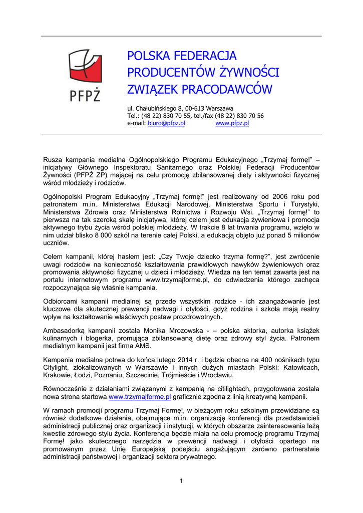 POLSKA FEDERACJA PRODUCENTÓW ŻYWNOŚCI ZWIĄZEK PRACODAWCÓW ul. Chałubińskiego 8, 00-613 Warszawa Tel.: (48 22) 830 70 55, tel./fax (48 22) 830 70 56 e-mail: [email protected] www.pfpz.pl Rusza kampania medialna Ogólnopolskiego Programu Edukacyjnego „Trzymaj formę!” – inicjatywy Głównego Inspektoratu Sanitarnego oraz Polskiej Federacji Producentów Żywności (PFPŻ ZP) mającej na celu promocję zbilansowanej diety i aktywności fizycznej wśród młodzieży i rodziców. Ogólnopolski Program Edukacyjny „Trzymaj formę!” jest realizowany od 2006 roku pod patronatem m.in. Ministerstwa Edukacji Narodowej, Ministerstwa Sportu i Turystyki, Ministerstwa Zdrowia oraz Ministerstwa Rolnictwa i Rozwoju Wsi. „Trzymaj formę!” to pierwsza na tak szeroką skalę inicjatywa, której celem jest edukacja żywieniowa i promocja aktywnego trybu życia wśród polskiej młodzieży. W trakcie 8 lat trwania programu, wzięło w nim udział blisko 8 000 szkół na terenie całej Polski, a edukacją objęto już ponad 5 milionów uczniów. Celem kampanii, której hasłem jest: „Czy Twoje dziecko trzyma formę?”, jest zwrócenie uwagi rodziców na konieczność kształtowania prawidłowych nawyków żywieniowych oraz promowania aktywności fizycznej u dzieci i młodzieży. Wiedza na ten temat zawarta jest na portalu internetowym programu www.trzymajforme.pl, do odwiedzenia którego zachęca rozpoczynająca się właśnie kampania. Odbiorcami kampanii medialnej są przede wszystkim rodzice - ich zaangażowanie jest kluczowe dla skutecznej prewencji nadwagi i otyłości, gdyż rodzina i szkoła mają realny wpływ na kształtowanie właściwych postaw prozdrowotnych. Ambasadorką kampanii została Monika Mrozowska - – polska aktorka, autorka książek kulinarnych i blogerka, promująca zbilansowaną dietę oraz zdrowy styl życia. Patronem medialnym kampanii jest firma AMS. Kampania medialna potrwa do końca lutego 2014 r. i będzie obecna na 400 nośnikach typu Citylight, zlokalizowanych w Warszawie i innych dużych miastach Polski: Katowicach, Krakowie, Łodzi, Poznaniu, Szczecinie, Trójmieście i Wrocławiu. Równocześnie z działaniami związanymi z kampanią na citilightach, przygotowana została nowa strona startowa www.trzymajforme.pl graficznie zgodna z linią kreatywną kampanii. W ramach promocji programu Trzymaj Formę!, w bieżącym roku szkolnym przewidziane są również dodatkowe działania, obejmujące m.in. organizację konferencji dla przedstawicieli administracji publicznej oraz organizacji i instytucji, w których obszarze zainteresowania leżą kwestie zdrowego stylu życia. Konferencja będzie miała na celu promocję programu Trzymaj Formę! jako skutecznego narzędzia w prewencji nadwagi i otyłości opartego na promowanym przez Unię Europejską podejściu angażującym zarówno partnerstwie administracji państwowej i organizacji sektora prywatnego. 1
