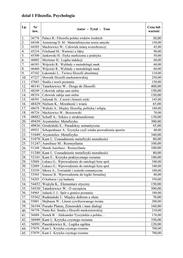 dział 1 Filozofia. Psychologia Lp. Nr inw. Autor - Tytuł - Tom 1. 2. 3. 4. 5. 6. 7. 8. 9. 10. 11. 12. 13. 14. 15. 16. 17. 18. 19. 20. 21. 22. 23. 24. 25. 26. 27. 28. 29. 30. 31. 32. 33. 34. 35. 36. 37. 38. 39. 40. 41. 42. 43. 44. 45. 36776 44348 44585 45234 45300 46002 46383 46460 47102 47227 47683 Palacz R.: Filozofia polska wieków średnich Armstrong D. M.: Materialistyczna teoria umysłu Mackiewicz W.: Człowiek miarą wszechrzeczy Fritzhand M.: Wartości a fakty Jankowski H.: Etyka marksizmu a praktyka Mortimer H.: Logika indukcji Wójcicki R.: Wykłady z metodologii nauk Wójcicki R.: Wykłady z metodologii nauk Łukomski L.: Twórca filozofii absolutnej Słownik filozofii marksistowskiej Studia z teorii poznania 48141 Tatarkiewicz W.: Droga do filozofii 48249 Człowiek zabija sam siebie 48354 Człowiek zabija sam siebie 48391 Jedynak St.: Z teorii i historii etyki Cena lub wartość 30,00 150,00 45,00 90,00 50,00 60,00 60,00 60,00 110,00 250,00 150,00 400,00 150,00 150,00 145,00 48429 Nielsen K.: Moralność i wiara 65,00 48678 Walicki A.: Między filozofią, polityką i religią 48724 Mackiewicz W.: Brzozowski 180,00 70,00 48882 Schaff A.: Szkice o strukturalizmie 49439 Arystoteles: Metafizyka 49836 Grodziński E.: Paradoksy semantyczne 130,00 300,00 45,00 49921 Schopenhauer A.: Erystyka czyli sztuka prowadzenia sporów 51049 Arystoteles: Metafizyka 51078 Kant I.: Uzasadnienie metafizyki moralności 51247 Aureliusz M.: Rozmyślania 51248 Marek Aureliusz : Rozmyślania 51280 Kant I.: Uzasadnienie metafizyki moralności 52101 Kant E.: Krytyka praktycznego rozumu 52888 52889 53559 53565 54203 Łukacs G.: Wprowadzenie do ontologii bytu społ. Łukacs G.: Wprowadzenie do ontologii bytu społ. Sikora A.: Towiański i rozterki romantyczne Stanosz B.: Wprowadzenie do logiki formalnej O kulturze i jej badaniu 40,00 340,00 80,00 100,00 100,00 80,00 180,00 340,00 340,00 100,00 80,00 350,00 54452 Wojtyła K.: Elementarz etyczny 54530 Tatarkiewicz W.: O szczęściu 150,00 500,00 54965 Jadacki J. J.: Spór o granice poznania 180,00 55562 Rudniański J.: Między dobrem a złem 70,00 55801 Mejbaum W.: Literat cywilizowanego świata 200,00 56194 Pseudo Platon, Zimorodek i inne dialogi 160,00 56739 Panta Rei. Studia z filozofii marksistowskiej 56888 Szotek B. : Aleksander Tyszyńskie a polska… 210,00 176,00 56949 Kant I.: Krytyka czystego rozumu 56991 Pasenkiewicz K.: Logika ogólna 350,00 120,00 57078 Kant I.: Krytyka czystego rozumu 57079 Kant I.: Krytyka czystego rozumu 700,00 700,00 46. 47. 48. 49. 50. 51. 52. 53. 54. 55. 56. 57. 58. 59. 60. 61. 62. 63. 64. 65. 66. 67. 68. 69. 70. 71. 72. 73. 74. 75. 76. 77. 78. 79. 80. 81. 82. 83. 84. 85. 86. 87. 88. 89. 57561 Etyka prostomyślności a tradycje 58061 Fleck L.: Powstanie i rozwój faktu nauk. 200,00 250,00 58074 Jedynak S.: Etyka w Polsce 58838 Motycka A.: Ideał racjonalności 420,00 470,00 58839 58892 58992 59193 59452 59498 59619 59703 Motycka A.: Ideał racjonalności Wiśniewska- Roszkowska K.: Eros zabłąkany Such J.: Szkice o dialektyce Szestow L.: Dostojewski i Nietzsche Murawski K.: Piękno myślenia Szawarski Z.: Rozmowy o etyce Dilthey W.: O istocie filozofii W kręgu życia i śmierci 470,00 350,00 250,00 350,00 160,00 140,00 380,00 300,00 60086 Bocheński J.M.: Ku Filozoficznemu myśleniu 120,00 60726 Łubnicki N. : Nauka poprawnego myślenia 400,00 60777 Znaniecki F.: Myśl i rzeczywistość i inne… 60922 Zabieglik S.: Krzywe zwierciadło filozofii… 560,00 800,00 61953 Promińska H.: Zasada tolerancji 360,00 62103 Plutarch: Moralia 62121 Sarnowski S.: Rozumność i świat 62211 Moralia: Plutarch 640,00 380,00 640,00 62647 63015 63456 63870 64172 Manteuffel : Moja filozofia życiowa Przełęcki M.: Logika teorii empirycznych Mała encyklopedia logiki Kierkeegard S.: Okruchy filozoficzne. Chwila. Człowiek i wartości moralne 64191 Hempoliński M.: Filozofia współczesna 64463 64721 64887 65814 65816 Grzegorczyk A.; Mała propedeutyka filozofii naukowej Wiśniewska-Roszkowska K.: Eros zabłąkany Mariański J.: Wprowadzenie do socjologii moralności Woźniczka M.: Etyka Woźniczka M.L: Etyka 66577 Ingarden R.: Wykłady z etyki 67095 Między sensem a genami 67096 67109 67389 67928 68169 68271 69484 69508 69509 69651 70036 Między sensem a genami Racjonalność współczesności Etyka XX wieku Biblioteka szkolna – organizacja Dąmska I.: Zarys historii filozofii greckiej Człowiek. Drogi poszukiwań Poradowski M.: Wyzwolenie czy ujarzmienie Omyła M.: Zarys logiki Omyła M.: Zarys logiki Anzenbacher A.: Wprowadzenie do filozofii Szewczyk L.: Służby specjalne RP czy mafia 250,00 200,00 950,00 1000,00 1200,00 640,00 500,00 1000,00 600,00 200,00 200,00 1500,00 30000,00 30000,00 58000,00 14000,00 85000,00 68000,00 17000,00 3,50 8,50 8,50 7,00 7,00