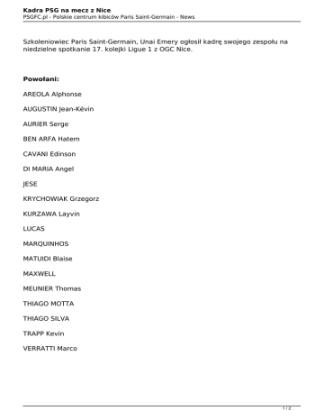 Kadra PSG na mecz z Nice PSGFC.pl - Polskie centrum kibiców Paris Saint-Germain - News Szkoleniowiec Paris Saint-Germain, Unai Emery ogłosił kadrę swojego zespołu na niedzielne spotkanie 17. kolejki Ligue 1 z OGC Nice. Powołani: AREOLA Alphonse AUGUSTIN Jean-Kévin AURIER Serge BEN ARFA Hatem CAVANI Edinson DI MARIA Angel JESE KRYCHOWIAK Grzegorz KURZAWA Layvin LUCAS MARQUINHOS MATUIDI Blaise MAXWELL MEUNIER Thomas THIAGO MOTTA THIAGO SILVA TRAPP Kevin VERRATTI Marco 1/2 Kadra PSG na mecz z Nice PSGFC.pl - Polskie centrum kibiców Paris Saint-Germain - News Nieobecni: CALLEGARI Lorenzo DESCAMPS Rémy GEORGEN Alec IKONE Nanitamo Jonathan NKUNKU KIMPEMBE ONGENDA Hervin PASTORE Javier RABIOT Adrien Autor: PSGKP 2/2 Powered by TCPDF (www.tcpdf.org)
