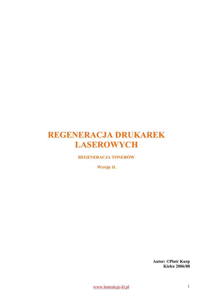REGENERACJA DRUKAREK LASEROWYCH REGENERACJA TONERÓW Wersja 1i. Autor: ©Piotr Kurp Kielce 2006/08 www.instrukcje-kl.pl 1 UWAGA!!! Wszystkie u yte znaki towarowe s w asno ci ich prawnych w cicieli i zosta y tu przywo ane jedynie w celach informacyjnych. Instrukcja nie mo e by powielana, ani rozpowszechniana w ca ci lub w cz ci w celach komercyjnych bez uprzedniej zgody autora. Autor nie ponosi odpowiedzialno ci za uszkodzenia wynik e z niew si do wskazówek w instrukcji. ciwego zastosowania RADY OGÓLNE 1. Je eli Pa stwo wcze niej tego nie robili, to zalecam jedynie wyci gniecie korka, zasypanie kasety tonerem oraz wymian chipa (je eli wyst puje). Niedo wiadczony ytkownik mo e niew ciwie zregenerowa kaset , co mo e spowodowa pogorszenie jako ci wydruków. 2. Dla starszych typów drukarek posiadaj cych tzw. " mietnik" zaleca si jego czyszczenie ze zu ytego proszku przy ka dorazowej regeneracji kasety. 3. Przed nape nieniem kasety nowym proszkiem zalecam bardzo dok adne wyczyszczenie zasobnika ze starego proszku (najlepiej odkurzaczem). Czasem proszek oryginalnej kasety mo e reagowa z proszkiem u ytym do regeneracji (dotyczy g ównie drukarek Lexmark E3**, Brother i nowszych modeli HP – informacja zawarta w instrukcji). www.instrukcje-kl.pl 2 REGENERACJA I KONSERWACJA TONERA Tonery dla Brother HL 1240 / 1250. Wydajno ci: TN430 TN460 – 3000 stron 5% – 6000 stron 5% 1. Wyjmij korek otworu na proszek. Wyczy rodek zasobnika ze starego proszku np. u ywaj c odkurzacza. !!UWAGA!! Kaset nale y bardzo dok adnie oczy ci ze starego proszku. W przeciwnym wypadku na wydruku mog pojawia si nieregularne plamy oraz szare t o. 2. Od strony bez mechanizmów z batych wyjmij bia o oraz spr yn dociskow wa ka rozprowadzaj cego – u yj p askiego rubokr tu aby podwa element jak na zdj ciu. Uwaga! Spr ynka nie jest przytwierdzona do osi – uwa aj aby jej nie zgubi . 3. ywaj c p askiego rubokr ta podwa ma p ytk plastikow przytrzymuj rolk rozprowadzaj i rolk czyszcz . Je eli powy sza instrukcja okaza a si dla Ciebie pomocna, prosz kliknij 3 dowolne reklamy na stronie: www.instrukcje-kl.pl www.instrukcje-kl.pl 3 4. Od strony mechanizmów z batych nad bia osi ulokowany jest ma y bolec przytrzymuj cy. Kilkakrotnie wci nij bolec – uwolni to ma plastikow p ytk trzymaj tulej rozprowadzacza. 5. Wyjmij rolk rozprowadzaj . U ywaj c odkurzacza wyczy zal gaj cy stary toner w pojemniku. R cznie obracaj c g bk dozuj wyczy j odkurzaczem. Uwa aj aby nie uszkodzi tych elementów. 6. Tuleje rolki rozprowadzaj cej s zmontowane z listw czyszcz . Nie jest zalecane wyjmowanie listwy czyszcz cej co spowoduje uszkodzenie tulei. Wyczy listw czyszcz watk nas czon spirytusem. Uwaga!! W pojemniku za listw czyszcz zbiera si nie zu yty proszek. Po kilkakrotnym nape nieniu tonera nale y go usun przez wyj cie listwy. www.instrukcje-kl.pl 4 7. toner powtarzaj c powy sze czynno ci w odwrotnej kolejno ci. Uzupe nij toner proszkiem, a otwór zatkaj korkiem. Je eli powy sza instrukcja okaza a si dla Ciebie pomocna, prosz kliknij 3 dowolne reklamy na stronie: www.instrukcje-kl.pl Zamów proszek do kasety: [email protected] Potrzebujesz chipów do innych drukarek laserowych – napisz: [email protected] www.instrukcje-kl.pl 5