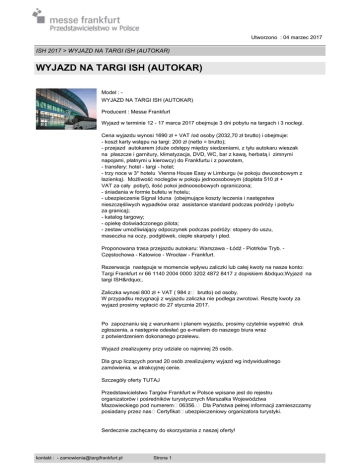 Utworzono : 04 marzec 2017 ISH 2017 > WYJAZD NA TARGI ISH (AUTOKAR) WYJAZD NA TARGI ISH (AUTOKAR) Model : WYJAZD NA TARGI ISH (AUTOKAR) Producent : Messe Frankfurt Wyjazd w terminie 12 - 17 marca 2017 obejmuje 3 dni pobytu na targach i 3 noclegi. Cena wyjazdu wynosi 1690 zł + VAT /od osoby (2032,70 zł brutto) i obejmuje: - koszt karty wstępu na targi: 200 zł (netto = brutto); - przejazd autokarem (duże odstępy między siedzeniami, z tyłu autokaru wieszak na płaszcze i garnitury, klimatyzacja, DVD, WC, bar z kawą, herbatą i zimnymi napojami, płatnymi u kierowcy) do Frankfurtu i z powrotem, - transfery: hotel - targi - hotel; - trzy noce w 3* hotelu Vienna House Easy w Limburgu (w pokoju dwuosobowym z łazienką). Możliwość noclegów w pokoju jednoosobowym (dopłata 510 zł + VAT za cały pobyt), ilość pokoi jednoosobowych ograniczona; - śniadania w formie bufetu w hotelu; - ubezpieczenie Signal Iduna (obejmujące koszty leczenia i następstwa nieszczęśliwych wypadków oraz assistance standard podczas podróży i pobytu za granicą); - katalog targowy; - opiekę doświadczonego pilota; - zestaw umożliwiający odpoczynek podczas podróży: stopery do uszu, maseczka na oczy, podgłówek, ciepłe skarpety i pled. Proponowana trasa przejazdu autokaru: Warszawa - Łódź - Piotrków Tryb. Częstochowa - Katowice - Wrocław - Frankfurt. Rezerwacja następuje w momencie wpływu zaliczki lub całej kwoty na nasze konto: Targi Frankfurt nr 66 1140 2004 0000 3202 4872 8417 z dopiskiem „Wyjazd na targi ISH”. Zaliczka wynosi 800 zł + VAT ( 984 z� brutto) od osoby. W przypadku rezygnacji z wyjazdu zaliczka nie podlega zwrotowi. Resztę kwoty za wyjazd prosimy wpłacić do 27 stycznia 2017. Po zapoznaniu się z warunkami i planem wyjazdu, prosimy czytelnie wypełnić druk zgłoszenia, a następnie odesłać go e-mailem do naszego biura wraz z potwierdzeniem dokonanego przelewu. Wyjazd zrealizujemy przy udziale co najmniej 25 osób. Dla grup liczących ponad 20 osób zrealizujemy wyjazd wg indywidualnego zamówienia, w atrakcyjnej cenie. Szczegóły oferty TUTAJ Przedstawicielstwo Targów Frankfurt w Polsce wpisane jest do rejestru organizatorów i pośredników turystycznych Marszałka Województwa Mazowieckiego pod numerem�06356.� Dla Państwa pełnej informacji zamieszczamy posiadany przez nas�Certyfikat�ubezpieczeniowy organizatora turystyki. Serdecznie zachęcamy do skorzystania z naszej oferty! kontakt : - [email protected] Strona 1 Utworzono : 04 marzec 2017 ISH 2017 > WYJAZD NA TARGI ISH (AUTOKAR) WYJAZD NA TARGI ISH (AUTOKAR) Normal 0 21 false false false PL X-NONE X-NONE DefSemiHidden="true" DefQFormat="false" DefPriority="99" LatentStyleCount="267"> UnhideWhenUsed="false" QFormat="true" Name="Normal" /> UnhideWhenUsed="false" QFormat="true" Name="heading 1" /> kontakt : - [email protected] Strona 2 Utworzono : 04 marzec 2017 ISH 2017 > WYJAZD NA TARGI ISH (AUTOKAR) WYJAZD NA TARGI ISH (AUTOKAR) UnhideWhenUsed="false" QFormat="true" Name="Title" /> UnhideWhenUsed="false" QFormat="true" Name="Subtitle" /> UnhideWhenUsed="false" QFormat="true" Name="Strong" /> UnhideWhenUsed="false" QFormat="true" Name="Emphasis" /> UnhideWhenUsed="false" Name="Table Grid" /> UnhideWhenUsed="false" QFormat="true" Name="No Spacing" /> UnhideWhenUsed="false" Name="Light Shading" /> UnhideWhenUsed="false" Name="Light List" /> UnhideWhenUsed="false" Name="Light Grid" /> UnhideWhenUsed="false" Name="Medium Shading 1" /> UnhideWhenUsed="false" Name="Medium Shading 2" /> UnhideWhenUsed="false" Name="Medium List 1" /> UnhideWhenUsed="false" Name="Medium List 2" /> UnhideWhenUsed="false" Name="Medium Grid 1" /> UnhideWhenUsed="false" Name="Medium Grid 2" /> UnhideWhenUsed="false" Name="Medium Grid 3" /> UnhideWhenUsed="false" Name="Dark List" /> kontakt : - [email protected] Strona 3 Utworzono : 04 marzec 2017 ISH 2017 > WYJAZD NA TARGI ISH (AUTOKAR) WYJAZD NA TARGI ISH (AUTOKAR) UnhideWhenUsed="false" Name="Colorful Shading" /> UnhideWhenUsed="false" Name="Colorful List" /> UnhideWhenUsed="false" Name="Colorful Grid" /> UnhideWhenUsed="false" Name="Light Shading Accent 1" /> UnhideWhenUsed="false" Name="Light List Accent 1" /> UnhideWhenUsed="false" Name="Light Grid Accent 1" /> UnhideWhenUsed="false" Name="Medium Shading 1 Accent 1" /> UnhideWhenUsed="false" Name="Medium Shading 2 Accent 1" /> UnhideWhenUsed="false" Name="Medium List 1 Accent 1" /> UnhideWhenUsed="false" QFormat="true" Name="List Paragraph" /> UnhideWhenUsed="false" QFormat="true" Name="Quote" /> UnhideWhenUsed="false" QFormat="true" Name="Intense Quote" /> UnhideWhenUsed="false" Name="Medium List 2 Accent 1" /> UnhideWhenUsed="false" Name="Medium Grid 1 Accent 1" /> UnhideWhenUsed="false" Name="Medium Grid 2 Accent 1" /> UnhideWhenUsed="false" Name="Medium Grid 3 Accent 1" /> UnhideWhenUsed="false" Name="Dark List Accent 1" /> UnhideWhenUsed="false" Name="Colorful Shading Accent 1" /> UnhideWhenUsed="false" Name="Colorful List Accent 1" /> UnhideWhenUsed="false" Name="Colorful Grid Accent 1" /> UnhideWhenUsed="false" Name="Light Shading Accent 2" /> UnhideWhenUsed="false" Name="Light List Accent 2" /> UnhideWhenUsed="false" Name="Light Grid Accent 2" /> UnhideWhenUsed="false" Name="Medium Shading 1 Accent 2" /> UnhideWhenUsed="false" Name="Medium Shading 2 Accent 2" /> UnhideWhenUsed="false" Name="Medium List 1 Accent 2" /> UnhideWhenUsed="false" Name="Medium List 2 Accent 2" /> kontakt : - [email protected] Strona 4 Utworzono : 04 marzec 2017 ISH 2017 > WYJAZD NA TARGI ISH (AUTOKAR) WYJAZD NA TARGI ISH (AUTOKAR) UnhideWhenUsed="false" Name="Medium Grid 1 Accent 2" /> UnhideWhenUsed="false" Name="Medium Grid 2 Accent 2" /> UnhideWhenUsed="false" Name="Medium Grid 3 Accent 2" /> UnhideWhenUsed="false" Name="Dark List Accent 2" /> UnhideWhenUsed="false" Name="Colorful Shading Accent 2" /> UnhideWhenUsed="false" Name="Colorful List Accent 2" /> UnhideWhenUsed="false" Name="Colorful Grid Accent 2" /> UnhideWhenUsed="false