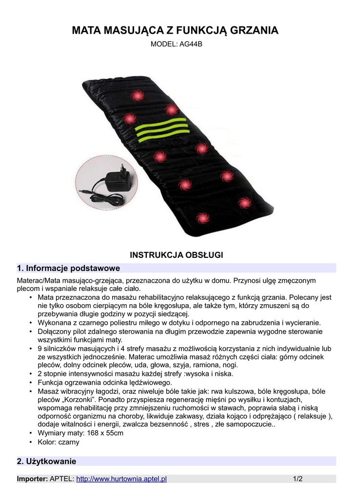 MATA MASUJĄCA Z FUNKCJĄ GRZANIA MODEL: AG44B INSTRUKCJA OBSŁUGI 1. Informacje podstawowe Materac/Mata masująco-grzejąca, przeznaczona do użytku w domu. Przynosi ulgę zmęczonym plecom i wspaniale relaksuje całe ciało. • Mata przeznaczona do masażu rehabilitacyjno relaksującego z funkcją grzania. Polecany jest nie tylko osobom cierpiącym na bóle kręgosłupa, ale także tym, którzy zmuszeni są do przebywania długie godziny w pozycji siedzącej. • Wykonana z czarnego poliestru miłego w dotyku i odpornego na zabrudzenia i wycieranie. • Dołączony pilot zdalnego sterowania na długim przewodzie zapewnia wygodne sterowanie wszystkimi funkcjami maty. • 9 silniczków masujących i 4 strefy masażu z możliwością korzystania z nich indywidualnie lub ze wszystkich jednocześnie. Materac umożliwia masaż różnych części ciała: górny odcinek pleców, dolny odcinek pleców, uda, głowa, szyja, ramiona, nogi. • 2 stopnie intensywności masażu każdej strefy :wysoka i niska. • Funkcja ogrzewania odcinka lędźwiowego. • Masaż wibracyjny łagodzi, oraz niweluje bóle takie jak: rwa kulszowa, bóle kręgosłupa, bóle pleców „Korzonki”. Ponadto przyspiesza regenerację mięśni po wysiłku i kontuzjach, wspomaga rehabilitację przy zmniejszeniu ruchomości w stawach, poprawia słabą i niską odporność organizmu na choroby, likwiduje zakwasy, działa kojąco i odprężająco ( relaksuje ), dodaje witalności i energii, zwalcza bezsenność , stres , złe samopoczucie.. • Wymiary maty: 168 x 55cm • Kolor: czarny 2. Użytkowanie Importer: APTEL: http://www.hurtownia.aptel.pl 1/2 1. Połóż matę na dowolnej płaskiej powierzchni tak aby w całości była rozwinięta. 2. Podłącz wtyk zasilający maty do zasilacza sieciowego a ten wepnij do gniazdka elektrycznego o napięciu 230V 3. Połóż się płasko na macie i za pomocą pilota steruj pracą maty: • Przycisk Heat: włączanie/wyłączanie podgrzewania maty • Przełącznik Shouders: masaż ramion/szyi wyłączony/słaby/mocny • Przełącznik Lumbar: masaż pleców wyłączony/słaby/mocny • Przełącznik Thighs: masaż ud wyłączony/słaby/mocny • Przełącznik Calves: masaż łydek wyłączony/słaby/mocny Intensywność masażu dopasuj do własnych preferencji tak aby był odczuwalny i jednocześnie nie był niekomfortowy. Możesz przesuwać się po macie w górę i w dół aby lepiej dopasować włączoną strefę masażu w konkretną część ciała. Zalecamy stosować maksymalnie 2-3 20 minutowe zabiegi dziennie na jedną partię ciała. 3. Wskazówki dotyczące bezpiecznego użytkowania sprzętu i prawidłowej eksploatacji 1. Czyścić wilgotną szmatką. Nie używać silnych detergentów ani rozpuszczalników. Do czyszczenia można używać pianki do czyszczenia tekstyliów. 2. Chronić przed gorącem i bezpośrednim długotrwałym nasłonecznieniem. 3. Nigdy nie podłączać maty do innego źródła prądu o napięciu innym niż 230V. 4. Nie wolno pozostawiać włączonego zasilania maty bez nadzoru. 5. Nie wolno rozlewać jakichkolwiek płynów na powierzchi materaca. deklaracja zgodności do pobrania pod adresem: http://www.aptel.pl Importer: APTEL: http://www.hurtownia.aptel.pl 2/2