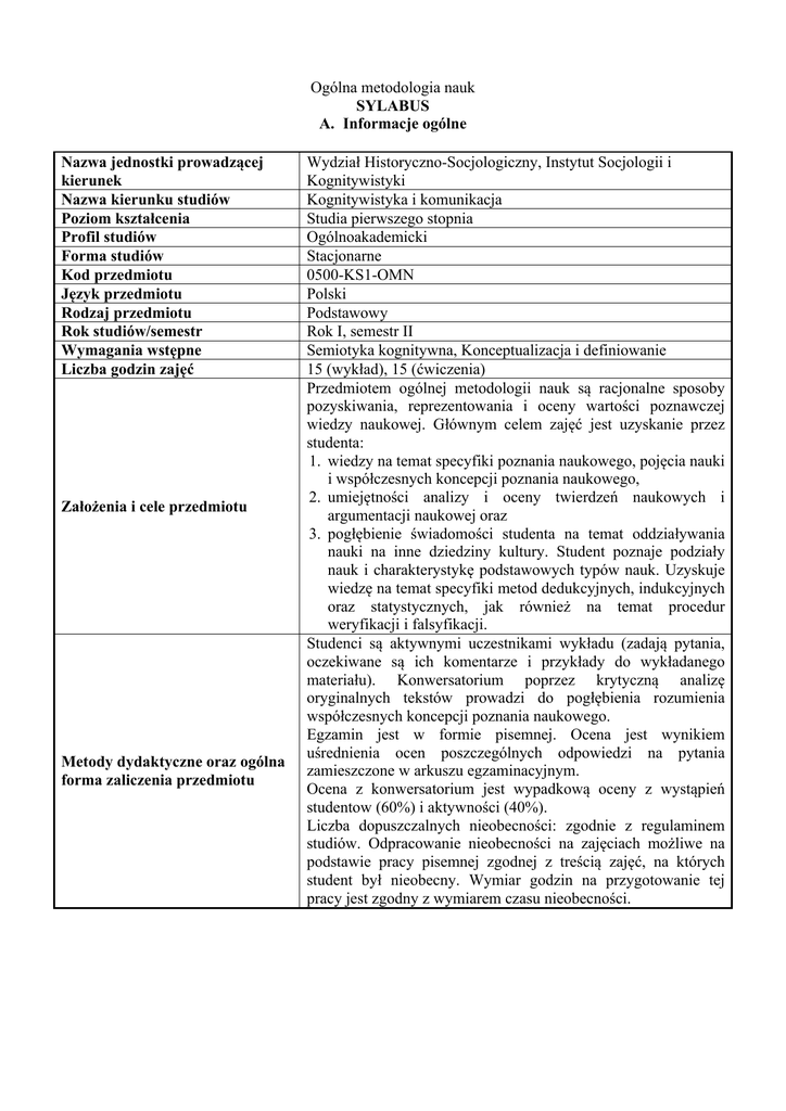 Ogólna metodologia nauk SYLABUS A. Informacje ogólne Nazwa jednostki prowadzącej kierunek Nazwa kierunku studiów Poziom kształcenia Profil studiów Forma studiów Kod przedmiotu Język przedmiotu Rodzaj przedmiotu Rok studiów/semestr Wymagania wstępne Liczba godzin zajęć Założenia i cele przedmiotu Metody dydaktyczne oraz ogólna forma zaliczenia przedmiotu Wydział Historyczno-Socjologiczny, Instytut Socjologii i Kognitywistyki Kognitywistyka i komunikacja Studia pierwszego stopnia Ogólnoakademicki Stacjonarne 0500-KS1-OMN Polski Podstawowy Rok I, semestr II Semiotyka kognitywna, Konceptualizacja i definiowanie 15 (wykład), 15 (ćwiczenia) Przedmiotem ogólnej metodologii nauk są racjonalne sposoby pozyskiwania, reprezentowania i oceny wartości poznawczej wiedzy naukowej. Głównym celem zajęć jest uzyskanie przez studenta: 1. wiedzy na temat specyfiki poznania naukowego, pojęcia nauki i współczesnych koncepcji poznania naukowego, 2. umiejętności analizy i oceny twierdzeń naukowych i argumentacji naukowej oraz 3. pogłębienie świadomości studenta na temat oddziaływania nauki na inne dziedziny kultury. Student poznaje podziały nauk i charakterystykę podstawowych typów nauk. Uzyskuje wiedzę na temat specyfiki metod dedukcyjnych, indukcyjnych oraz statystycznych, jak również na temat procedur weryfikacji i falsyfikacji. Studenci są aktywnymi uczestnikami wykładu (zadają pytania, oczekiwane są ich komentarze i przykłady do wykładanego materiału). Konwersatorium poprzez krytyczną analizę oryginalnych tekstów prowadzi do pogłębienia rozumienia współczesnych koncepcji poznania naukowego. Egzamin jest w formie pisemnej. Ocena jest wynikiem uśrednienia ocen poszczególnych odpowiedzi na pytania zamieszczone w arkuszu egzaminacyjnym. Ocena z konwersatorium jest wypadkową oceny z wystąpień studentow (60%) i aktywności (40%). Liczba dopuszczalnych nieobecności: zgodnie z regulaminem studiów. Odpracowanie nieobecności na zajęciach możliwe na podstawie pracy pisemnej zgodnej z treścią zajęć, na których student był nieobecny. Wymiar godzin na przygotowanie tej pracy jest zgodny z wymiarem czasu nieobecności. Odniesienie do kierunkowych efektów kształcenia Efekty kształcenia WIEDZA 1. Student ma podstawową wiedzę na temat pojęcia nauki. (W) 2. Student zna główne podziały nauk. (W) 3. Ma podstawową wiedzę na temat współczesnych koncepcji nauki. (W) 4. Zna podstawowe sposoby pozyskiwania wiedzy. (W, Ćw.) 5. Zna podstawowe metody oceny wartości poznawczej tez naukowych. (W, Ćw.) UMIEJĘTNOŚCI 6. Potrafi wskazać miejsce danej nauki w podziale logicznym. (Ćw.) 7. Rozróżnia podstawowe typy nauk. (Ćw.) 8. Potrafi krytycznie ocenić wartość poznawczą tezy naukowej. (Ćw.) 9. Potrafi zająć stanowisko w kwestiach koncepcji poznania naukowego. (Ćw.) KOMPETENCJE SPOŁECZNE 10. Uświadamia sobie znaczenie nauki dla życia społecznego oraz wpływ nauki na inne dziedziny kultury. (W, Ćw.) 11. Dostrzega potrzebę krytycznego odnoszenia się do tez naukowych, w poczuciu odpowiedzialności za ich konsekwencji społeczne. (W, Ćw.) Punkty ECTS Bilans nakładu pracy studenta Wskaźniki ilościowe Data opracowania: K_W05, K_W12 K_W05, K_W12 K_W05, K_W12 K_W05, K_W12, K_W15 K_W05, K_W12, K_W15 K_U02 K_U02 K_U02, K_U05 K_U02, K_U05 K_K08 K_K04, K_K07 3 Udział w wykładach – 15 Udział w ćwiczeniach – 15 Udział w konsultacjach – 10 Przygotowanie do zajęć – 15 Lektura tekstów – 20 Przygotowanie do kolokwium zaliczeniowego – 15 Nakład pracy studenta związany z Liczba zajęciami: godzin wymagającymi bezpośredniego udziału 40 nauczyciela o charakterze praktycznym 50 15 lutego 2016 Koordynator przedmiotu: Punkty ECTS dr hab. Dariusz Surowik 1 2 B. Informacje szczegółowe Nazwa przedmiotu Kod przedmiotu Nazwa kierunku Nazwa jednostki prowadzącej kierunek Język przedmiotu Rok studiów/semestr Liczba godzin zajęć dydaktycznych oraz forma prowadzenia zajęć Liczba punktów ECTS Prowadzący Treści merytoryczne przedmiotu Efekty kształcenia wraz ze sposobem ich weryfikacji Forma i warunki zaliczenia przedmiotu Wykaz literatury podstawowej i uzupełniającej Ogólna metodologia nauk 0500-KS1-OMN Kognitywistyka i komunikacja Wydział Historyczno-Socjologiczny, Instytut Socjologii i Kognitywistyki Polski Rok I, semestr II 15 – wykład 3 dr hab. Dariusz Surowik 1. Pojęcie metody naukowej. Typy nauk o nauce. Typy desygnatów nazwy „nauka”. Pojęcie teorii naukowej. Determinanty natury nauki. Typologia nauk. 2. Metoda dedukcyjna. Stadia rozwoju metody dedukcyjnej. 3. Metoda indukcyjna w naukach przyrodniczych. 4. Metoda indukcyjna historyczna. 5. Metoda indukcyjna statystyczna. 6. Główne stanowiska w XX-wiecznej filozofii nauki. 7. Rola nauki w społeczeństwie. Aksjologiczny wymiar nauki. Główne formy współpracy naukowo-badawczej. Po wysłuchaniu wykładów student ma ukształtowane pojęcie nauki. Zna główne podziały nauk. Dysponuje podstawową wiedzą na temat współczesnych koncepcji nauki. Zna podstawowe procedury pozyskiwania wiedzy, procedury oceny wartości poznawczej tez naukowych oraz współczesne formy współpracy naukowobadawczej. Sposoby weryfikacji efektów kształcenia: sprawdzanie obecności na wykładach, ocena udziału w dyskusji. Podstawą zaliczenia jest zaliczenie egzamin. Literatura podstawowa: 1. Grobler A.: Metodologia nauk, Kraków 2006. 2. Ajdukiewicz K.: Logika pragmatyczna, Warszawa 1965. Literatura uzupełniająca: 3. Hempel C. G.: Filozofia nauk przyrodniczych, Warszawa 2001. 4. Kamiński S.: Nauka i metoda. Pojęcie nauki i klasyfikacja nauk, Lublin 1998. 5. Krajewski W.: Prawa nauki, Warszawa 1974. 6. Kuhn T.: Struktura rewolucji naukowych, Warszawa 1968. 7. Lakatos I.: Pisma z filozofii nauk przyrodniczych, Warszawa 1995. 8. Popper K.: Droga do wiedzy. Domysły i refutacje, Warszawa 1999. 9. Putnam H.: Wiele twarzy realizmu i inne eseje, Warszawa 1998. Dariusz Surowik 