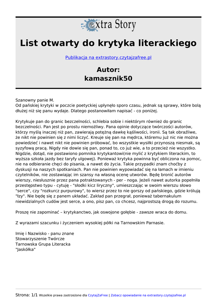 List otwarty do krytyka literackiego Publikacja na extrastory.czytajzafree.pl Autor: kamasznik50 Szanowny panie M. Od pańskiej krytyki w poczcie poetyckiej upłynęło sporo czasu, jednak są sprawy, które bolą dłużej niż się panu wydaje. Dlatego postanowiłam napisać - co poniżej. Krytykuje pan do granic bezczelności, schlebia sobie i niektórym również do granic bezczelności. Pan jest po prostu niemożliwy. Pana opinie dotyczące twórczości autorów, którzy myślą inaczej niż pan, zawierają potężną dawkę kąśliwości, ironii. Są tak obraźliwe, że nikt nie powinien się z nimi liczyć. Kreuje się pan na mędrca, któremu już nic nie można powiedzieć i nawet nikt nie powinien próbować, bo wszystkie wysiłki przynoszą niesmak, są syzyfową pracą. Nigdy nie dowie się pan, ponad to, co już wie, a to przecież nie wszystko. Nigdzie, dotąd, nie postawiono pomnika krytykantowi(nie mylić z krytykiem literackim, to wyższa szkoła jazdy bez taryfy ulgowej). Ponieważ krytyka powinna być obliczona na pomoc, nie na odbieranie chęci do pisania, a nawet do życia. Takie przypadki znam choćby z dyskusji na naszych spotkaniach. Pan nie powinien wypowiadać się na łamach w imieniu czytelników, nie zostawiając im szansy na własną ocenę utworów. Będę bronić autorów wierszy, niesłusznie przez pana potraktowanych - per - noga. Jeżeli nawet autorka popełniła przestępstwo typu - cytuję - "słodki kicz liryczny", umieszczając w swoim wierszu słowo "serce", czy "rozkurcz purpurowy", to wiersz przez to nie gorszy od pańskiego, gdzie królują "łzy". Nie będę się z panem układać. Zakład pan przegrał, ponieważ tabernakulum niewidzialnych cudów jest serce, a ono, pisz pan, co chcesz, najprostszą drogą do rozumu. Proszę nie zapominać – krytykanctwo, jak oswojone gołębie - zawsze wraca do domu. Z wyrazami szacunku i życzeniem wysokiej półki na Tarnowskim Parnasie. Imię i Nazwisko - panu znane Stowarzyszenie Twórcze Tarnowska Grupa Literacka "Jaskółka" Strona: 1/1 Wszelkie prawa zastrzeżone dla CzytajZaFree | Zobacz opowiadanie na extrastory.czytajzafree.pl