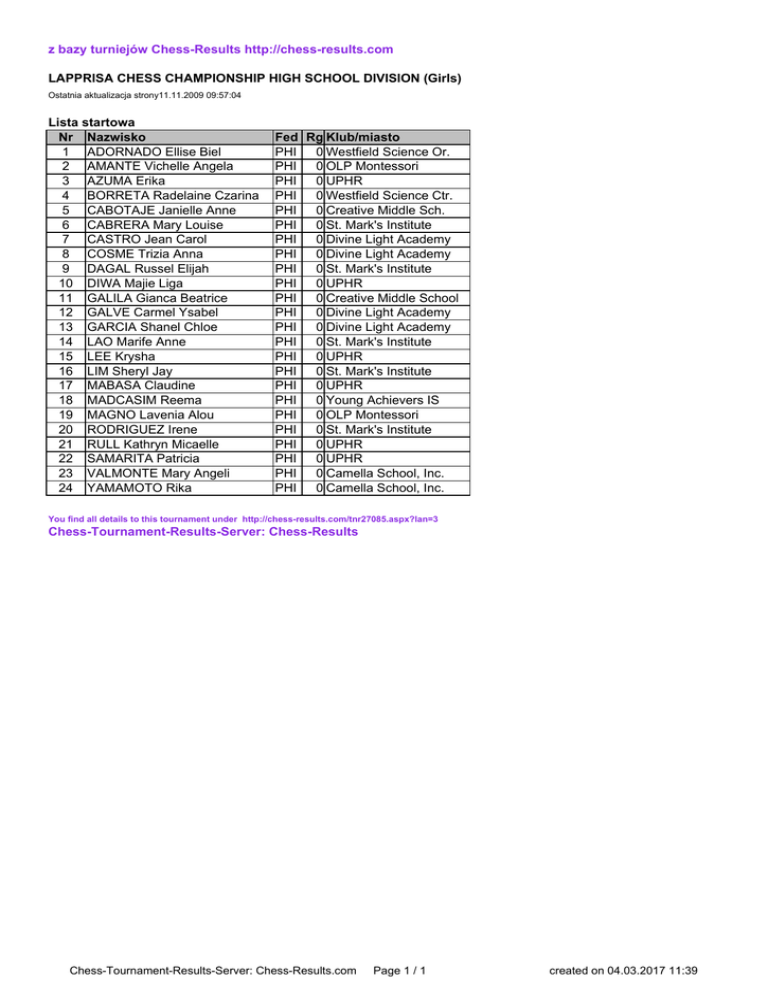 z bazy turniejów Chess-Results http://chess-results.com LAPPRISA CHESS CHAMPIONSHIP HIGH SCHOOL DIVISION (Girls) Ostatnia aktualizacja strony11.11.2009 09:57:04 Lista startowa Nr Nazwisko 1 ADORNADO Ellise Biel 2 AMANTE Vichelle Angela 3 AZUMA Erika 4 BORRETA Radelaine Czarina 5 CABOTAJE Janielle Anne 6 CABRERA Mary Louise 7 CASTRO Jean Carol 8 COSME Trizia Anna 9 DAGAL Russel Elijah 10 DIWA Majie Liga 11 GALILA Gianca Beatrice 12 GALVE Carmel Ysabel 13 GARCIA Shanel Chloe 14 LAO Marife Anne 15 LEE Krysha 16 LIM Sheryl Jay 17 MABASA Claudine 18 MADCASIM Reema 19 MAGNO Lavenia Alou 20 RODRIGUEZ Irene 21 RULL Kathryn Micaelle 22 SAMARITA Patricia 23 VALMONTE Mary Angeli 24 YAMAMOTO Rika Fed Rg Klub/miasto PHI 0 Westfield Science Or. PHI 0 OLP Montessori PHI 0 UPHR PHI 0 Westfield Science Ctr. PHI 0 Creative Middle Sch. PHI 0 St. Mark's Institute PHI 0 Divine Light Academy PHI 0 Divine Light Academy PHI 0 St. Mark's Institute PHI 0 UPHR PHI 0 Creative Middle School PHI 0 Divine Light Academy PHI 0 Divine Light Academy PHI 0 St. Mark's Institute PHI 0 UPHR PHI 0 St. Mark's Institute PHI 0 UPHR PHI 0 Young Achievers IS PHI 0 OLP Montessori PHI 0 St. Mark's Institute PHI 0 UPHR PHI 0 UPHR PHI 0 Camella School, Inc. PHI 0 Camella School, Inc. You find all details to this tournament under http://chess-results.com/tnr27085.aspx?lan=3 Chess-Tournament-Results-Server: Chess-Results Chess-Tournament-Results-Server: Chess-Results.com Page 1 / 1 created on 04.03.2017 11:39