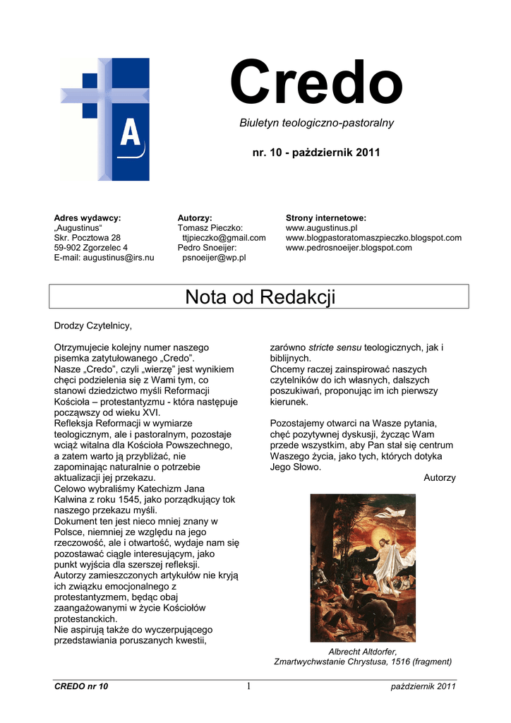 Credo Biuletyn teologiczno-pastoralny nr. 10 - pażdziernik 2011 Adres wydawcy: „Augustinus“ Skr. Pocztowa 28 59-902 Zgorzelec 4 E-mail: [email protected] Autorzy: Tomasz Pieczko: [email protected] Pedro Snoeijer: [email protected] Strony internetowe: www.augustinus.pl www.blogpastoratomaszpieczko.blogspot.com www.pedrosnoeijer.blogspot.com Nota od Redakcji Drodzy Czytelnicy, zarówno stricte sensu teologicznych, jak i biblijnych. Chcemy raczej zainspirować naszych czytelników do ich własnych, dalszych poszukiwań, proponując im ich pierwszy kierunek. Otrzymujecie kolejny numer naszego pisemka zatytułowanego „Credo”. Nasze „Credo”, czyli „wierzę” jest wynikiem chęci podzielenia się z Wami tym, co stanowi dziedzictwo myśli Reformacji Kościoła – protestantyzmu - która następuje począwszy od wieku XVI. Refleksja Reformacji w wymiarze teologicznym, ale i pastoralnym, pozostaje wciąż witalna dla Kościoła Powszechnego, a zatem warto ją przybliżać, nie zapominając naturalnie o potrzebie aktualizacji jej przekazu. Celowo wybraliśmy Katechizm Jana Kalwina z roku 1545, jako porządkujący tok naszego przekazu myśli. Dokument ten jest nieco mniej znany w Polsce, niemniej ze względu na jego rzeczowość, ale i otwartość, wydaje nam się pozostawać ciągle interesującym, jako punkt wyjścia dla szerszej refleksji. Autorzy zamieszczonych artykułów nie kryją ich związku emocjonalnego z protestantyzmem, będąc obaj zaangażowanymi w życie Kościołów protestanckich. Nie aspirują także do wyczerpującego przedstawiania poruszanych kwestii, Pozostajemy otwarci na Wasze pytania, chęć pozytywnej dyskusji, życząc Wam przede wszystkim, aby Pan stał się centrum Waszego życia, jako tych, których dotyka Jego Słowo. Autorzy Albrecht Altdorfer, Zmartwychwstanie Chrystusa, 1516 (fragment) CREDO nr 10 1 październik 2011 Katechizm Genewski 1545 - Niedziela X Dziesiąta niedziela 65. Minister: Co oznaczają słowa: zstąpił do piekieł? Dziecko: To, że nie tylko wycierpiał śmierć naturalną, która jest rozdzieleniem ciała i duszy, ale także i to, że dusza Jego została ściśnięta niezwykłą trwogą, którą święty Piotr nazywa bólami śmierci (Dzieje Apostolskie 2,24). 66. Minister: Z jakiego powodu to się stało, i dlaczego? Dziecko: Ponieważ skoro stanął przed Bogiem, aby uczynić to w imię grzeszników, trzeba było, aby odczuł ten straszny niepokój w swoim sumieniu, jakby się oddalił od Boga i jakby sam Bóg był nań zagniewany. Będąc w tej głębi zakrzyknął: „Boże mój, Boże mój, czemu mnie opuściłeś?” (Ew. wg Mateusza 27,46; Ew. wg Marka 15,34). Inferno (ilustracja do Boskiej Komedii Dantego), Bartolomeo di Fruosino, 1430-35 69. Minister: Ale jakże to może być, że Jezus Chrystus, który jest zbawieniem świata, został tak skazany? Dziecko: Został, ale w skazaniu tym nie pozostał. Tak, odczuł tę potworność, jak już to powiedzieliśmy, ale nie został przez nią zwyciężony. Walczył przeciw mocy piekieł, aby ją złamać i zniszczyć. 67. Minister: Bóg zapłonął przeciw Niemu gniewem? Dziecko: Nie, ale trzeba było, aby ogarnął Go taki smutek, aby potwierdzić to, co zostało przepowiedziane przez proroka Izajasza: „on zraniony jest za występki nasze, starty za winy nasze” (Izajasz 53,5; 1 Piotra 2,24). 70. Minister: W tym widzimy różnicę w męce, którą On wycierpiał, z tą, jaką czują grzesznicy, których Bóg karze w swoim gniewie. Ponieważ to, co dla Niego było czasowe, jest dla innych wieczne, i to co jest dla Niego ukłuciem ościenia, dla innych jest raną śmiertelną. Dziecko: Tak właśnie to rozumiem, ponieważ Jezusa Chrystusa Bóg nie pozostawił w beznadziei pośród tylu cierpień. Ale grzesznicy, których Bóg potępia popadają w beznadzieję i buntują się przeciw Niemu, aż do bluźnierstwa. 68. Minister: Ale jakże to mógł On być przejęty takim zmartwieniem, jakby był przez Boga opuszczony, On, który był sam Bogiem? Dziecko: Należy rozumieć, że to zgodnie ze swoją naturą ludzką został doprowadzony do takiego stanu, i aby tego dostąpić Jego boskość na krótki czas jakby się ukryła, to znaczy nie okazywała swojej mocy. Tł. Tomasz Pieczko CREDO nr 10 2 październik 2011 List Pawła Apostoła do Rzymian 3,21-26 21 Teraz zaś niezależnie od Prawa została objawiona sprawiedliwość Boga, poświadczona przez Prawo i Proroków, 22 sprawiedliwość Boga przez wiarę w Jezusa Chrystusa, dla wszystkich wierzących. Nie ma bowiem różnicy, 23 ponieważ wszyscy zgrzeszyli i są pozbawieni chwały Boga, 24 a zostali usprawiedliwieni darmo, Jego łaską, przez odkupienie w Jezusie Chrystusie. 25 Jego to Bóg ustanowił narzędziem przebłagania przez wiarę, dzięki Jego krwi, żeby okazać swoją sprawiedliwość przez odpuszczenie grzechów, które zaistniały wcześniej, 26 w czasie pobłażliwości Boga, i żeby okazać swoją sprawiedliwość teraz, w tym czasie, aby okazało się, że On sam jest sprawiedliwy i usprawiedliwia tego, kto wierzy w Jezusa. chwały Bożej (por. np. Izajasz 35,2; Rzymian 8,18; Filippian 3,21: i inni). Być w chwale Bożej, oznacza być jak Chrystus (Rzymian 8,29-30; Filippian 3,21). Być pozbawionym chwały Bożej, oznacza, że człowiek już nie jest taki, jak został stworzony na obraz Boga (Ks. Rodzaju / 1. Mojżeszowa 1,27). Człowiek z natury żyje w swoim grzechu oddalając się od Boga. Dlaczego tak jest? Apostoł opisał ten stan w poprzednich rozdziałach, mianowicie, człowiek jest grzeszny, zbuntował się przeciwko Bogu i chciał żyć bez Niego. Z powodu swojej świętości Bóg nie może inaczej reagować niż gniewem na grzech. Przez Prawo (Stary Testament) człowiek może poznać świętość Bożą oraz własną grzeszność. Prawo też uczy człowieka, że potrzebna jest zapłata, odbycie kary za grzech. Jednak samo Prawo ani nie pomaga ani nie umożliwia człowiekowi zbawienia, raczej pokazuje,