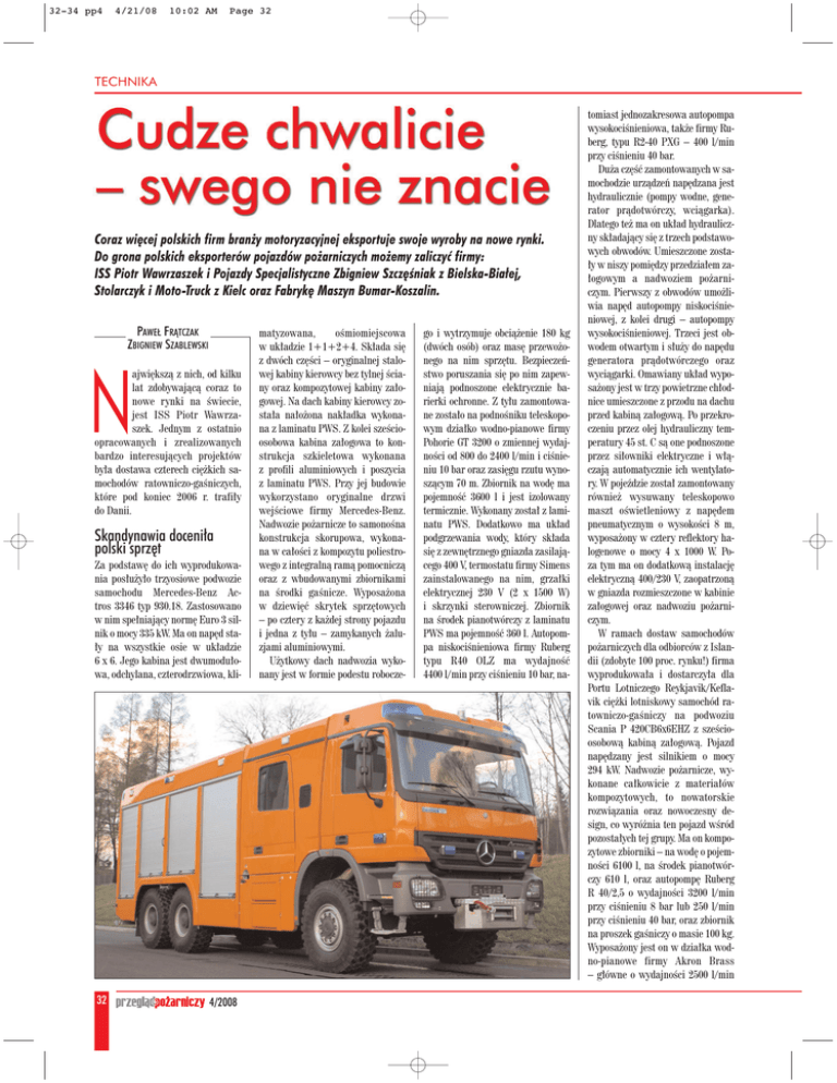 32-34 pp4 4/21/08 10:02 AM Page 32 TECHNIKA Coraz wi´cej polskich firm bran˝y motoryzacyjnej eksportuje swoje wyroby na nowe rynki. Do grona polskich eksporterów pojazdów po˝arniczych mo˝emy zaliczyç firmy: ISS Piotr Wawrzaszek i Pojazdy Specjalistyczne Zbigniew Szcz´Êniak z Bielska-Bia∏ej, Stolarczyk i Moto-Truck z Kielc oraz Fabryk´ Maszyn Bumar-Koszalin. PAWE¸ FRÑTCZAK ZBIGNIEW SZABLEWSKI N ajwi´kszà z nich, od kilku lat zdobywajàcà coraz to nowe rynki na Êwiecie, jest ISS Piotr Wawrzaszek. Jednym z ostatnio opracowanych i zrealizowanych bardzo interesujàcych projektów by∏a dostawa czterech ci´˝kich samochodów ratowniczo-gaÊniczych, które pod koniec 2006 r. trafi∏y do Danii. Skandynawia doceni∏a polski sprz´t Za podstaw´ do ich wyprodukowania pos∏u˝y∏o trzyosiowe podwozie samochodu Mercedes-Benz Actros 3346 typ 930.18. Zastosowano w nim spe∏niajàcy norm´ Euro 3 silnik o mocy 335 kW. Ma on nap´d sta∏y na wszystkie osie w uk∏adzie 6 x 6. Jego kabina jest dwumodu∏owa, odchylana, czterodrzwiowa, kli- 32 4/2008 matyzowana, oÊmiomiejscowa w uk∏adzie 1+1+2+4. Sk∏ada si´ z dwóch cz´Êci – oryginalnej stalowej kabiny kierowcy bez tylnej Êciany oraz kompozytowej kabiny za∏ogowej. Na dach kabiny kierowcy zosta∏a na∏o˝ona nak∏adka wykonana z laminatu PWS. Z kolei szeÊcioosobowa kabina za∏ogowa to konstrukcja szkieletowa wykonana z profili aluminiowych i poszycia z laminatu PWS. Przy jej budowie wykorzystano oryginalne drzwi wejÊciowe firmy Mercedes-Benz. Nadwozie po˝arnicze to samonoÊna konstrukcja skorupowa, wykonana w ca∏oÊci z kompozytu poliestrowego z integralnà ramà pomocniczà oraz z wbudowanymi zbiornikami na Êrodki gaÊnicze. Wyposa˝ona w dziewi´ç skrytek sprz´towych – po cztery z ka˝dej strony pojazdu i jedna z ty∏u – zamykanych ˝aluzjami aluminiowymi. U˝ytkowy dach nadwozia wykonany jest w formie podestu robocze- go i wytrzymuje obcià˝enie 180 kg (dwóch osób) oraz mas´ przewo˝onego na nim sprz´tu. Bezpieczeƒstwo poruszania si´ po nim zapewniajà podnoszone elektrycznie barierki ochronne. Z ty∏u zamontowane zosta∏o na podnoÊniku teleskopowym dzia∏ko wodno-pianowe firmy Pohorie GT 3200 o zmiennej wydajnoÊci od 800 do 2400 l/min i ciÊnieniu 10 bar oraz zasi´gu rzutu wynoszàcym 70 m. Zbiornik na wod´ ma pojemnoÊç 3600 l i jest izolowany termicznie. Wykonany zosta∏ z laminatu PWS. Dodatkowo ma uk∏ad podgrzewania wody, który sk∏ada si´ z zewn´trznego gniazda zasilajàcego 400 V, termostatu firmy Simens zainstalowanego na nim, grza∏ki elektrycznej 230 V (2 x 1500 W) i skrzynki sterowniczej. Zbiornik na Êrodek pianotwórczy z laminatu PWS ma pojemnoÊç 360 l. Autopompa niskociÊnieniowa firmy Ruberg typu R40 OLZ ma wydajnoÊç 4400 l/min przy ciÊnieniu 10 bar, na- tomiast jednozakresowa autopompa wysokociÊnieniowa, tak˝e firmy Ruberg, typu R2-40 PXG – 400 l/min przy ciÊnieniu 40 bar. Du˝a cz´Êç zamontowanych w samochodzie urzàdzeƒ nap´dzana jest hydraulicznie (pompy wodne, generator pràdotwórczy, wciàgarka). Dlatego te˝ ma on uk∏ad hydrauliczny sk∏adajàcy si´ z trzech podstawowych obwodów. Umieszczone zosta∏y w niszy pomi´dzy przedzia∏em za∏ogowym a nadwoziem po˝arniczym. Pierwszy z obwodów umo˝liwia nap´d autopompy niskociÊnieniowej, z kolei drugi – autopompy wysokociÊnieniowej. Trzeci jest obwodem otwartym i s∏u˝y do nap´du generatora pràdotwórczego oraz wyciàgarki. Omawiany uk∏ad wyposa˝ony jest w trzy powietrzne ch∏odnice umieszczone z przodu na dachu przed kabinà za∏ogowà. Po przekroczeniu przez olej hydrauliczny temperatury 45 st. C sà one podnoszone przez si∏owniki elektryczne i w∏àczajà automatycznie ich wentylatory. W pojeêdzie zosta∏ zamontowany równie˝ wysuwany teleskopowo maszt oÊwietleniowy z nap´dem pneumatycznym o wysokoÊci 8 m, wyposa˝ony w cztery reflektory halogenowe o mocy 4 x 1000 W. Poza tym ma on dodatkowà instalacj´ elektrycznà 400/230 V, zaopatrzonà w gniazda rozmieszczone w kabinie za∏ogowej oraz nadwoziu po˝arniczym. W ramach dostaw samochodów po˝arniczych dla odbiorców z Islandii (zdobyte 100 proc. rynku!) firma wyprodukowa∏a i dostarczy∏a dla Portu Lotniczego Reykjavik/Keflavik ci´˝ki lotniskowy samochód ratowniczo-gaÊniczy na podwoziu Scania P 420CB6x6EHZ z szeÊcioosobowà kabinà za∏ogowà. Pojazd nap´dzany jest silnikiem o mocy 294 kW. Nadwozie po˝arnicze, wykonane ca∏kowicie z materia∏ów kompozytowych, to nowatorskie rozwiàzania oraz nowoczesny design, co wyró˝nia ten pojazd wÊród pozosta∏ych tej grupy. Ma on kompozytowe zbiorniki – na wod´ o pojemnoÊci 6100 l, na Êrodek pianotwórczy 610 l, oraz autopomp´ Ruberg R 40/2,5 o wydajnoÊci 3200 l/min przy ciÊnieniu 8 bar lub 250 l/min przy ciÊnieniu 40 bar, oraz zbiornik na proszek gaÊniczy o masie 100 kg. Wyposa˝ony jest on w dzia∏ka wodno-pianowe firmy Akron Brass – g∏ówne o wydajnoÊci 2500 l/min 32-34 pp4 4/21/08 10:02 AM Page 33 TECHNIKA i zderzakowe o wydajnoÊci od 800 do 1000 l/min, a tak˝e zraszacze. Pojazd zosta∏ opracowany i przygotowany z myÊlà o specyficznym i bardzo wymagajàcym rynku islandzkim, uwzgl´dnia wszelkie obowiàzujàce normy i standardy I. C. A. O. Nie mniej ciekawym rozwiàzaniem jest opracowany przy wspó∏pracy Volvo Truck Corporation i Autokaross Rescue Systems ci´˝ki lotniskowy samochód ratowniczo-gaÊniczy (FMV) przeznaczony do eksploatacji przez Szwedzkie Si∏y Powietrzne na wojskowych lotniskach, na których stacjonujà samoloty myÊliwskie JAS 39 Grippen. Pierwszy z pojazdów zosta∏ dostarczony do odbiorcy w listopadzie 2005 r. Obecnie w bielskiej firmie powstaje kolejna partia samochodów. Zabudowywane sà one na specjalnie przygotowanym trzy-osiowym podwoziu Volvo FM 13 (6 x 6). Nap´dzane jest silnikiem spe∏niajàcym norm´ Euro 4, o mocy 368 kW. Kabina pojazdu to obszerna za∏ogowa, jednomodu∏owa, czterodrzwiowa