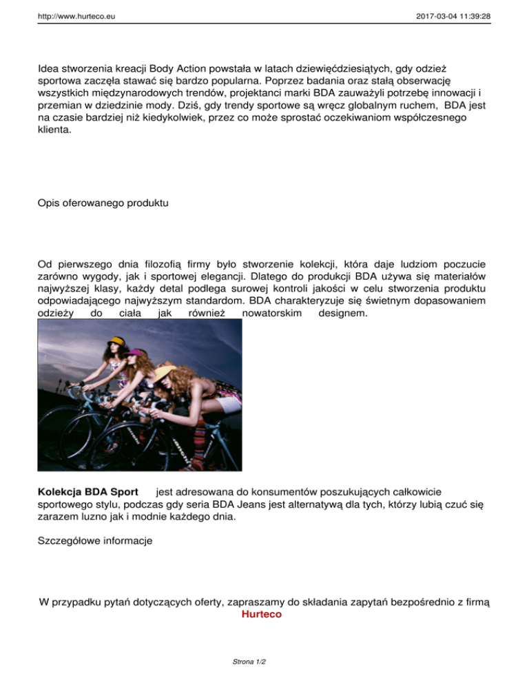 http://www.hurteco.eu 2017-03-04 11:39:28 Idea stworzenia kreacji Body Action powstała w latach dziewięćdziesiątych, gdy odzież sportowa zaczęła stawać się bardzo popularna. Poprzez badania oraz stałą obserwację wszystkich międzynarodowych trendów, projektanci marki BDA zauważyli potrzebę innowacji i przemian w dziedzinie mody. Dziś, gdy trendy sportowe są wręcz globalnym ruchem, BDA jest na czasie bardziej niż kiedykolwiek, przez co może sprostać oczekiwaniom współczesnego klienta. Opis oferowanego produktu Od pierwszego dnia filozofią firmy było stworzenie kolekcji, która daje ludziom poczucie zarówno wygody, jak i sportowej elegancji. Dlatego do produkcji BDA używa się materiałów najwyższej klasy, każdy detal podlega surowej kontroli jakości w celu stworzenia produktu odpowiadającego najwyższym standardom. BDA charakteryzuje się świetnym dopasowaniem odzieży do ciała jak również nowatorskim designem. Kolekcja BDA Sport jest adresowana do konsumentów poszukujących całkowicie sportowego stylu, podczas gdy seria BDA Jeans jest alternatywą dla tych, którzy lubią czuć się zarazem luzno jak i modnie każdego dnia. Szczegółowe informacje W przypadku pytań dotyczących oferty, zapraszamy do składania zapytań bezpośrednio z firmą Hurteco Strona 1/2 http://www.hurteco.eu e-mail: BIURO: [email protected] tel: +48 660 401 421 2017-03-04 11:39:28 SPRZEDAŻ: e-mail: [email protected] tel: +48 604 231 247(english speaking) W związku z dynamicznie zmieniającymi się cenami prosimy podać adres email, na który mamy odesłać najbardziej aktualny cennik naszej oferty: %formMail:[email protected]% Strona 2/2