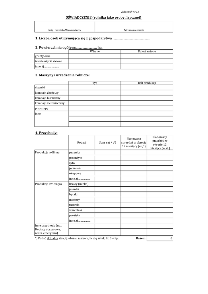 Załącznik nr 1b OŚWIADCZENIE (rolnika jako osoby fizycznej) Imię i nazwisko Wnioskodawcy Adres zamieszkania 1. Liczba osób utrzymująca się z gospodarstwa ............................................. 2. Powierzchnia ogółem:......................... ha. Własne Dzierżawione Typ Rok produkcji grunty orne trwałe użytki zielone inne, tj. ...................... 3. Maszyny i urządzenia rolnicze: ciągniki kombajn zbożowy kombajn buraczany kombajn ziemniaczany przyczepy inne 4. Przychody: Rodzaj Produkcja roślinna Stan szt / t*) Planowana sprzedaż w okresie 12 miesięcy (szt/t) Planowany przychód w okresie 12 miesięcy (w zł.) pszenica pszenżyto żyto jęczmień okopowe inne, tj................... Produkcja zwierzęca krowy (mleko) jałówki byczki maciory tuczniki warchlaki prosięta inne, tj.................... Inne przychody (np.. Dopłaty obszarowe, renta, emerytura) *) Podać aktualny stan, tj. obszar zasiewu, liczbę sztuk, litrów itp.. Razem: 0 5. Koszty: Planowane koszty w okresie 12 miesięcy (w zł.) Ilość Zakup pasz Zakup nawozów Zakup środków ochrony roślin Zakup paliwa, oleji, smarów Energia, opał, woda Naprawy i remonty Czynsze dzierżawne Odsetki od kredytów Podatki, ubezpieczenia Pozostałe koszty (KRUS, inne) Razem: Planowany dochód w zł. (4-5) 0 Średni miesięczy dochód netto (planowany) 0 0 7. Łączne dochody z ostatnich 12 miesięcy wynosiły …………………………………… zł. 8. Ubezpieczenia Rodzaj ubezpieczenia Firma ubezpieczająca Okres ważności ubezpieczenia Wartość ubezpieczenia Niniejsze oświadczenie składam świadomy/a odpowiedzialności karnej, wynikającej z art. 297 §1 ustawy z dnia 06.06.1997r. Kodeks karny (Dz.U. Nr 88, poz. 553 z późn. zm.), po zapoznaniu się z jego brzmieniem. Art. 297 § 1 Kodeksu karnego Kto, w celu uzyskania dla siebie lub kogo innego, od banku lub jednostki organizacyjnej prowadzącej podobną działalność gospodarczą na podstawie ustawy albo od organu lub instytucji dysponujących środkami publicznymi - kredytu, pożyczki pieniężnej, poręczenia, gwarancji, akredytywy, dotacji, subwencji, potwierdzenia przez bank zobowiązania wynikającego z poręczenia lub z gwarancji lub podobnego świadczenia pieniężnego na określony cel gospodarczy, elektronicznego instrumentu płatniczego lub zamówienia publicznego, przedkłada podrobiony, przerobiony, poświadczający nieprawdę albo nierzetelny dokument albo nierzetelne, pisemne oświadczenie dotyczące okoliczności o istotnym znaczeniu dla uzyskania wymienionego wsparcia finansowego, instrumentu płatniczego lub zamówienia, podlega karze pozbawienia wolności od 3 miesięcy do lat 5. Upoważniam Bank Spółdzielczy w Miliczu do sprawdzenia wiarygodności informacji zawartych w powyższym załączniku. Podpis Wnioskodawcy podpis i stempel pracownika Banku potwierdzajacego własnoręczność podpisu Wnioskodawcy Miejscowość/data