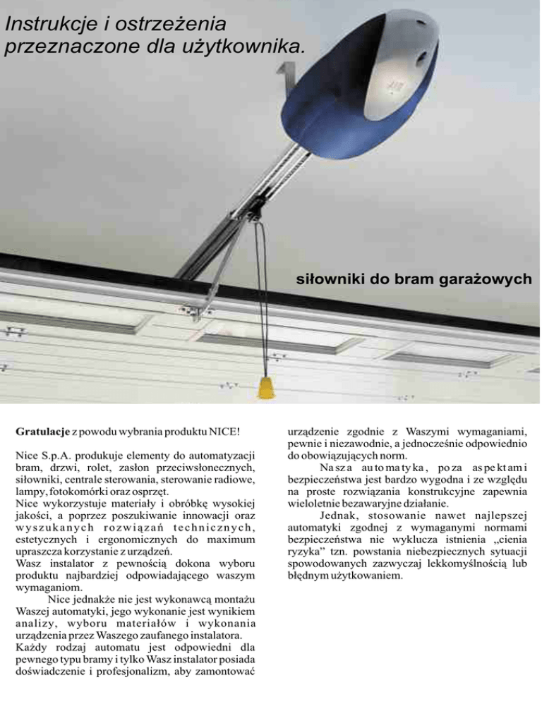 Instrukcje i ostrze¿enia przeznaczone dla u¿ytkownika. si³owniki do bram gara¿owych Gratulacje z powodu wybrania produktu NICE! Nice S.p.A. produkuje elementy do automatyzacji bram, drzwi, rolet, zas³on przeciws³onecznych, si³owniki, centrale sterowania, sterowanie radiowe, lampy, fotokomórki oraz osprzêt. Nice wykorzystuje materia³y i obróbkê wysokiej jakoœci, a poprzez poszukiwanie innowacji oraz wyszukanych rozwi¹zañ technicznych, estetycznych i ergonomicznych do maximum upraszcza korzystanie z urz¹dzeñ. Wasz instalator z pewnoœci¹ dokona wyboru produktu najbardziej odpowiadaj¹cego waszym wymaganiom. Nice jednak¿e nie jest wykonawc¹ monta¿u Waszej automatyki, jego wykonanie jest wynikiem analizy, wyboru materia³ów i wykonania urz¹dzenia przez Waszego zaufanego instalatora. Ka¿dy rodzaj automatu jest odpowiedni dla pewnego typu bramy i tylko Wasz instalator posiada doœwiadczenie i profesjonalizm, aby zamontowaæ urz¹dzenie zgodnie z Waszymi wymaganiami, pewnie i niezawodnie, a jednoczeœnie odpowiednio do obowi¹zuj¹cych norm. Na sz a au to ma ty ka , po za as pe kt am i bezpieczeñstwa jest bardzo wygodna i ze wzglêdu na proste rozwi¹zania konstrukcyjne zapewnia wieloletnie bezawaryjne dzia³anie. Jednak, stosowanie nawet najlepszej automatyki zgodnej z wymaganymi normami bezpieczeñstwa nie wyklucza istnienia „cienia ryzyka” tzn. powstania niebezpiecznych sytuacji spowodowanych zazwyczaj lekkomyœlnoœci¹ lub b³êdnym u¿ytkowaniem. Aby unikn¹æ takich „niespodzianek” pragniemy udzieliæ Wam kilku niezbêdnych rad: Przed pierwszym u¿yciem automatu nale¿y zastosowaæ siê do zaleceñ instalatora i poœwiêciæ kilka minut na lekturê dostarczonej przez niego instrukcji obs³ugi i ostrze¿eñ dla u¿ytkownika; · Wasz automat jest urz¹dzeniem bardzo dok³adnie wykonuj¹cym Wasze polecenia; dlatego te¿ lekkomyœlne lub niew³aœciwe u¿ycie go mo¿e staæ siê niebezpieczne; Nie uruchamiajcie automatyki, jeœli w zasiêgu jej dzia³ania znajduj¹ siê osoby, zwierzêta lub rzeczy; · Dzieci: urz¹dzenie gwarantuje wysoki stopieñ bezpieczeñstwa, zawiera systemy nie pozwalaj¹ce na uruchomienie, w przypadku obecnoœci osób lub rzeczy. Roztropnym bêdzie jednak zabroniæ dzieciom zabawy w pobli¿u bramy oraz nie zostawiaæ pilota w ich zasiêgu, aby unikn¹æ przypadkowego uruchomienia to nie jest zabawka! · Anomalie: jeœli zauwa¿ycie jakiekolwiek nieprawid³owoœci w dzia³aniu automatu, natychmiast od³¹czcie zasilanie oraz odblokujcie mechanizm rêczny. Nie próbujcie sami napraw, ¿¹dajcie ich od Waszego zaufanego instalatora: w miêdzyczasie, po odblokowaniu mechanizmu rêcznego, urz¹dzenie mo¿e dzia³aæ rêcznie · Czynnoœci konserwacyjne: Jak wszystkie urz¹dzenia, aby Wasz automat móg³ jak najd³u¿ej funkcjonowaæ bezawaryjnie i bezpiecznie, wymaga on okresowych czynnoœci konserwacyjnych. Uzgodnijcie z Waszym instalatorem okresowy program tych czynnoœci. Nice radzi, przy standardowym, domowym u¿ytkowaniu, dokonywanie przegl¹dów co 6 miesiêcy, okres ten mo¿e siê jednak zmieniaæ, w zale¿noœci od intensywnoœci u¿ytkowania. Jakakolwiek interwencja kontrolna, serwisowa, czy naprawcza musi byæ przeprowadzana przez wykwalifikowany personel. · Tak¿e w przypadku, gdy jesteœcie pewni swoich umiejêtnoœci techniczno-elektronicznych, nie modyfikujcie urz¹dzenia i parametrów jego oprogramowania,odpowiedzialnoœæ za to spoczywa na Waszym instalatorze. · Koñcowa kolaudacja(?), serwisy okresowe i ewentualne naprawy musz¹ byæ dokumentowane przez wykonuj¹cego, a dokumenty przechowywane u w³aœciciela urz¹dzenia. · Zbyt. Po ca³kowitym zu¿yciu siê automatyki, up³ynnienie powinno zostaæ wykonane przez osoby wykwalifikowane, a materia³y poddane recyklingowi lub zbyte zgodnie z aktualnie obowi¹zuj¹cymi przepisami. · W przypadku zepsucia siê lub braku zasilania. W oczekiwaniu na interwencjê waszego instalatora (lub powrót dop³ywu energii elektr., jeœli urz¹dzenie nie jest zaopatrzone w bateria rezerwowe), automat mo¿e dzia³aæ, bêd¹c otwierany rêcznie. By przestawiæ go na dzia³anie rêczne, nale¿y wykonaæ odblokowanie rêczne: czynnoœæ ta jest jedyn¹ ingerencj¹, która mo¿e byæ wykonywana przez u¿ytkownika automatyki. Funkcja ta jest szczególnie dopracowana przez Nice tak, aby zagwarantowaæ Wam, jak naj³atwiejsze u¿ytkowanie urz¹dzenia, bez wykorzystywania jakichkolwiek narzêdzi, czy wysi³ku fizycznego. W przypadku braku zasilania lub awarii si³ownika nale¿y: 1. poci¹gn¹æ linkê wysprzêglania si³ownika (pionowo w dó³) 2. rêcznie podnieœæ bramê 3. rêczne zamkniêcie bramy spowoduje ponowne zasprzêglenie si³ownika W przypadku gdy nie ma osobnego wejœcia do gara¿u nale¿y zaopatrzyæ siê w system wysprzêglania si³ownika od zewn¹trz SPA2. O te elementy pytaj swojego sprzedawcê. Wa¿ne: Jeœli Wasze urz¹dzenie, wyposa¿one w sterowanie radiowe, zaczyna stwarzaæ problemy, mo¿e to byæ spowodowane wyczerpaniem siê baterii (zale¿nie do typu mo¿e ona wyczerpaæ siê po kilku miesi¹cach lub po dwóch /trzech latach). Mo¿na to stwierdziæ na podstawie obserwacji intensywnoœci œwiate³ka potwierdzaj¹cego transmisjê. Zanim wezwiecie instalatora spróbujcie zamieniæ bateriê z drugim przekaŸnikiem. Jeœli problem tkwi w wy³adowanej baterii, wystarczy wymieniæ ja na now¹ tego samego typu. Jesteœcie zadowoleni? W przypadku, gdybyœcie chcieli zainstalowaæ sobie dodatkowy automat, udajcie siê do tego samego instalatora, Nice zaœ ze swojej strony zapewni Wam najnowoczeœniejsze na rynku ,bezawaryjne i kompatybilne produkty wraz z konsultacj¹ specjalisty. Dziêkujemy Wam za przeczytanie tych zaleceñ oraz ¿yczymy zadowolenia z Waszego nowego automatu: jeœli w przysz³oœci bêdzie potrzebowaæ nowego urz¹dzenia, zapraszamy do nas za poœrednictwem instalatora, którego ju¿ raz obdarzyliœcie Waszym zaufaniem.