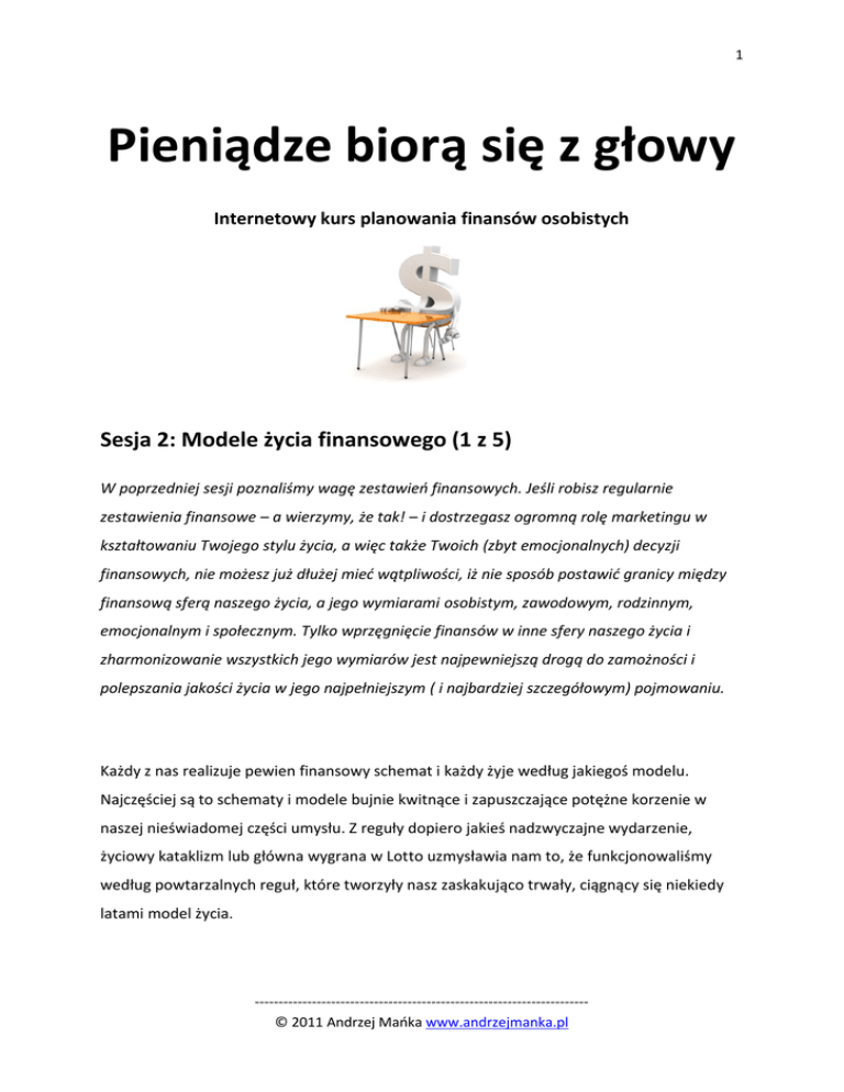 1 Pieniądze biorą się z głowy Internetowy kurs planowania finansów osobistych Sesja 2: Modele życia finansowego (1 z 5) W poprzedniej sesji poznaliśmy wagę zestawieo finansowych. Jeśli robisz regularnie zestawienia finansowe – a wierzymy, że tak! – i dostrzegasz ogromną rolę marketingu w kształtowaniu Twojego stylu życia, a więc także Twoich (zbyt emocjonalnych) decyzji finansowych, nie możesz już dłużej mied wątpliwości, iż nie sposób postawid granicy między finansową sferą naszego życia, a jego wymiarami osobistym, zawodowym, rodzinnym, emocjonalnym i społecznym. Tylko wprzęgnięcie finansów w inne sfery naszego życia i zharmonizowanie wszystkich jego wymiarów jest najpewniejszą drogą do zamożności i polepszania jakości życia w jego najpełniejszym ( i najbardziej szczegółowym) pojmowaniu. Każdy z nas realizuje pewien finansowy schemat i każdy żyje według jakiegoś modelu. Najczęściej są to schematy i modele bujnie kwitnące i zapuszczające potężne korzenie w naszej nieświadomej części umysłu. Z reguły dopiero jakieś nadzwyczajne wydarzenie, życiowy kataklizm lub główna wygrana w Lotto uzmysławia nam to, że funkcjonowaliśmy według powtarzalnych reguł, które tworzyły nasz zaskakująco trwały, ciągnący się niekiedy latami model życia. ---------------------------------------------------------------------© 2011 Andrzej Maoka www.andrzejmanka.pl 2 Wykonaj proszę 1 zadanie: Dlaczego „wygraną w Lotto” wymieniliśmy jednym tchem z „życiowym kataklizmem”? Czy wiesz dlaczego dla ponad 90% z nas wygrana na loterii w perspektywie 2-3 lat stanie się jednym z największych nieszczęśd, jakie mogło się w życiu wydarzyd? Tymczasem wygrana 1, 2, czy 6 milionów w Lotto jest promowana przez media jako „Uśmiech Losu”, „Wielki traf” i spełnienie najwspanialszych marzeo, jakie tylko można sobie wyobrazid. (Jeżeli nie znasz odpowiedzi na to pytanie zajrzyj do naszego bloga na www.poradnikofinansach.pl – i znajdź felieton poświęcony przekleostwu wielkich wygranych na loterii pieniężnej. Wszyscy dobrze znamy taki oto normalny model życia. Wstaję (bardzo niechętnie) o 6 rano. Wymieniam (zdawkowe) uprzejmości z żoną – chyba, że to początek małżeostwa, więc ranek może jeszcze przynosid radośd i oświetlad resztę dnia blaskiem miłości. Co najmniej godzinę grzęznę w korkach słuchając serwisów radiowych o politycznych waśniach, katastrofach lotniczych, zamachach terrorystycznych, bankructwach i czwartym w tym roku romansie żony znanego aktora. Potem odgrywam swoją zawodową rolę przez 8 godzin spędzonych (w pracy) tylko po to, by jak najłatwiej dożeglowad do bezpiecznej przystani weekendu. Dopinguje mnie w tym większośd komercyjnych stacji radiowych, które podtrzymują nas w przekonaniu, że prawdziwe życie trwa tylko od piątkowego popołudnia do niedzielnego wieczoru, zaś reszta tygodnia to wrogi naturze ludzkiej przymusowy obóz pracy. Następnie powrót do domu w korkach (razem z tysiącami mnie podobnych). W domu browar (lub więcej niż jeden) i film (sensacyjny). W taki model życia jest wpisany bardzo często taki schemat finansowy. Zarabiam – narzekam, że za mało – wydaję – Zarabiam – narzekam, że za mało – biorę kredyt – wydaję – wydaję jeszcze, więcej niż mam - Zarabiam – narzekam, że za mało – wydaję – wydaję ---------------------------------------------------------------------© 2011 Andrzej Maoka www.andrzejmanka.pl 3 jeszcze, więcej niż mam – biorę kolejny kredyt, bo nie ma za co spłacad poprzedniego – Zarabiam itd. Taki model życia jest na pewno zbyt uproszczony i nadmiernie przerysowany. Ale prawdopodobnie większośd z nas odnajdzie w nim do pewnego stopnia siebie - i nasz świat (który wszak sami stwarzamy i w każdej chwili decydujemy o tym, jaki jest!). Gdyby ten problem sprowadzid do prostego wyobrażenia graficznego będzie on wyglądał tak: Nasze umysły są pełne schematów i stereotypów, które determinują postrzeganie i ocenę świata. To, co dzieje się w naszych głowach warunkuje decyzje, które podejmujemy. Decyzje determinują działanie, zaś jego rezultaty potwierdzają nasze stereotypy myślowe – i błędne koło toczy się dalej. Na nasze nieszczęście nie mamy pojęcia, że myślimy i działamy według utrwalanych latami rutyny bezrefleksyjnych wzorów, schematów i modeli KONSUMPCYJNYCH. Co gorsza – uważamy, że postępujemy normalnie, racjonalnie i odpowiedzialnie. Powiedzieliśmy już, że przerwad to nieświadome błędne koło może nieoczekiwane zdarzenie, które jest w stanie wyrwad nas z błogiego letargu. Musi byd ona jednak naprawdę silne i dramatyczne! Jeśli takie nie jest, zachowujemy się mniej więcej jak pies w zasłyszanym na „Seminarium dla inwestorów w nieruchomości” dowcipie (opowiedzianym przez współtwórcę sukcesu tego seminarium, wytrawnego trenera, Franciszka Staniszewskiego). ---------------------------------------------------------------------© 2011 Andrzej Maoka www.andrzejmanka.pl 4 Spotyka się dwóch znajomych. Jeden z nich wyszedł na spacer z psem, który teraz siedzi i wyje. - Dlaczego twój pies tak wyje? – pyta mężczyzna patrząc ze współczuciem na nieszczęśliwego zwierzaka. - Bo siedzi na gwoździu – odpowiada właściciel psa. - To dlaczego nie wstanie? - Widocznie za słabo go uwiera. Z ludźmi bywa podobnie. Nasze życie może byd naprawdę nieznośne, ale nie na tyle, by chciało nam się wstad i coś z nim zrobid. Dlatego potrzebne są jak najsilniejsze bodźce - albo sumienne i niezłomne poszukiwania. Znam osobiście co najmniej sześcioro ludzi, którzy po przeczytaniu książki „Bogaty ojciec, biedny ojciec” Roberta Kiyosaki nie byli już nigdy więcej w stanie wrócid do tzw. normalnego życia zawodowego. Bo ta książka „wywróciła im życie do góry nogami”. Wszyscy z nich to dzisiaj przedsiębiorcy, inw