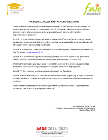 JAK I GDZIE ZNALEŹĆ PARTNERA DO PROJEKTU? Znalezienie wartościowego partnera do planowanego przedsięwzięcia projektowego to bardzo ważny etap działań przygotowawczych. W przypadku gdy znamy potencjalnego partnera mamy ułatwione zadanie. Co w przypadku, gdy sami musimy znaleźć współrealizatora projektu? Sposób I: Czasami instytucja zarządzająca pomaga znaleźć partnerów do projektu (punkt kontaktowy programu grantowego) jest to możliwe np. w przypadku programu Europa dla Obywateli. Warto sprawdzić tę możliwość. Sposób II: Korzystamy z międzynarodowych portali ułatwiających nawiązanie kontaktów np. sieć Eurodesk – www.eurodesk.pl. Sposób III: Korzystamy z wyspecjalizowanego portalu w danym obszarze np. platforma EPALE - na rzecz uczenia się dorosłych w Europie, dla Programu Erasmus Plus. W ramach Erasmusa organizowane są również tzw. seminaria kontaktowe, gdzie mogą przyjechać reprezentanci organizacji poszukujących partnerów do projektów. Sposób IV: Korzystamy z mediów społecznościowych np. Facebook. Sposób V: Poszukiwanie przez sieć własnych kontaktów ludzi organizacji. Często to właśnie kontakt człowiek – człowiek jest najbardziej skutecznym sposobem znalezienia partnera do projektu. Gdyby Państwo potrzebowali dodatkowych informacji czy wskazówek – zapraszamy do kontaktu z FAIE – postaramy się podpowiedzieć. Opracowanie: Rafał Dadak Fundacja Alternatywnych Inicjatyw Edukacyjnych Bielsko-Biała, 2015