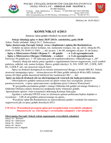 POLSKI ZWIĄZEK HODOWCÓW GOŁĘBI POCZTOWYCH OKRĘG WROCŁAW - ODDZIAŁ 0349 OLEŚNICA 56-400 Oleśnica Nr konta: Bank Spółdzielczy w Oleśnicy 75 9584 0008 2001 0010 3990 0001 NIP 898-20-70-985 Regon 020111445 Adres korespondencyjny:56-400 Oleśnica, ul.Kilińskiego 12/5, tel. +48 606 267 913 Oleśnica, dn. 14.07.2013 r. KOMUNIKAT 4/2013 Dotyczy: Spisy gołębi młodych na sezon 2013r. Sekcje składają spisy w dniu 28.07.2013r. (niedziela), godz.18.00 Adres: Punkt wkładań Sekcji Nr 2 Dobroszyce. Spisy dostarczają Zarządy Sekcji wraz z dopłatami i opłatą dla Rachmistrza. Gołębie na spisie ułoŜyć kolejno, tzn. numerami rosnąco, tzn. np. od nr. obrączki PL0349-13-1000, PL-0349-13-1001....., itd. na poz. 1 do 40, następnie od poz. 41 do końca. - Spisy o Mistrzostwo Polski i Rejonu V – 40 gołębi - w 2-ch egzemplarzach. - Spisy o Mistrzostwo Okręgu i Oddziału – z całości - w 3-ch egzemplarzach. Pierwsze 50 gołębi poz. 1–50 zaliczana jest od współzawodnictwa Oddziałowego z „50” Numery obrączek naleŜy pisać zgodnie z regulaminem lotowo-zegarowym, czyli symbol państwa, oddział, rok, numer kolejny. Barwy gołębi (skróty): N, NN, NNP, NP., CZER, SZP, PŁ, CZER.P, itd., nie stosować innych barw. Spisy na drukach dostępnych na stronie internetowej Okręgu w dziale DRUKI. NaleŜy stosować następujące spisy - strona pierwsza 40 (Spis gołębi młodych 40-ka MP), kolejne strony 60 (Spis gołębi dorosłych/młodych bez numeracji)+60+…. itd. Spisy na innych drukach niŜ na obowiązujących wzorach nie będą przyjmowane. Obowiązkowo gołębie umieszczone na spisie winny być szczepione przeciw paramyxowirozie, a spisy opieczętowane i podpisane przez Lekarza Weterynarii . W przypadku posiadania gołębi z innego Oddziału lub gołębi od innego Hodowcy z Oddziału Oleśnica naleŜy dostarczyć podpisane karty własności gołębi. Sprawdzanie spisów i kart toŜsamości dokonują Komisje Sekcyjne. Zgodnie z uchwałą OWZD wraz ze złoŜonym spisem pobierana będzie dopłata w wysokości : 3,00 zł od gołębia umieszczonego na spisie., Wysokość opłat dla Rachmistrza za wprowadzenie gołębi i wydruki list startowozegarowych jak za spisy gołębi dorosłych 2013. UWAGA: Warunkiem przyjęcia spisu jest uregulowania wszystkich zaległości finansowych za rok bieŜący i ewentualne zaległości z lat ubiegłych. Otrzymują Zarządy Sekcji celem zapoznania wszystkich członków Sekcja 01 – Bierutów Sekcja 02 – Dobroszyce Sekcja 03 – Oleśnica Sekcja 04 – Bystre Rachmistrz Kol. A. Migalski ZA ZARZĄD