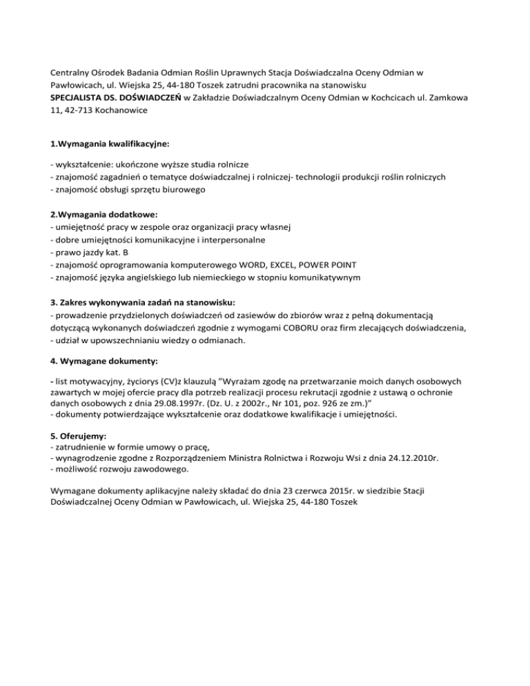 Centralny Ośrodek Badania Odmian Roślin Uprawnych Stacja Doświadczalna Oceny Odmian w Pawłowicach, ul. Wiejska 25, 44-180 Toszek zatrudni pracownika na stanowisku SPECJALISTA DS. DOŚWIADCZEŃ w Zakładzie Doświadczalnym Oceny Odmian w Kochcicach ul. Zamkowa 11, 42-713 Kochanowice 1.Wymagania kwalifikacyjne: - wykształcenie: ukończone wyższe studia rolnicze - znajomość zagadnień o tematyce doświadczalnej i rolniczej- technologii produkcji roślin rolniczych - znajomość obsługi sprzętu biurowego 2.Wymagania dodatkowe: - umiejętność pracy w zespole oraz organizacji pracy własnej - dobre umiejętności komunikacyjne i interpersonalne - prawo jazdy kat. B - znajomość oprogramowania komputerowego WORD, EXCEL, POWER POINT - znajomość języka angielskiego lub niemieckiego w stopniu komunikatywnym 3. Zakres wykonywania zadań na stanowisku: - prowadzenie przydzielonych doświadczeń od zasiewów do zbiorów wraz z pełną dokumentacją dotyczącą wykonanych doświadczeń zgodnie z wymogami COBORU oraz firm zlecających doświadczenia, - udział w upowszechnianiu wiedzy o odmianach. 4. Wymagane dokumenty: - list motywacyjny, życiorys (CV)z klauzulą ”Wyrażam zgodę na przetwarzanie moich danych osobowych zawartych w mojej ofercie pracy dla potrzeb realizacji procesu rekrutacji zgodnie z ustawą o ochronie danych osobowych z dnia 29.08.1997r. (Dz. U. z 2002r., Nr 101, poz. 926 ze zm.)” - dokumenty potwierdzające wykształcenie oraz dodatkowe kwalifikacje i umiejętności. 5. Oferujemy: - zatrudnienie w formie umowy o pracę, - wynagrodzenie zgodne z Rozporządzeniem Ministra Rolnictwa i Rozwoju Wsi z dnia 24.12.2010r. - możliwość rozwoju zawodowego. Wymagane dokumenty aplikacyjne należy składać do dnia 23 czerwca 2015r. w siedzibie Stacji Doświadczalnej Oceny Odmian w Pawłowicach, ul. Wiejska 25, 44-180 Toszek