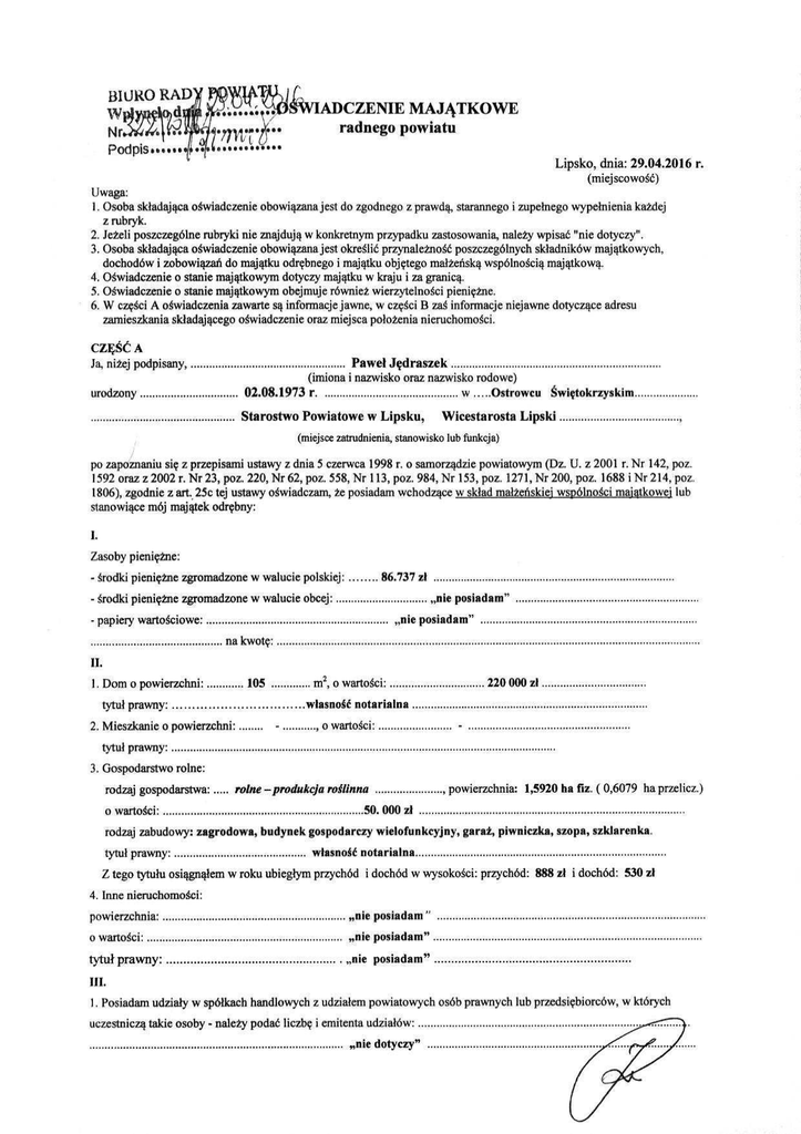 BIURO RAD „ESMŚ ADCZENIE MAJ TKOWE .ś radnego powiatu $t Lipsko, dniaŚ 29.04.2016 r. (miejscowo ć) UwagaŚ 1. 2. 3. 4. 5. 6. Osoba skladajaca o wiadczenie obowi zana jest do zgodnego z prawd , starannego i zupelnego wypełnienia ka dej z nibryk. Je eli poszczególne rubryki nie znajduja w konkretnym przypadku zastosowania, nalezy wpisać ąnie dotyczyą. Osoba skladajaca o wiadczenie obowi zanajest okre lić przynale no ć poszczególnych skladników maj tkowych. dochodów i zobowi zań do maj tku odr bnego i maj tku obj tego mał eńsk wspólno ci majatkowa O wiadczenie o stanie maj tkowym dotyczy maj tku w kraju i granic . O wiadczenie o stanie maj tkowym obejmuje równiez wierzytelno ci pienieme. W cz ci A o wiadczeniu zawarte s informacjejawne. w cz ci B za informacje niejawne dotycz ca adresu mieszkania składaj cego o wiadczenie oraz miejsca poło enia nieruchomo ci. u CZ C A Pawel J draszek Ja. ni ej podpisany, .. . (imiona i nazwisko oraz nazwisko rodowe) 02.08.1973 r. .. w .....Oskrnwcu .. urodzony Starostwo Powiatowe w Lipsku, . wi tokrzyskim.. Wicestarosta Lipski (miejsce zatrudnienia, stanowiska lub nurkuje) po zapoznaniu si z przepisami ustawy z dnia 5 czerwca l998 r. o samorz dzie powiatowym (Dz U. z 2001 r. Nr 142, poz. l592 oraz z 2002 r. Nr 23. poz. 220, Nr 62, poz 558, Nr ”3, poz 984, Nr 153, poz. 1271, Nr 100, poz. 1688 i Nr 214, poz. 1806), zgodnie z art. 250 tej ustawy o wiadczam, e posiadam wchodz ce w sklad małzeńskieę wspólno ci maęgkoweę lub stanowi ce mój maj tek odr bnyŚ [. Zasoby pieni neŚ - rodki pieni ne zgromadzone w walucie polskiejŚ - rodki pieni zne zgromadzone w walucie obcejŚ . ›papiery warto cioweŚ 86.737 zi „nie posiadam” „ ..nie . . posiadamą na kwot Ś , ą. mi. o warto ciŚ i. Dom Ś) powiemhniŚ . tytuł prawnyŚ 2. Mieszkanie 0 powierzchni rodzaj gospodarstwaŚ .. ....... własno ć notarialna . .. - .. ., o warto ci - ...„ powierzchniaŚ 1,5920 Ita liz. ( 0,6079 ha przelicz.) mlu—pmdukcja ro linna o warto ciŚ 4. inne nieruchomo ciŚ powierzchniaŚ o warto ci tytuł prawnyŚ .. .. . . „nie posiadamą „nie posiadam” .. III. i . Posiadam udziały w spółkach handlowych Ś udzialem powiatowych osób prawnych lub przedsi biorców, w których uczestnicz takie osoby . nale y podać liczb i emitenta udziałówŚ ...... „nie dotyczy” . ..... „nie dotyczy” Z tego tytułu osi gn łem w roku ubiegłym dochód w wysoko elę nie dotyczy” 2. Posiadam udziały w innych spółkach handlowych - nale y podać liczb i emitenta udziałówŚ 2 tego tytułu osi gn łem w roku ubiegłym dochód w wysoko ci „nie dotyczy” „nie dotyczy”. IV. r. Posiadam akcje w spółkach handlowych z udziałem powiatowych osób prawnych lub przedsi biorców, w których ucmstnicq takie osoby - nalezy podać liczb i emitenta akcjiŚ „nie dotyczyą , akcje te stanowi pakiet wi kszy ni 10% akcji w spółceŚ . .. „nie dotyczy”„ Z tego tytulu osi gn łem w roku ubiegłym dochód w wysoko „nie dotyczy” 2, Posiadam akcje w innych spółkach handlowych - nalezy podać liczb Z tego tytułu osi gtalem w roku ubiegłym dochód w wysoko ciŚ i mimoŚ akcjiŚ .. „nie dotyczyą „nie dotyczyą ...... V. Nabyłem (nabył mój mał onek, z wył czeniem mienia przynalezncgo do jego maj tku odr bnego) od Skarbu Państwa, innej państwowej osoby prawnej. jednostek samorz du terytorialnego, ich zwi zków lub od komunalnej osoby prawnej nast puj ce mienie, które podlegało zbyciu w drodze przetargu - nale y podać opis mieniai date nabycia, od kogoŚ.. . „nie dotyczy” VI. l. Prowadze działalno ć gospodarcz (nale y podać form prawn - osobi cie „nie dotyczy” ..... . wspólnie z innymi osobami . i przedmiot działalno ci)Ś . „nie dotyczy” „nie dotyczy”.. Z tego tytułu osi gn łem w roku ubiegłym przychód i dochód w wysoko ci. 2. Zarz dzam działalno ci gospodarcz lubjestem przedstawicielem, pełnomocnikiem raki ] działalno ci (nale y podać forme prawna i przedmiot działalno ci)Ś - osobi cie „nie dotyczy ”... „nie dotyczy”.„ . wspólnie z innymi osobami . „nie dotyczyą„ Z tego tytułu osi gn łem w roku ubiegłym dochód w wysoko ci. ...... „nle dotyczy”. VII. w spółkach handlowych (nazwa. siedziba spólki)Ś ..nie dotyczy” -jesĄem członkiem zarz du (od kiedy)Ś „ „nic dotyczy” - jestem członkiem rady nadzorczej (od kiedy)Ś - jestem członkiem komisji rewizyjnej (od kiedy)Ś „nie dotyczyą. . Z tego tytułu osi gn łem w roku ubiegłym dochód w wysoko „nie dotyczy” ...... . VIII. Inne dochody osi gane z tytułu zatrudnienia lub innej działalno ci zarobkowej lub zaj ć, z podaniem kwot uzyskiwanych z ka dego tytułu .. prlcn z. 12 rnieai cy = ru 795,77 zl ..... IX. Skladniki mienia ruchomego Ś) warto ci powy ej 10.000 złotych (w przypadku pojazdów mechanicznych nalezy poda/ć marke model i rok produkcji Opel Insignia 2.0 CDTI, rok 2011 . Citroen C4 żrand Picasso 2,0 HD], rok 2007 . X. Zobowi zania pieni ne o warto ci powy ej 10.000 złotych, w tym zaci gni te kredyty i pozyczki oraz warunki, najnkiclr zostały udzielone (wobec kogo, w zwi zku z jakim zdarzeniem, w jakiej wysoko ci)Ś .. „nie mlm zohowiszni pieni nych” ..... CZ CB Adres zamieszkaniu nsoby skład i wj o wiadczen .. ul. Cnchowskiego 18, 17-310 Ciepielów „ Miejsce poło enia nieruchomo ci wymienianych w punkcie II cz ci A (adres)Ś Czlchnwdciegum, zum Ciepielów i. ul. 3. gamoń-mmŚ rnlue w Ciepielnwie ................. Powyuu o wiadczenie składam wiadomym), iz na podstawie art. zatajenie prawdy goli kara pozbawienia wolno ci, Lipsko, 29.04.2016 r. (miejscowo ć, dam) 233 5 1 Kodeksu karnego za podanie nieprawdy lub