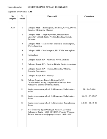 Nazwa Zespołu: MINISTERSTWO SPRAW EMIGRACJI Sygnatura archiwalna: A.65 Nr zespołu Nr teczki Zawartość A.65 1 Delegaci MSE – Birmingham, Bradford, Crewe, Devon, Dundee, Edinburgh, Glasgow 2 Delegaci MSE – High Wycombe, Huddersfield, Leicester, Oxford, Perth, Preston, Reading, Slough, Swindon 3 Delegaci MSE – Manchester, Sheffield, Southampton, Wolverhampton 4 Delegaci MSE – Northampton, Płd.Walia, Nottingham 5 Nottingham 6 Delegaci Rządu RP – Australia, Nowa Zelandia 7 Delegaci Rządu RP – Austria, Belgia, Dania, Argentyna 8 Delegaci Rządu RP – Francja, Holandia, Włochy, Szwecja, Szwajcaria 9 Delegaci Rządu RP – Niemcy 10 Delegat Rządu we Francji, Delegaci MSE, Odznaczenie-Ustawy, Anglo-Polish Society, Rada Narodowa, Skarb Narodowy, Różne. 11 Kopie pism wysłanych, dr L.Kliszewicz, Podsekretarz Stanu 31.1.84-3.6.86 12 Kopie pism wysłanych, dr L.Kliszewicz, Podsekretarz Stanu 3.6.86 – 29.12.87 13 Kopie pism wysłanych, dr L.Kliszewicz, Podsekretarz Stanu 3.1.88 – 12.12. 89 14 3-ci Światowy Zjazd Wolnych Polaków. Zebranie Delegatów Rządu i MSE 18.9.1989. Polonia Wolnego Świata. Korespondencja przychodząca 1985 – 1987 Czasokres Nazwa Zespołu: MINISTERSTWO SPRAW EMIGRACJI Sygnatura archiwalna: A.65 Nr zespołu Nr teczki Zawartość A.65 15 Różne: Konferencja w Ramsau, Sympozjum w Fawley Court, Skarb Narodowy, Komitet Obchodu 50-lecia Niepodległości, Światowy Zjazd Polaków 1989. Polskie Pokolenie Powojenne. POSK. Inwalidzi, Teatr. Polonia Wolnego Świata. Rada Pomocy Uchodźcom Polskim. Wybory do Rady Narodowej w 1989 r. Sokolnicki. 16 Min.Spraw Emigr. i Min. Oświaty – Różne pisma związane z działalnością Rządu. Sprawy krajowe w prasie. 17 Paszporty. Sprawozdania z zebrań Zespołu- „A”, Min. Spraw Wojskowych. – Rada Pomocy Uchodźcom Polskim 18 Korespondencja różna. Wydawnictwa (Min. Scholtz) 19 Różne. (Min. Scholtz). 20 Oppressed Nations of Europe (Nottingham). Sprawa pomnika Katyńskiego w Nottingham. Korespondencja różna. (Dr. Kliszewicz) 21 Z. Sołtysik. – J. Sokolnicki, „Pogoń” gen. Czarneckiego. (dr Kliszewicz) 22 Sprawy Referatu Odznaczeń 23 Korespondencja różna min. Scholtza 24 Korespondencja różna min. Choroszewski 25 Korespondencja różna min. Scholtz 26 Wybory do Rady Narodowej RP 1978 27 Wybory do |Rady Narodowej RP 1978 28 Wybory do Rady Narodowej RP 1978 29 Wybory do Rady Narodowej RP 1978 30 Wybory do Rady Narodowej RP 1983 Czasokres 1984 – 1991 Nazwa Zespołu: MINISTERSTWO SPRAW EMIGRACJI Sygnatura archiwalna: A.65 Zawartość Nr zespołu Nr teczki Czasokres A.65 31 Wybory do Rady Narodowej RP 1983 32 Wybory do Rady Narodowej RP 1983 33 Wybory do Rady Narodowej RP 1989 34 Wybory do Rady Narodowej RP 1989 35 Wybory do Rady Narodowej RP 36 Wybory do Rady Narodowej RP Sprawy krajowe i sprawozdania prof. Scholtz. 1989 37 Różne – Zagranica. Płd.Afryka. Argentyna. Belgia. Brazylia.Dania. Holandia. Kanada. W.Brytania. 1989 38 Austria. Francja. Niemcy. Stany Zjednoczone. Szwajcaria. 39 Referat Odznaczeń – Korespondencja 1973 – 1981 40 Min.Spraw Obywateli Polskich na Obczyźnie. Min. T. Bugayski 1956 – 1957 41 Referat Odznaczeń – korespondencja 1981 – 1990 42 Korespondencja min. M. Sas-Skowroński 1977 - 1982 43 Różne – Mianowania Delegatów Rządu. Dania. Delegaci Rządu – różne, Holandia. Austria.Francja. 44 Rada Polonii Wolnego Świata. Sympozjum Działaczy Niepodległościowych 1988. Australia. Niemcy. 45 Prof. L. Kos-Rabcewicz Żubkowski. Korespondencja z Polską. Stany Zjednoczone. 46 Różne 47 Światowe Zjazdy Polaków. Pohelsinska Konferencja w Bernie 48 Sprawy Polskie w prasie 1986 Nazwa Zespołu: MINISTERSTWO SPRAW EMIGRACJI Sygnatura archiwalna: A.65 Zawartość Nr zespołu Nr teczki A.65 49 Różne wydawnictwa (paczka) 50 Różne wydawnictwa (paczka) 51 Różne wydawnictwa (paczka) Czasokres