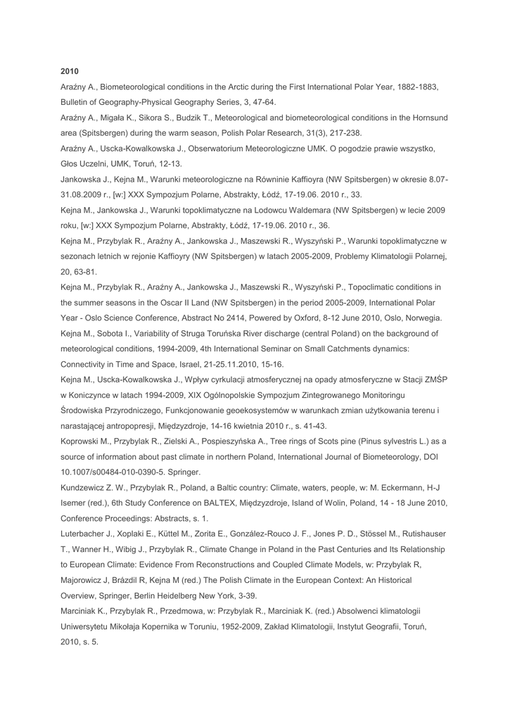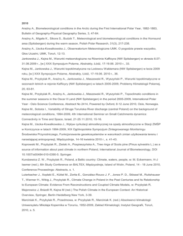 2010 Araźny A., Biometeorological conditions in the Arctic during the First International Polar Year, 1882-1883, Bulletin of Geography-Physical Geography Series, 3, 47-64. Araźny A., Migała K., Sikora S., Budzik T., Meteorological and biometeorological conditions in the Hornsund area (Spitsbergen) during the warm season, Polish Polar Research, 31(3), 217-238. Araźny A., Uscka-Kowalkowska J., Obserwatorium Meteorologiczne UMK. O pogodzie prawie wszystko, Głos Uczelni, UMK, Toruń, 12-13. Jankowska J., Kejna M., Warunki meteorologiczne na Równinie Kaffioyra (NW Spitsbergen) w okresie 8.0731.08.2009 r., [w:] XXX Sympozjum Polarne, Abstrakty, Łódź, 17-19.06. 2010 r., 33. Kejna M., Jankowska J., Warunki topoklimatyczne na Lodowcu Waldemara (NW Spitsbergen) w lecie 2009 roku, [w:] XXX Sympozjum Polarne, Abstrakty, Łódź, 17-19.06. 2010 r., 36. Kejna M., Przybylak R., Araźny A., Jankowska J., Maszewski R., Wyszyński P., Warunki topoklimatyczne w sezonach letnich w rejonie Kaffioyry (NW Spitsbergen) w latach 2005-2009, Problemy Klimatologii Polarnej, 20, 63-81. Kejna M., Przybylak R., Araźny A., Jankowska J., Maszewski R., Wyszyński P., Topoclimatic conditions in the summer seasons in the Oscar II Land (NW Spitsbergen) in the period 2005-2009, International Polar Year - Oslo Science Conference, Abstract No 2414, Powered by Oxford, 8-12 June 2010, Oslo, Norwegia. Kejna M., Sobota I., Variability of Struga Toruńska River discharge (central Poland) on the background of meteorological conditions, 1994-2009, 4th International Seminar on Small Catchments dynamics: Connectivity in Time and Space, Israel, 21-25.11.2010, 15-16. Kejna M., Uscka-Kowalkowska J., Wpływ cyrkulacji atmosferycznej na opady atmosferyczne w Stacji ZMŚP w Koniczynce w latach 1994-2009, XIX Ogólnopolskie Sympozjum Zintegrowanego Monitoringu Środowiska Przyrodniczego, Funkcjonowanie geoekosystemów w warunkach zmian użytkowania terenu i narastającej antropopresji, Międzyzdroje, 14-16 kwietnia 2010 r., s. 41-43. Koprowski M., Przybylak R., Zielski A., Pospieszyńska A., Tree rings of Scots pine (Pinus sylvestris L.) as a source of information about past climate in northern Poland, International Journal of Biometeorology, DOI 10.1007/s00484-010-0390-5. Springer. Kundzewicz Z. W., Przybylak R., Poland, a Baltic country: Climate, waters, people, w: M. Eckermann, H-J Isemer (red.), 6th Study Conference on BALTEX, Międzyzdroje, Island of Wolin, Poland, 14 - 18 June 2010, Conference Proceedings: Abstracts, s. 1. Luterbacher J., Xoplaki E., Küttel M., Zorita E., González-Rouco J. F., Jones P. D., Stössel M., Rutishauser T., Wanner H., Wibig J., Przybylak R., Climate Change in Poland in the Past Centuries and Its Relationship to European Climate: Evidence From Reconstructions and Coupled Climate Models, w: Przybylak R, Majorowicz J, Brázdil R, Kejna M (red.) The Polish Climate in the European Context: An Historical Overview, Springer, Berlin Heidelberg New York, 3-39. Marciniak K., Przybylak R., Przedmowa, w: Przybylak R., Marciniak K. (red.) Absolwenci klimatologii Uniwersytetu Mikołaja Kopernika w Toruniu, 1952-2009, Zakład Klimatologii, Instytut Geografii, Toruń, 2010, s. 5. Maszewski R., Polar climate and environmental change in the last millennium (Toruń, 1-3 II 2010), w Przegląd Geofizyczny, R LV, Z. 1-2, s. 85-87. Panfil M., Maszewski R., Rozkład sytuacji synoptycznych w Polsce północno-wschodniej, w: Kolendowicz L. (red.) Klimat Polski na tle klimatu Europy, Warunki cyrkulacyjne i radiacyjne, Seria: Studia i Prace z Geografii i Geologii nr 14, Bogucki Wydawnictwo Naukowe, Poznań, 2010, s. 51-60. Pospieszyńska A., Przybylak R., Charakterystyka hydrometeorów w Toruniu w okresie 1760-1764, V Ogólnopolska Konferencja Doktorantów Geografii, Rozwój zrównoważony regionów Polski, Toruń, 23-25 września 2010 r., s.69 (tom abstraktów). Pospieszyńska A., Przybylak R., Temperatura powietrza w Toruniu w okresie 1760-1764, w: Bednorz E. (red.) Klimat Polski na tle klimatu Europy, Warunki termiczne i opadowe, Seria: Studia i Prace z Geografii i Geologii nr 15, Bogucki Wydawnictwo Naukowe, Poznań, 2010, s. 53-66. Przybylak R., Majorowicz J., Brázdil R., Kejna M. (red.), The Polish Climate in the European Context: An Historical Overview, Springer, Berlin Heidelberg New York, ss. 535. Przybylak R., The Climate of Poland in Recent Centuries: A Synthesis of Current Knowledge: Instrumental observations, w: Przybylak R, Majorowicz J, Brázdil R, Kejna M (red.) The Polish Climate in the European Context: An Historical Overview, Springer, Berlin Heidelberg New York, 129-166. Przybylak R., Historia Katedry Meteorologii i Klimatologii oraz Zakładu Klimatologii Instytutu Geografii UMK (1947-2009), w: Przybylak R., Marciniak K. (red.) Absolwenci klimatologii Uniwersytetu Mikołaja Kopernika w Toruniu, 1952-2009, Zakład Klimatologii, Instytut Geografii, Toruń, 2010, s. 35-44. Przybylak R., Araźny A., (red.), Bulletin of Geography: Physical Geography Series, Nicolaus Copernicus University, Toruń, No 3, ss. 171. Przybylak R., Araźny A., Kejna M., Zróżnicowanie przestrzenne i wieloletnia zmienność temperatury gruntu w rejonie Stacji Polarnej UMK (NW Spitsbergen) w okresie letnim (1975-2009), Problemy Klimatologii Polarnej, 20, 103-120. Przybylak R., Araźny A., Kejna M., Diversity of Ground Temperatures on the Kaffioyra Plain (NW Spistberegn) in the Summer period (1975-2009), Abstracts from the Third European Conference on Permafrost 13-17 June 2010, (ed.) J. R. Mertes, H. H. Christiansen and B. Etzelmüller, University Centre in Svalbard, 101. Przybylak R., Marciniak K. (red.), Absolwenci klimatologii Uniwersytetu Mikołaja Kopernika w Toruniu, 19522009, Zakład Klimatologii, Instytut Geografii, Toruń, ss. 104. Przybylak R., Marciniak K., Climate Changes in the Central and North-eastern Parts of the PolishLithuanian Commonwealth from 1656 to 1685, w: Przybylak R, Majorowicz J, Brázdil R, Kejna M (red.) 