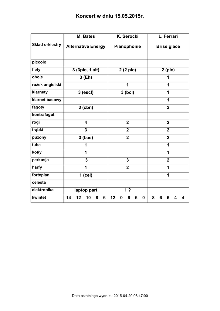 Koncert w dniu 15.05.2015r. M. Bates K. Serocki L. Ferrari Alternative Energy Pianophonie Brise glace flety 3 (3pic, 1 alt) 2 (2 pic) 2 (pic) oboje 3 (Eh) Skład orkiestry piccolo rożek angielski klarnety 3 (escl) 1 1 1 3 (bcl) 1 klarnet basowy fagoty 1 3 (cbn) 2 kontrafagot rogi 4 2 2 trąbki 3 2 2 3 (bas) 2 2 puzony tuba 1 1 kotły 1 1 perkusja 3 3 2 harfy 1 2 1 fortepian 1 (cel) 1 celesta elektronika kwintet laptop part 1? 14 – 12 – 10 – 8 – 6 12 – 0 – 6 – 6 – 0 Data ostatniego wydruku 2015-04-20 08:47:00 8–6–6–4–4