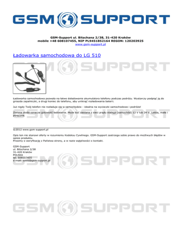 GSM-Support ul. Bitschana 2/38, 31-420 Kraków mobile +48 608107455, NIP PL9451852164 REGON: 120203925 www.gsm-support.pl Ładowarka samochodowa do LG 510 Ładowarka samochodowa pozwala na łatwe doładowanie akumulatora telefonu podczas podróży. Wystarczy podpiąć ją do gniazda zapalniczki, a drugi koniec do telefonu, aby uniknąć rozładowania baterii. Już nigdy Twój telefon nie rozładuje się w samochodzie - idealna na wycieczki samochodowe i podróże! Zielona dioda oznacza gotowość ładowania. Może być zasilana z sieci prądu stałego (samochód) 12 V lub 24 V. Lekka, mała i poręczna. ©2012 www.gsm-support.pl Opis ten nie stanowi oferty w rozumieniu Kodeksu Cywilnego. GSM-Support zastrzega sobie prawo do możliwych błędów w opisie produktu. Prosimy o weryfikację z Państwa strony, a w razie wątpliwości o kontakt. GSM-Support ul. Bitschana 2/38 31-420 Kraków POLSKA tel. 608107455 e-mail: [email protected] Powered by TCPDF (www.tcpdf.org)