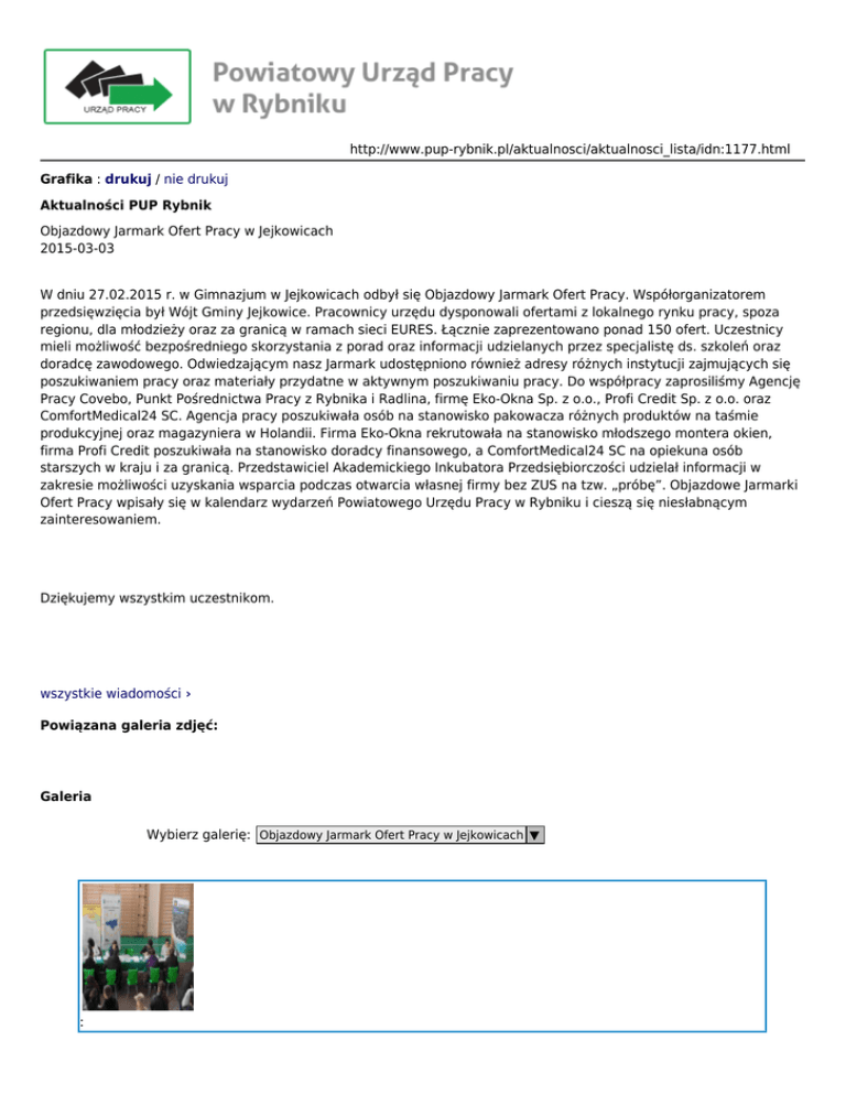 http://www.pup-rybnik.pl/aktualnosci/aktualnosci_lista/idn:1177.html Grafika : drukuj / nie drukuj Aktualności PUP Rybnik Objazdowy Jarmark Ofert Pracy w Jejkowicach 2015-03-03 W dniu 27.02.2015 r. w Gimnazjum w Jejkowicach odbył się Objazdowy Jarmark Ofert Pracy. Współorganizatorem przedsięwzięcia był Wójt Gminy Jejkowice. Pracownicy urzędu dysponowali ofertami z lokalnego rynku pracy, spoza regionu, dla młodzieży oraz za granicą w ramach sieci EURES. Łącznie zaprezentowano ponad 150 ofert. Uczestnicy mieli możliwość bezpośredniego skorzystania z porad oraz informacji udzielanych przez specjalistę ds. szkoleń oraz doradcę zawodowego. Odwiedzającym nasz Jarmark udostępniono również adresy różnych instytucji zajmujących się poszukiwaniem pracy oraz materiały przydatne w aktywnym poszukiwaniu pracy. Do współpracy zaprosiliśmy Agencję Pracy Covebo, Punkt Pośrednictwa Pracy z Rybnika i Radlina, firmę Eko-Okna Sp. z o.o., Profi Credit Sp. z o.o. oraz ComfortMedical24 SC. Agencja pracy poszukiwała osób na stanowisko pakowacza różnych produktów na taśmie produkcyjnej oraz magazyniera w Holandii. Firma Eko-Okna rekrutowała na stanowisko młodszego montera okien, firma Profi Credit poszukiwała na stanowisko doradcy finansowego, a ComfortMedical24 SC na opiekuna osób starszych w kraju i za granicą. Przedstawiciel Akademickiego Inkubatora Przedsiębiorczości udzielał informacji w zakresie możliwości uzyskania wsparcia podczas otwarcia własnej firmy bez ZUS na tzw. „próbę”. Objazdowe Jarmarki Ofert Pracy wpisały się w kalendarz wydarzeń Powiatowego Urzędu Pracy w Rybniku i cieszą się niesłabnącym zainteresowaniem. Dziękujemy wszystkim uczestnikom. wszystkie wiadomości › Powiązana galeria zdjęć: Galeria Wybierz galerię: Objazdowy Jarmark Ofert Pracy w Jejkowicach ▼ : : : : : :