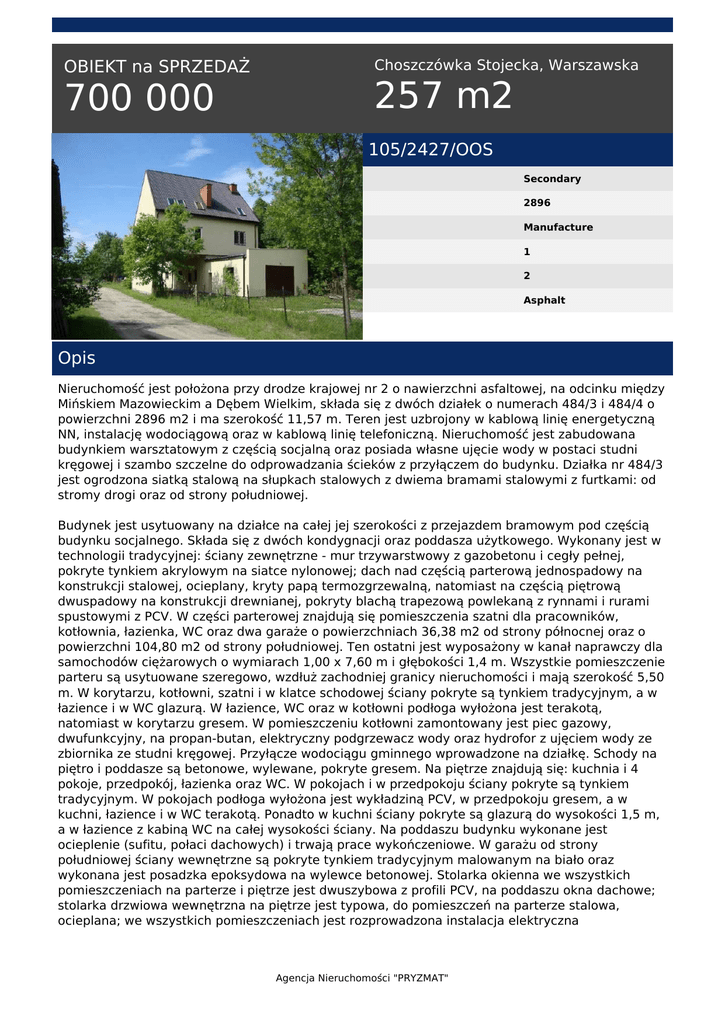 OBIEKT na SPRZEDAŻ 700 000 Choszczówka Stojecka, Warszawska 257 m2 105/2427/OOS Secondary 2896 Manufacture 1 2 Asphalt Opis Nieruchomość jest położona przy drodze krajowej nr 2 o nawierzchni asfaltowej, na odcinku między Mińskiem Mazowieckim a Dębem Wielkim, składa się z dwóch działek o numerach 484/3 i 484/4 o powierzchni 2896 m2 i ma szerokość 11,57 m. Teren jest uzbrojony w kablową linię energetyczną NN, instalację wodociągową oraz w kablową linię telefoniczną. Nieruchomość jest zabudowana budynkiem warsztatowym z częścią socjalną oraz posiada własne ujęcie wody w postaci studni kręgowej i szambo szczelne do odprowadzania ścieków z przyłączem do budynku. Działka nr 484/3 jest ogrodzona siatką stalową na słupkach stalowych z dwiema bramami stalowymi z furtkami: od stromy drogi oraz od strony południowej. Budynek jest usytuowany na działce na całej jej szerokości z przejazdem bramowym pod częścią budynku socjalnego. Składa się z dwóch kondygnacji oraz poddasza użytkowego. Wykonany jest w technologii tradycyjnej: ściany zewnętrzne - mur trzywarstwowy z gazobetonu i cegły pełnej, pokryte tynkiem akrylowym na siatce nylonowej; dach nad częścią parterową jednospadowy na konstrukcji stalowej, ocieplany, kryty papą termozgrzewalną, natomiast na częścią piętrową dwuspadowy na konstrukcji drewnianej, pokryty blachą trapezową powlekaną z rynnami i rurami spustowymi z PCV. W części parterowej znajdują się pomieszczenia szatni dla pracowników, kotłownia, łazienka, WC oraz dwa garaże o powierzchniach 36,38 m2 od strony północnej oraz o powierzchni 104,80 m2 od strony południowej. Ten ostatni jest wyposażony w kanał naprawczy dla samochodów ciężarowych o wymiarach 1,00 x 7,60 m i głębokości 1,4 m. Wszystkie pomieszczenie parteru są usytuowane szeregowo, wzdłuż zachodniej granicy nieruchomości i mają szerokość 5,50 m. W korytarzu, kotłowni, szatni i w klatce schodowej ściany pokryte są tynkiem tradycyjnym, a w łazience i w WC glazurą. W łazience, WC oraz w kotłowni podłoga wyłożona jest terakotą, natomiast w korytarzu gresem. W pomieszczeniu kotłowni zamontowany jest piec gazowy, dwufunkcyjny, na propan-butan, elektryczny podgrzewacz wody oraz hydrofor z ujęciem wody ze zbiornika ze studni kręgowej. Przyłącze wodociągu gminnego wprowadzone na działkę. Schody na piętro i poddasze są betonowe, wylewane, pokryte gresem. Na piętrze znajdują się: kuchnia i 4 pokoje, przedpokój, łazienka oraz WC. W pokojach i w przedpokoju ściany pokryte są tynkiem tradycyjnym. W pokojach podłoga wyłożona jest wykładziną PCV, w przedpokoju gresem, a w kuchni, łazience i w WC terakotą. Ponadto w kuchni ściany pokryte są glazurą do wysokości 1,5 m, a w łazience z kabiną WC na całej wysokości ściany. Na poddaszu budynku wykonane jest ocieplenie (sufitu, połaci dachowych) i trwają prace wykończeniowe. W garażu od strony południowej ściany wewnętrzne są pokryte tynkiem tradycyjnym malowanym na biało oraz wykonana jest posadzka epoksydowa na wylewce betonowej. Stolarka okienna we wszystkich pomieszczeniach na parterze i piętrze jest dwuszybowa z profili PCV, na poddaszu okna dachowe; stolarka drzwiowa wewnętrzna na piętrze jest typowa, do pomieszczeń na parterze stalowa, ocieplana; we wszystkich pomieszczeniach jest rozprowadzona instalacja elektryczna Agencja Nieruchomości "PRYZMAT" oświetleniowa, natomiast w garażach dodatkowo siłowa. Do budynku jest doprowadzone przyłącze energetyczne kablowe, wodociąg, linia telefoniczna oraz kanalizacja sanitarna do szamba szczelnego. Powierzchnia użytkowa parteru wynosi 185,40 m2 a pietra 71,60 m2. Łączna powierzchnia użytkowa budynku jest 257 m2. Cena sprzedaży jest ceną netto. Właściciel jest płatnikiem podatku VAT Ewa Gromulska tel. 502 207 250 tel. (25) 758 66 26 email: [email protected] Agencja Nieruchomości "PRYZMAT" Powered by TCPDF (www.tcpdf.org)