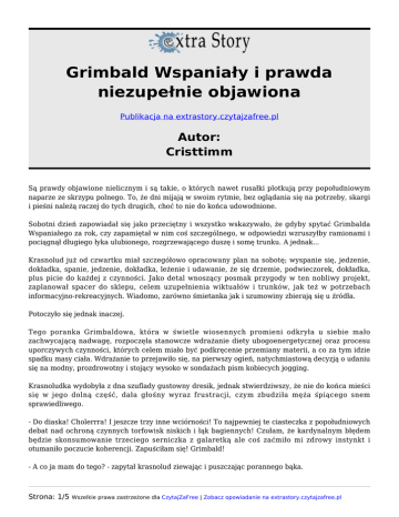 Grimbald Wspaniały i prawda niezupełnie objawiona Publikacja na extrastory.czytajzafree.pl Autor: Cristtimm Są prawdy objawione nielicznym i są takie, o których nawet rusałki plotkują przy popołudniowym naparze ze skrzypu polnego. To, że dni mijają w swoim rytmie, bez oglądania się na potrzeby, skargi i pieśni należą raczej do tych drugich, choć to nie do końca udowodnione. Sobotni dzień zapowiadał się jako przeciętny i wszystko wskazywało, że gdyby spytać Grimbalda Wspaniałego za rok, czy zapamiętał w nim coś szczególnego, w odpowiedzi wzruszyłby ramionami i pociągnął długiego łyka ulubionego, rozgrzewającego duszę i somę trunku. A jednak... Krasnolud już od czwartku miał szczegółowo opracowany plan na sobotę; wyspanie się, jedzenie, dokładka, spanie, jedzenie, dokładka, leżenie i udawanie, że się drzemie, podwieczorek, dokładka, plus picie do każdej z czynności. Jako detal wnoszący posmak przygody w ten nobliwy projekt, zaplanował spacer do sklepu, celem uzupełnienia wiktuałów i trunków, jak też w potrzebach informacyjno-rekreacyjnych. Wiadomo, zarówno śmietanka jak i szumowiny zbierają się u źródła. Potoczyło się jednak inaczej. Tego poranka Grimbaldowa, która w świetle wiosennych promieni odkryła u siebie mało zachwycającą nadwagę, rozpoczęła stanowcze wdrażanie diety ubogoenergetycznej oraz procesu uporczywych czynności, których celem miało być podkręcenie przemiany materii, a co za tym idzie spadku masy ciała. Wdrażanie to przejawiło się, na pierwszy ogień, natychmiastową decyzją o udaniu się na modny, prozdrowotny i stojący wysoko w sondażach pism kobiecych jogging. Krasnoludka wydobyła z dna szuflady gustowny dresik, jednak stwierdziwszy, że nie do końca mieści się w jego dolną część, dała głośny wyraz frustracji, czym zbudziła męża śpiącego snem sprawiedliwego. - Do diaska! Cholerrra! I jeszcze trzy inne wciórności! To najpewniej te ciasteczka z popołudniowych debat nad ochroną czynnych torfowisk niskich i łąk bagiennych! Czułam, że kardynalnym błędem będzie skonsumowanie trzeciego serniczka z galaretką ale coś zaćmiło mi zdrowy instynkt i otumaniło poczucie koherencji. Zapuściłam się! Grimbald! - A co ja mam do tego? - zapytał krasnolud ziewając i puszczając porannego bąka. Strona: 1/5 Wszelkie prawa zastrzeżone dla CzytajZaFree | Zobacz opowiadanie na extrastory.czytajzafree.pl Pogardliwy wzrok żony zawierał cały elaborat na temat jego prostactwa, nieposzanowania płci pięknej i uszczerbków w elementarnym poczuciu dobrego wychowania. - No co? - Obruszył się Grimbald. - Jako propagatorka zdrowego stylu życia powinnaś wiedzieć, że przetrzymywanie nadmiaru powietrza drastycznie wpływa na obniżenie dobrego samopoczucia, wręcz odbija się na zdrowiu... w tym psychicznym. - Czasem mam wrażenie, że wewnątrz ciebie jedynie nie-przetrzymywane powietrze można znaleźć prychnęła Grimbaldowa i ponowiła próbę wciągnięcia dołu od dresiku. I tym razem nie udało się. Krasnoludka westchnęła, wyciągnęła inną, obszerniejszą parę legginsów, ubrała je, przejrzała się w lustrze i raz jeszcze westchnęła. - Koniec z serniczkami z galaretką. Zrobiła pięć przysiadów, dwa pajacyki, trzy skłony i trochę już spocona wyszła do kuchni. Grimbald puścił drugiego, basowego bąka, sięgnął po czapkę, podrapał się niespiesznie po goleni i podążył za małżonką, uznając dalsze przebywanie w sypialni za bezcelowe, szczególnie iż poczuł dojmujące ssanie w żołądku. Jakiż piękny, niezaangażowany dzionek się dziś urodził, zadumał się na chwilę. Po czym ukroił grubą pajdę chleba, posmarował nie żałując smalczyku, obficie posypał solą, przykrył plastrem boczku i prawie całą wsadził na raz do buzi. Trwaj chwilo, chwilo jesteś piękna. - Tyle tłuszczu i cholesterolu od rana, to nie dziw że wieczorem cię zatyka - skomentowała jego wyczyn żona. - Szo masz na myszli? - Krasnolud starannie żuł kromkę jednocześnie starając się być aktywnym w małżeńskiej dyskusji. - To, żeś spaślak, leń i niezdrowo się odżywiasz, a skutki odbijają się również na rodzinie. - Poprawię szię, własznie mam szamiar pobrać witaminki. I tu, by nie być gołosłownym, podszedł do stojącej w kącie kuchni beczki i odsunąwszy przykrywającą ją deskę, bez ceregieli zanurzył dłoń, "pobrał" okazałego, kiszonego ogórka i dorzucił do zawartości jamy ustnej. Mlasnął z ukontentowania, gdy wykwintne smaki połączyły się pod podniebieniem tworząc kwintesencję udanego śniadania. - Czy ty zdajesz sobie sprawę jakie spustoszenie czynisz w swoim organizmie takim śmieciowym i byle jak spożywanym żarciem? Wymiotować mi się chce... Serio. - Uhaaaa. Łyk gorzałki by się przydał. Grimbaldowa nie kryła narastającej frustracji, jak też tego, że poczynania męża w znacznym stopniu ją wzmagają. Strona: 2/5 Wszelkie prawa zastrzeżone dla CzytajZaFree | Zobacz opowiadanie na extrastory.czytajzafree.pl - Gorzałka! Fuj! Tylko to ci w głowie! Krasnolud już miał zaprotestować i dać przykład różnorakich spraw nad jakimi głowi się w wolnych chwilach ale po namyśle odpuścił i zmieniwszy temat zaczął opowiadać o pracy. To niechybnie zobligowało Grimbaldową do bardziej prężnego działania. - Kończ - zarządziła - zmień obuwie i ruszamy. - Jak to ruszamy? Dokąd? - Propagować zdrowy styl życia w wiejskiej społeczności. - Ale dlaczego ja? Ja nie mam z tym nic wspólnego. - Owszem masz. Jesteś moim mężem i od dzisiaj przestawiasz się na fit-filozofię by aktywnie, wraz ze mną, upowszechniać prawidłowe nawyki. Grimbald miał wiele argumentów, dzięki którym mógłby prowadzić długą polemikę z żoną i udowodnić jak bardzo się myli, jednak jedno spojrzenie na rozjuszoną postać w przyciasnych legginsach, na potarganą grzywkę, błyszczące oczy, zaciśnięte