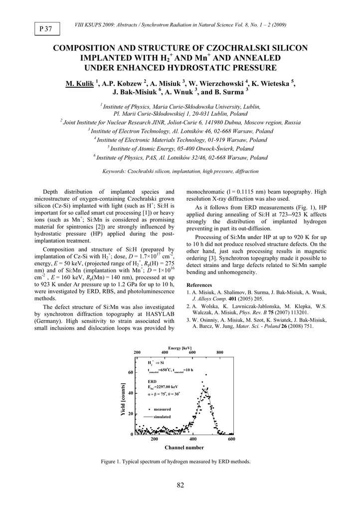 P 37 VIII KSUPS 2009: Abstracts / Synchrotron Radiation in Natural Science Vol. 8, No. 1 – 2 (2009) COMPOSITION AND STRUCTURE OF CZOCHRALSKI SILICON IMPLANTED WITH H2+ AND Mn+ AND ANNEALED UNDER ENHANCED HYDROSTATIC PRESSURE M. Kulik 1, A.P. Kobzew 2, A. Misiuk 3, W. Wierzchowski 4, K. Wieteska 5, J. Bak-Misiuk 6, A. Wnuk 3, and B. Surma 3 1 Institute of Physics, Maria Curie-Skłodowska University, Lublin, Pl. Marii Curie-Skłodowskiej 1, 20-031 Lublin, Poland 2 Joint Institute for Nuclear Research JINR, Joliot-Curie 6, 141980 Dubna, Moscow region, Russia 3 Institute of Electron Technology, Al. Lotników 46, 02-668 Warsaw, Poland 4 Institute of Electronic Materials Technology, 01-919 Warsaw, Poland 5 Institute of Atomic Energy, 05-400 Otwock-Świerk, Poland 6 Institute of Physics, PAS, Al. Lotników 32/46, 02-668 Warsaw, Poland Keywords: Czochralski silicon, implantation, high pressure, diffraction monochromatic (l = 0.1115 nm) beam topography. High resolution X-ray diffraction was also used. As it follows from ERD measurements (Fig. 1), HP applied during annealing of Si:H at 723--923 K affects strongly the distribution of implanted hydrogen preventing in part its out-diffusion. Processing of Si:Mn under HP at up to 920 K for up to 10 h did not produce resolved structure defects. On the other hand, just such processing results in magnetic ordering [3]. Synchrotron topography made it possible to detect strains and large defects related to Si:Mn sample bending and unhomogeneity. Depth distribution of implanted species and microstructure of oxygen-containing Czochralski grown silicon (Cz-Si) implanted with light (such as H+; Si:H is important for so called smart cut processing [1]) or heavy ions (such as Mn+; Si:Mn is considered as promising material for spintronics [2]) are strongly influenced by hydrostatic pressure (HP) applied during the postimplantation treatment. Composition and structure of Si:H (prepared by implantation of Cz-Si with H2+; dose, D = 1.7×1017 cm-2, energy, E = 50 keV, (projected range of H2+, Rp(H) = 275 nm) and of Si:Mn (implantation with Mn+; D = 1×1016 cm-2 , E = 160 keV, Rp(Mn) = 140 nm), processed at up to 923 K under Ar pressure up to 1.2 GPa for up to 10 h, were investigated by ERD, RBS, and photoluminescence methods. The defect structure of Si:Mn was also investigated by synchrotron diffraction topography at HASYLAB (Germany). High sensitivity to strain associated with small inclusions and dislocation loops was provided by 200 400 References 1. A. Misiuk, A. Shalimov, B. Surma, J. Bak-Misiuk, A. Wnuk, J. Alloys Comp. 401 (2005) 205. 2. A. Wolska, K. Lawniczak-Jablonska, M. Klepka, W.S. Walczak, A. Misiuk, Phys. Rev. B 75 (2007) 113201. 3. W. Osinniy, A. Misiuk, M. Szot, K. Swiatek, J. Bak-Misiuk, A. Barcz, W. Jung, Mater. Sci. - Poland 26 (2008) 751. Energy [keV] 600 800 + H2 ⇒ Si Yield [counts] 60 o tannealed=650 C, tannealed=10 h ERD EHe =2297.00 keV + 40 20 0 o α = β = 75 , θ = 30 o measured simulated 200 400 600 Channel number Figure 1. Typical spectrum of hydrogen measured by ERD methods. 82