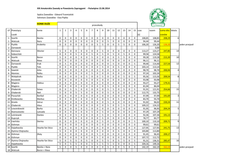 XIX Amatorskie Zawody w Powożeniu Zaprzęgami - Poświętne 15.06.2014 Sędzia Zawodów - Edward Trzemżalski Sekretarz Zawodów - Ewa Piętka KONIE DUŻE LP Powożący przeszkody konie 1 2 3 4 5 6 7 8 9 10 11 12 13 14 15 czas Bonita Nara Arabetta 0 0 0 0 0 0 0 0 0 0 0 0 0 0 0 0 0 0 0 0 0 0 0 5 0 0 5 0 5 0 0 0 0 0 0 5 0 0 5 0 0 0 0 0 0 108,85 94,44 106,20 Wector 5 0 5 0 0 0 0 0 0 0 0 0 0 5 0 0 0 0 0 0 0 0 0 0 0 5 0 0 5 5 5 0 0 0 0 5 0 0 0 0 0 0 0 0 0 0 0 0 0 0 0 0 0 0 0 0 0 0 0 0 0 0 0 0 0 0 0 0 0 0 0 0 0 0 5 0 0 0 0 0 0 0 0 0 0 0 0 0 0 0 5 5 0 0 5 0 0 0 0 0 0 0 0 0 0 5 5 0 0 0 0 0 0 5 0 0 0 0 0 0 0 5 5 5 0 0 0 0 0 0 0 0 0 0 0 0 0 5 0 0 0 0 0 0 0 0 0 0 0 0 0 0 0 0 0 0 0 0 0 0 0 0 0 5 0 0 0 0 0 0 0 0 0 5 0 0 0 0 0 0 0 0 0 5 0 0 0 5 5 0 0 0 0 5 0 0 0 0 0 0 0 0 0 0 0 5 0 0 0 0 0 0 0 0 0 5 0 0 0 0 0 0 0 0 0 0 0 0 0 0 0 0 0 0 0 0 0 0 0 0 0 0 0 5 5 0 5 0 5 5 0 0 0 5 0 0 5 0 0 0 0 0 0 0 0 0 0 5 5 5 5 0 0 0 0 0 5 5 0 0 0 0 0 0 0 0 0 0 0 0 5 5 5 0 5 5 5 0 0 0 0 0 0 0 0 0 0 5 5 5 0 5 0 0 5 0 0 0 0 0 0 0 5 0 0 0 0 0 0 0 5 0 0 0 0 0 0 0 0 5 0 0 0 5 0 0 5 0 0 0 0 0 0 0 0 0 5 0 5 0 0 0 0 0 0 0 5 0 0 5 0 0 0 5 5 0 0 0 0 0 5 0 0 0 5 0 0 0 0 5 0 0 0 0 0 0 0 0 0 0 5 0 5 0 0 0 0 0 0 0 0 0 0 0 0 0 0 0 0 0 0 0 0 0 0 0 0 0 0 0 0 0 0 0 0 0 0 0 5 0 0 0 5 0 0 0 5 0 0 0 0 0 0 0 0 0 5 0 0 0 0 0 5 5 0 113,27 99,58 99,28 96,11 99,40 103,14 98,70 97,24 95,56 93,98 93,27 81,04 91,91 112,75 97,99 83,70 91,02 109,22 91,95 97,29 92,36 78,77 100,10 99,61 127,95 103,80 91,45 107,72 91,31 104,16 142,19 [s] Luzak 1 1 2 2 3 3 4 4 5 5 6 6 7 7 8 8 9 9 10 10 11 11 12 12 13 13 14 14 15 15 16 16 17 17 18 18 Szarlik Walczak Pyskło Żarnawski Gorczyca Sobociński Szarlik Walczak Żarnawski Pyskło Sawicki Niemiec Walędziak Kosowski Magiera Magiera Chaberski Chaberski Paszyński Kretkowska Grzela Chaberski Lewandowski Staniszewsko Leśniewski Kupczyk Liwińska Ochman Dajwłowska Dymna Chojnacka Ochman Ochman Dymna Chojnacka Dajwłowska Szarlik Walczak razem Baron Niwa Eryk Tols Arka Rolka Baśka Hektus Sziwa Neli Baribal Markus Intruz Irbus Burka Lansada Dantes Derma Hearke fan Stico Złoty Hearke fan Stico Bonita + Nara Baron + Niwa suma obu lokata czasów 108,85 99,44 126,20 0,00 123,27 124,58 119,28 96,11 114,40 113,14 98,70 102,24 115,56 93,98 93,27 86,04 121,91 132,75 97,99 93,70 96,02 124,22 96,95 107,29 107,36 83,77 110,10 99,61 127,95 113,80 96,45 112,72 136,31 149,16 162,19 208,29 6 126,20 jeden przejazd 247,85 14 215,39 10 227,54 12 200,94 4 209,54 8 179,31 1 254,66 15 191,69 3 220,24 11 204,24 5 191,13 2 209,71 9 241,75 13 209,17 7 285,47 16 162,19 jeden przejazd