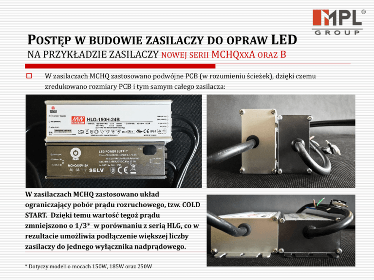 POSTĘP W BUDOWIE ZASILACZY DO OPRAW LED NA PRZYKŁADZIE ZASILACZY NOWEJ SERII MCHQXXA ORAZ B W zasilaczach MCHQ zastosowano podwójne PCB (w rozumieniu ścieżek), dzięki czemu zredukowano rozmiary PCB i tym samym całego zasilacza: W zasilaczach MCHQ zastosowano układ ograniczający pobór prądu rozruchowego, tzw. COLD START. Dzięki temu wartość tegoż prądu zmniejszono o 1/3* w porównaniu z serią HLG, co w rezultacie umożliwia podłączenie większej liczby zasilaczy do jednego wyłącznika nadprądowego. * Dotyczy modeli o mocach 150W, 185W oraz 250W POSTĘP W BUDOWIE ZASILACZY DO OPRAW LED NOWA SERIA MCHQXXA ORAZ B Rezultaty rozwoju: mniejsze gabaryty przy tej samej mocy -> wyższa sprawność -> niższa cena HLG-40H MCHQ40A/B Długość 171 mm 157 mm Szerokość 61.5 mm 52.9 mm Wysokość 36.8 mm 36.5 mm HLG-60H MCHQ60A/B 171 mm 172 mm 61.5 mm 52.9 mm 36.8 mm 36.5 mm HLG-80H MCHQ80A/B 195.6 mm 172.4 mm 61.5 mm 61.5 mm 38.8 mm 36.5 mm HLG-100H MCHQ100A/B 220 mm 190 mm 68 mm 61.5 mm 38.8 mm 36.5 mm HLG-150H MCHQ150A/B 228 mm 220.8 mm 68 mm 61.5 mm 38.8 mm 36.5 mm HLG-185H MCHQ185A/B 228 mm 195 mm 68 mm 73.5 mm 38.8 mm 38 mm HLG-240H MCHQ250A/B 244.2 mm 225.2 mm 68 mm 73.5 mm 38.8 mm 38 mm MCHQ40 MCHQ60 MCHQ80 MCHQ100 MCHQ150 MCHQ185 MCHQ250 SPR 12V 15V 86.5% 87% 88% 88% 91% 91% 92% 92% 92.5% 92% 93% AWNOŚĆ 24V 36V 48V 88% 88.5% 89% 89% 89% 90% 93% 92.5% 93% 93.5% 94% 93.5% 94.5% ZASILANIE DIOD LED – USTAWIANIE PARAMETRÓW WYJŚCIOWYCH Wersja z potencjometrami ręczne ustawienie punktu pracy U, I; np. dla MCHQ150V12A Uo: 10.5~13.5VDC Io: 7.5~12.5A Wersja B - Wejście DIMMING 3 w 1 – np. dla MCHQ150V12B: a) 1~10V b) PWM c) Rezystancja (potencjometr)