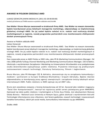 www.media2.pl 2011-02-28 AWANSE W POLSKIM ODDZIALE AMD ŁUKASZ SZEWCZYK,WWW.MEDIA2.PL (2011-02-28 00:00:00) media2.pl/reklama-pr/75400-awanse-w-polskim-oddziale-amd.html#k Ewa Walter i Bruno Murzyn awansowali w strukturach firmy AMD. Ewa Walter na nowym stanowisku będzie koordynować pracę lokalnych managerów marketingu, odpowiadając za implementację globalnej strategii AMD. Do jej zadań będzie należeć m.in. nadzór nad realizacją działań marketingowych w regionie, rozwój programów partnerskich oraz monitorowanie efektywności działań promocyjnych firmy. Awanse w Polskim oddziale AMD Łukasz Szewczyk Ewa Walter i Bruno Murzyn awansowali w strukturach firmy AMD. Ewa Walter na nowym stanowisku będzie koordynować pracę lokalnych managerów marketingu, odpowiadając za implementację globalnej strategii AMD. Do jej zadań będzie należeć m.in. nadzór nad realizacją działań marketingowych w regionie, rozwój programów partnerskich oraz monitorowanie efektywności działań promocyjnych firmy. Ewa rozpoczęła pracę w AMD Polska w 2002 roku, jako PR & Marketing Communications Manager. Od roku 2008 pełniła funkcję Channel Marketing and Marketing Communications Manager, CEE & Baltics. Ukończyła z wyróżnieniem Zarządzanie i Marketing na Uniwersytecie Wrocławskim oraz podyplomowe studia dziennikarskie (specjalizacja: public relations). Prywatnie interesuje się praktycznymi zastosowaniami nowych technologii, literaturą fantastyczną, filmem i żeglarstwem. Bruno Murzyn, jako PR Manager CEE & Adriatics, skoncentruje się na zarządzaniu komunikacją z mediami i partnerami w Europie Środkowo-Wschodniej i krajach Adriatyku. Będzie również odpowiedzialny za koordynację pracy agencji zewnętrznych i zarządzanie treścią lokalnych witryn internetowych AMD. Public relations w AMD zajmuje się od 2007 roku. Bruno jest zawodowo związany z branżą komputerową od 10 lat. Zaczynał jako redaktor magazynu "Świat Gier Komputerowych", tworzył też najstarszy polski serwis poświęcony grom MMORPG. Zajmował się także public relations i marketingiem w firmie Asus Polska. Jest absolwentem Wyższej Szkoły Biznesu - National Louis University w Nowym Sączu, gdzie ukończył z wyróżnieniem kierunki Technologie Informatyczne oraz e-Business. Jest fanem gadżetów, nowych technologii i nowoczesnych kanałów komunikacji, takich jak social media, komunikatory internetowe czy gry MMORPG. Źródło: AMD