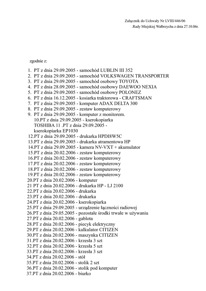 Załącznik do Uchwały Nr LVIII/446/06 .Rady Miejskiej Wałbrzycha z dnia 27.10.06r. zgodnie z: 1. 2. 3. 4. 5. 6. 7. 8. 9. PT z dnia 29.09.2005 - samochód LUBLIN III 352 PT z dnia 29.09.2005 - samochód VOLKSWAGEN TRANSPORTER PT z dnia 29.09.2005 - samochód osobowy TOYOTA PT z dnia 28.09.2005 - samochód osobowy DAEWOO NEXIA PT z dnia 29.09.2005 - samochód osobowy POLONEZ PT z dnia 16.12.2005 - kosiarka traktorowa - CRAFTSMAN PT z dnia 29.09.2005 - komputer ADAX DELTA 300 PT z dnia 29.09.2005 - zestaw komputerowy PT z dnia 29.09.2005 - komputer z monitorem. 10.PT z dnia 29.09.2005 - kserokopiarka TOSHIBA 11 .PT z dnia 29.09.2005 kserokopiarka EP1030 12.PT z dnia 29.09.2005 - drukarka HPDI8W5C 13.PT z dnia 29.09.2005 - drukarka atramentowa HP 14.PT z dnia 29.09.2005 - kamera NV-VXT + akumulator 15.PT z dnia 20.02.2006 - zestaw komputerowy 16.PT z dnia 20.02.2006 - zestaw komputerowy 17.PT z dnia 20.02.2006 - zestaw komputerowy 18.PT z dnia 20.02.2006 - zestaw komputerowy 19.PT z dnia 20.02.2006 - zestaw komputerowy 20.PT z dnia 20.02.2006 - komputer 21 PT z dnia 20.02.2006 - drukarka HP - LJ 2100 22.PT z dnia 20.02.2006 - drukarka 23.PT z dnia 20.02.2006 - drukarka 24.PT z dnia 20.02.2006 - kserokopiarka 25.PT z dnia 29.09.2005 - urządzenie łączności radiowej 26.PT z dnia 29.05.2005 - pozostałe środki trwałe w używaniu 27.PT z dnia 20.02.2006 - gablota 28.PT z dnia 20.02.2006 - piecyk elektryczny 29.PT z dnia 20.02.2006 - kalkulator CITIZEN 30.PT z dnia 20.02.2006 - maszynka CITIZEN 31.PT z dnia 20.02.2006 - krzesła 3 szt 32.PT z dnia 20.02.2006 - krzesła 5 szt 33.PT z dnia 20.02.2006 - krzesła 3 szt 34.PT z dnia 20.02.2006 - stół 35.PT z dnia 20.02.2006 - stolik 2 szt 36.PT z dnia 20.02.2006 - stolik pod komputer 37.PT z dnia 20.02.2006 - biurko