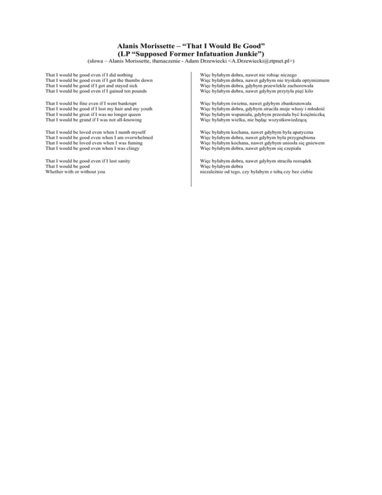 Alanis Morissette – “That I Would Be Good” (LP “Supposed Former Infatuation Junkie”) (słowa – Alanis Morissette, tłumaczenie - Adam Drzewiecki <[email protected]>) That I would be good even if I did nothing That I would be good even if I got the thumbs down That I would be good if I got and stayed sick That I would be good even if I gained ten pounds Więc byłabym dobra, nawet nie robiąc niczego Więc byłabym dobra, nawet gdybym nie tryskała optymizmem Więc byłabym dobra, gdybym przewlekle zachorowała Więc byłabym dobra, nawet gdybym przytyła pięć kilo That I would be fine even if I went bankrupt That I would be good if I lost my hair and my youth That I would be great if I was no longer queen That I would be grand if I was not all-knowing Więc byłabym świetna, nawet gdybym zbankrutowała Więc byłabym dobra, gdybym straciła moje włosy i młodość Więc byłabym wspaniała, gdybym przestała być księżniczką Więc byłabym wielka, nie będąc wszystkowiedzącą That I would be loved even when I numb myself That I would be good even when I am overwhelmed That I would be loved even when I was fuming That I would be good even when I was clingy Więc byłabym kochana, nawet gdybym była apatyczna Więc byłabym dobra, nawet gdybym była przygnębiona Więc byłabym kochana, nawet gdybym uniosła się gniewem Więc byłabym dobra, nawet gdybym się czepiała That I would be good even if I lost sanity That I would be good Whether with or without you Więc byłabym dobra, nawet gdybym straciła rozsądek Więc byłabym dobra niezależnie od tego, czy byłabym z tobą czy bez ciebie