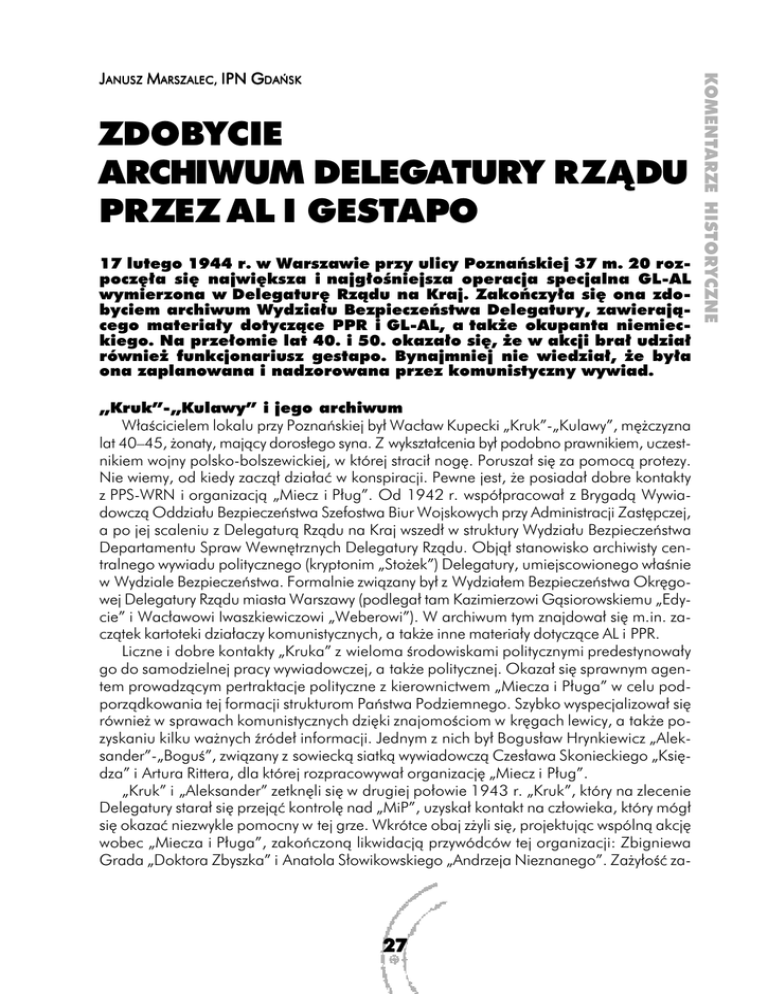 ZDOBYCIE ARCHIWUM DELEGATURY RZĄDU PRZEZ AL I GESTAPO 17 lutego 1944 r. w Warszawie przy ulicy Poznańskiej 37 m. 20 rozpoczęła się największa i najgłośniejsza operacja specjalna GL-AL wymierzona w Delegaturę Rządu na Kraj. Zakończyła się ona zdobyciem archiwum Wydziału Bezpieczeństwa Delegatury, zawierającego materiały dotyczące PPR i GL-AL, a także okupanta niemieckiego. Na przełomie lat 40. i 50. okazało się, że w akcji brał udział również funkcjonariusz gestapo. Bynajmniej nie wiedział, że była ona zaplanowana i nadzorowana przez komunistyczny wywiad. „Kruk”-„Kulawy” i jego archiwum Właścicielem lokalu przy Poznańskiej był Wacław Kupecki „Kruk”-„Kulawy”, mężczyzna lat 40–45, żonaty, mający dorosłego syna. Z wykształcenia był podobno prawnikiem, uczestnikiem wojny polsko-bolszewickiej, w której stracił nogę. Poruszał się za pomocą protezy. Nie wiemy, od kiedy zaczął działać w konspiracji. Pewne jest, że posiadał dobre kontakty z PPS-WRN i organizacją „Miecz i Pług”. Od 1942 r. współpracował z Brygadą Wywiadowczą Oddziału Bezpieczeństwa Szefostwa Biur Wojskowych przy Administracji Zastępczej, a po jej scaleniu z Delegaturą Rządu na Kraj wszedł w struktury Wydziału Bezpieczeństwa Departamentu Spraw Wewnętrznych Delegatury Rządu. Objął stanowisko archiwisty centralnego wywiadu politycznego (kryptonim „Stożek”) Delegatury, umiejscowionego właśnie w Wydziale Bezpieczeństwa. Formalnie związany był z Wydziałem Bezpieczeństwa Okręgowej Delegatury Rządu miasta Warszawy (podlegał tam Kazimierzowi Gąsiorowskiemu „Edycie” i Wacławowi Iwaszkiewiczowi „Weberowi”). W archiwum tym znajdował się m.in. zaczątek kartoteki działaczy komunistycznych, a także inne materiały dotyczące AL i PPR. Liczne i dobre kontakty „Kruka” z wieloma środowiskami politycznymi predestynowały go do samodzielnej pracy wywiadowczej, a także politycznej. Okazał się sprawnym agentem prowadzącym pertraktacje polityczne z kierownictwem „Miecza i Pługa” w celu podporządkowania tej formacji strukturom Państwa Podziemnego. Szybko wyspecjalizował się również w sprawach komunistycznych dzięki znajomościom w kręgach lewicy, a także pozyskaniu kilku ważnych źródeł informacji. Jednym z nich był Bogusław Hrynkiewicz „Aleksander”-„Boguś”, związany z sowiecką siatką wywiadowczą Czesława Skonieckiego „Księdza” i Artura Rittera, dla której rozpracowywał organizację „Miecz i Pług”. „Kruk” i „Aleksander” zetknęli się w drugiej połowie 1943 r. „Kruk”, który na zlecenie Delegatury starał się przejąć kontrolę nad „MiP”, uzyskał kontakt na człowieka, który mógł się okazać niezwykle pomocny w tej grze. Wkrótce obaj zżyli się, projektując wspólną akcję wobec „Miecza i Pługa”, zakończoną likwidacją przywódców tej organizacji: Zbigniewa Grada „Doktora Zbyszka” i Anatola Słowikowskiego „Andrzeja Nieznanego”. Zażyłość za- 27 KOMENTARZE HISTORYCZNE JANUSZ MARSZALEC, IPN GDAŃSK KOMENTARZE HISTORYCZNE kończyła się propozycją zaangażowania Hrynkiewicza do wywiadu antykomunistycznego. Kandydat był idealny, gdyż posiadał sporą wiedzę o komunistach polskich i ich powiązaniach personalnych jeszcze z okresu przedwojennego. Tak przynajmniej sądził „Kruk”, przed którym „Aleksander” wyspowiadał się z młodzieńczych fascynacji komunizmem. Spychalski, Hrynkiewicz i uderzenie w „reakcję” Hrynkiewicz zaczął od stopniowego penetrowania archiwum „Kruka”. Robił to w czasie zakrapianych alkoholem spotkań przy Poznańskiej 37, ewentualnie wykonywał odpisy w czasie prac kancelaryjnych prowadzonych wspólnie z „Krukiem”1. Postępy w kopiowaniu tego zasobu archiwalnego były jednak słabe. Spychalski i Hrynkiewicz zaczęli zastanawiać się nad całościowym zagarnięciem materiałów. Brakowało ludzi i jasnego planu, pod czyim szyldem to zrobić. Spychalski nie chciał tego czynić wyłącznie przy pomocy bojowców AL, gdyż ci mogli zostać rozpoznani. W efekcie spowodowałoby to poważne konsekwencje polityczne i naraziło na szwank autorytet komunistów polskich, budujących obraz AL jako formacji niepodległościowej. Stąd najprawdopodobniej pojawił się pomysł zaangażowania jeszcze dodatkowych osób z innych formacji podziemnych oraz z gestapo. W tym miejscu należy wyjaśnić sprawę nawiązania agenturalnego kontaktu z szefem referatu antykomunistycznego Wolfgangiem Birknerem z warszawskiego gestapo. W okresie śledztwa w Departamencie X usiłowano udowodnić, że Hrynkiewicz został zwerbowany już w 1943 r. Nic takiego się nie wydarzyło. Prawda jest taka, że kontakt z Birknerem został nawiązany dopiero w połowie albo w końcu stycznia 1944 r. za pośrednictwem agenta Abwehry, Włodzimierza Bondorowskiego. Nie była to tylko decyzja Hrynkiewicza, lecz polecenie Spychalskiego, który rzecz dokładnie z nim przedyskutował. Materiały informacyjne dla gestapo dostarczał (ewentualnie fabrykował) szef komunistycznego wywiadu, „Aleksander” korzystał też z wiadomości pozyskanych w „Mieczu i Pługu”2. Gra, którą Hrynkiewicz podjął pod płaszczykiem „MiP”, miała służyć obronie PPR przed wrogą penetracją innych służb kontrwywiadowczych, ale przede wszystkim miała mieć ofensywny charakter, wymierzony w struktury Polskiego Państwa Podziemnego. W ten sposób Spychalski wzmacniał akcję dezinformacyjną prowadzoną do tej pory na oślep. Teraz – dzięki uzyskaniu przez „MiP” parasola ochronnego gestapo – akcja miała być planowa i rzetelna. Na wynik długo nie trzeba było czekać – zaledwie do 17 lutego 1944 r. Akcja Tego dnia przed godz. 7.00 do mieszkania Wacława Kupeckiego „Kruka”-„Kulawego” weszła bojówka składająca się z dwóch żołnierzy wywiadu AL (Wincenty Romanowski „Roman”, Jerzy Wiechocki „Stefan”) oraz trzec