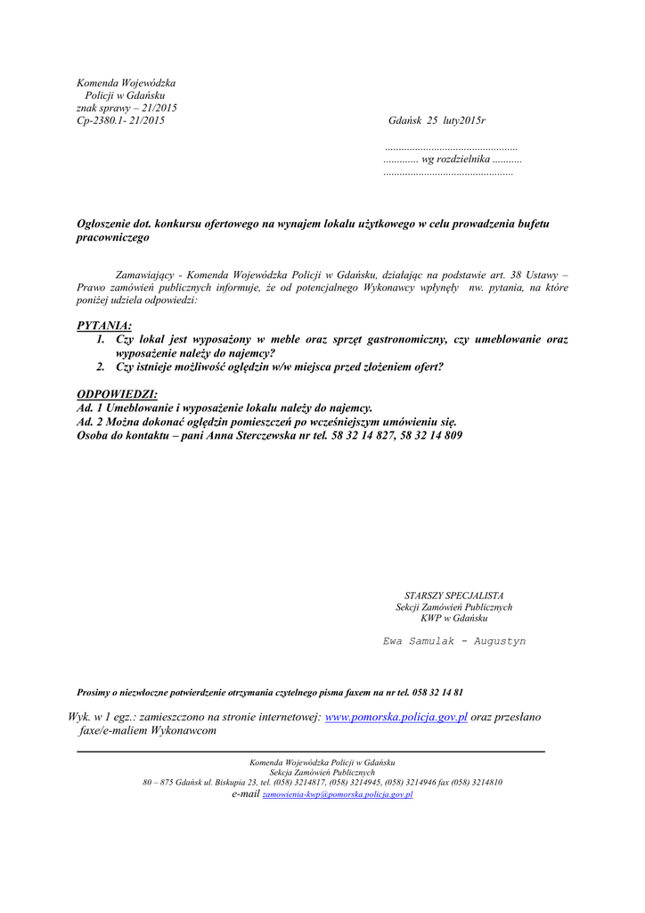 Komenda Wojewódzka Policji w Gdańsku znak sprawy – 21/2015 Cp-2380.1- 21/2015 Gdańsk 25 luty2015r ................................................. ............. wg rozdzielnika ........... ................................................ Ogłoszenie dot. konkursu ofertowego na wynajem lokalu użytkowego w celu prowadzenia bufetu pracowniczego Zamawiający - Komenda Wojewódzka Policji w Gdańsku, działając na podstawie art. 38 Ustawy – Prawo zamówień publicznych informuje, że od potencjalnego Wykonawcy wpłynęły nw. pytania, na które poniżej udziela odpowiedzi: PYTANIA: 1. Czy lokal jest wyposażony w meble oraz sprzęt gastronomiczny, czy umeblowanie oraz wyposażenie należy do najemcy? 2. Czy istnieje możliwość oględzin w/w miejsca przed złożeniem ofert? ODPOWIEDZI: Ad. 1 Umeblowanie i wyposażenie lokalu należy do najemcy. Ad. 2 Można dokonać oględzin pomieszczeń po wcześniejszym umówieniu się. Osoba do kontaktu – pani Anna Sterczewska nr tel. 58 32 14 827, 58 32 14 809 STARSZY SPECJALISTA Sekcji Zamówień Publicznych KWP w Gdańsku Ewa Samulak - Augustyn Prosimy o niezwłoczne potwierdzenie otrzymania czytelnego pisma faxem na nr tel. 058 32 14 81 Wyk. w 1 egz.: zamieszczono na stronie internetowej: www.pomorska.policja.gov.pl oraz przesłano faxe/e-maliem Wykonawcom Komenda Wojewódzka Policji w Gdańsku Sekcja Zamówień Publicznych 80 – 875 Gdańsk ul. Biskupia 23, tel. (058) 3214817, (058) 3214945, (058) 3214946 fax (058) 3214810 e-mail [email protected]