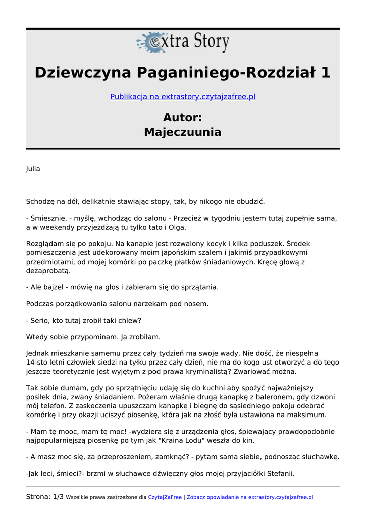 Dziewczyna Paganiniego-Rozdział 1 Publikacja na extrastory.czytajzafree.pl Autor: Majeczuunia Julia Schodzę na dół, delikatnie stawiając stopy, tak, by nikogo nie obudzić. - Śmiesznie, - myślę, wchodząc do salonu - Przecież w tygodniu jestem tutaj zupełnie sama, a w weekendy przyjeżdżają tu tylko tato i Olga. Rozglądam się po pokoju. Na kanapie jest rozwalony kocyk i kilka poduszek. Środek pomieszczenia jest udekorowany moim japońskim szalem i jakimiś przypadkowymi przedmiotami, od mojej komórki po paczkę płatków śniadaniowych. Kręcę głową z dezaprobatą. - Ale bajzel - mówię na głos i zabieram się do sprzątania. Podczas porządkowania salonu narzekam pod nosem. - Serio, kto tutaj zrobił taki chlew? Wtedy sobie przypominam. Ja zrobiłam. Jednak mieszkanie samemu przez cały tydzień ma swoje wady. Nie dość, że niespełna 14-sto letni człowiek siedzi na tyłku przez cały dzień, nie ma do kogo ust otworzyć a do tego jeszcze teoretycznie jest wyjętym z pod prawa kryminalistą? Zwariować można. Tak sobie dumam, gdy po sprzątnięciu udaję się do kuchni aby spożyć najważniejszy posiłek dnia, zwany śniadaniem. Pożeram właśnie drugą kanapkę z baleronem, gdy dzwoni mój telefon. Z zaskoczenia upuszczam kanapkę i biegnę do sąsiedniego pokoju odebrać komórkę i przy okazji uciszyć piosenkę, która jak na złość była ustawiona na maksimum. - Mam tę mooc, mam tę moc! -wydziera się z urządzenia głos, śpiewający prawdopodobnie najpopularniejszą piosenkę po tym jak "Kraina Lodu" weszła do kin. - A masz moc się, za przeproszeniem, zamknąć? - pytam sama siebie, podnosząc słuchawkę. -Jak leci, śmieci?- brzmi w słuchawce dźwięczny głos mojej przyjaciółki Stefanii. Strona: 1/3 Wszelkie prawa zastrzeżone dla CzytajZaFree | Zobacz opowiadanie na extrastory.czytajzafree.pl - Spoko, ale śmieci mają jedno pytanie. Dlaczego, do diabła, dzwonisz o ósmej rano w wakacje?! - Ty, kurde, ósma jest? A ja myślałam, że później. - Bo ty myśli zostawiłaś w tym nieszczęsnym Nowym Jorku i dlatego kiedy my idziemy Nowym Światem, ty się przechadzasz 5 Aleją. - Sorka. Ale no wiesz, gdybyś też taką podróż odbyła... - Stefa, najdalej jak ja mogę sobie pomarzyć, to najwyżej Szklarska Poręba. - Oj daj już spokój. Co, a w Czechach nie byłaś? - Byłam, byłam. Dobra, mów co chciałaś, bo chyba kompletnie odbiegłyśmy od tematu. - No tak. A więc... Dzisiaj na twój występ przyjdzie nowy kolega! Wzdycham ze smutkiem. - Stefcia... Ty wiesz, co ja o tym sądzę. A jak się dowie? Jeszcze mnie za jakąś dziwaczkę weźmie. - Nie weźmie, przysięgam. To stary kumpel Karola. Zresztą... Czytałam twój horoskop. Dziś to dla ciebie dzień zmieniający przyszłość. - Czyżby? - Uwierz. Gwiazdy nie kłamią, a już szczególnie nie twoje. Zdaj się na los, Jula. Uśmiecham się pod nosem. Nabieram powietrza w płuca i mówię: - Dobra, kochana. Muszę kończyć. Jak chcę dobrze wypaść przed tym gościem to muszę poćwiczyć. Stefa żegna się ze mną i odkładam telefon na szafkę. Przeciągam się i idę na górę wziąć prysznic, ubrać się i przygotować do dzisiejszego występu. Przygotowania zajmują mi około pół godziny. Wchodzę do pokoju i patrzę na zegar. Jest w pół do dziewiątej, konkurs zaczyna się o dziesiątej. Skoro muszę być na miejscu 20 minut przed startem, a dojazd na miejsce zajmuje około 15 minut, a muszę mieć jeszcze spokojne 10 minut, żeby spotkać się z Stefą, Karolem i tym gostkiem z obozu, to mam około 40 minut na ćwiczenia zanim będę zmuszona opuścić moje zacisze domowe. Wyłamuję palce i chwytam za smyczek, leżący na biurku. Otwieram etui i wyjmuję z niego moje skrzypce. Biorę głęboki oddech, I przykładam smyczek do strun. I tak znikam na parędziesiąt minut, kompletnie zanurzając się w oceanie muzyki, który mnie spowija. To takie piękne uczucie, słyszeć słodkie dźwięki pływające w powietrzu i wiedzieć, że gdyby nie ty, nie byłoby ich tu. Ale wszystko co piękne kiedyś się kończy. I ja muszę schować drogi memu sercu instrument z powrotem do etui, obok niego włożyć smyczek i zamknąć wieczko, opuszczając zawartość aż do następnego razu, kiedy będę grać. Ale akurat teraz nie mogę się tym jarać, gdyż po raz kolejny sprawdzam, czy w mojej torebce zawsze mam portfel, telefon, lekarstwa i klucze. Po raz pierwszy w swoim życiu, ja, Julia Amoniec, nie muszę wywracać całego domu do góry nogami aby znaleźć jedną z tych rzeczy. Strona: 2/3 Wszelkie prawa zastrzeżone dla CzytajZaFree | Zobacz opowiadanie na extrastory.czytajzafree.pl - Jestem Bogiem! - krzyczę na całe gardło, zarzucając torbę na ramię i wybiegając z mieszkania. Dopiero na klatce schodowej orientuję się, że nie wzięłam skrzypiec. Rozglądam się nerwowo. Patrzę na zegarek po raz setny. Dokładnie tutaj umówiłam się ze Stefą I Karolem, a tu zastała mnie miło wyglądająca staruszka i dwóch małych knypków, łażących po drzewach. Z nudów postanawiam do nich dołączyć. Bawimy się w najlepsze przez około 5 minut, gdy słyszę z dołu głos: - Jula! Gdzie cię wcięło?! Halooo?! A zaraz potem: - Pół tonu ciszej, Stefka. Ona gdzieś tutaj jest. -Jestem! - Wykrzykuję, na wpół schodząc, wpół spadając z drzewa. Otrzepuję sukienkę i spoglądam. Widzę energicznie machająca Stefę, Karola, teraz do zmylenia przypominającego kucyka Pony po świeżym zafarbowaniu włosów na różowo, oraz jakiegoś ciemnowłosego chłopaka, opierającego się na kulach. Strona: 3/3 Wszelkie prawa zastrzeżone dla CzytajZaFree | Zobacz opowiadanie na extrastory.czytajzafree.pl