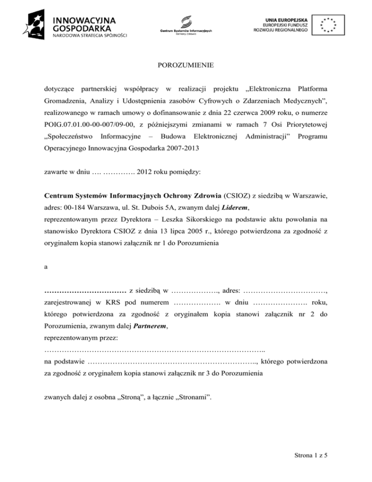 POROZUMIENIE dotyczące partnerskiej współpracy w realizacji projektu „Elektroniczna Platforma Gromadzenia, Analizy i Udostępnienia zasobów Cyfrowych o Zdarzeniach Medycznych”, realizowanego w ramach umowy o dofinansowanie z dnia 22 czerwca 2009 roku, o numerze POIG.07.01.00-00-007/09-00, z późniejszymi zmianami w ramach 7 Osi Priorytetowej „Społeczeństwo Informacyjne – Budowa Elektronicznej Administracji” Programu Operacyjnego Innowacyjna Gospodarka 2007-2013 zawarte w dniu …. …………. 2012 roku pomiędzy: Centrum Systemów Informacyjnych Ochrony Zdrowia (CSIOZ) z siedzibą w Warszawie, adres: 00-184 Warszawa, ul. St. Dubois 5A, zwanym dalej Liderem, reprezentowanym przez Dyrektora – Leszka Sikorskiego na podstawie aktu powołania na stanowisko Dyrektora CSIOZ z dnia 13 lipca 2005 r., którego potwierdzona za zgodność z oryginałem kopia stanowi załącznik nr 1 do Porozumienia a …………………………… z siedzibą w ………………., adres: ……………………………, zarejestrowanej w KRS pod numerem ………………. w dniu …………………. roku, którego potwierdzona za zgodność z oryginałem kopia stanowi załącznik nr 2 do Porozumienia, zwanym dalej Partnerem, reprezentowanym przez: …………………………………………………………………………….. na podstawie ………………………………………………………….., którego potwierdzona za zgodność z oryginałem kopia stanowi załącznik nr 3 do Porozumienia zwanych dalej z osobna „Stroną”, a łącznie „Stronami”. Strona 1 z 5 Preambuła Zważywszy, że: 1) Centrum Systemów Informacyjnych Ochrony Zdrowia (Lider) jest Beneficjentem umowy o dofinansowanie z dnia 22 czerwca 2009 r., nr POIG.07.01.00-00-007/09-00, z późniejszymi zmianami w ramach 7 Osi Priorytetowej „Społeczeństwo Informacyjne – Budowa Elektronicznej Administracji” Programu Operacyjnego Innowacyjna Gospodarka 2007-2013, w ramach której realizuje projekt „Elektroniczna Platforma Gromadzenia, Analizy i Udostępnienia zasobów Cyfrowych o Zdarzeniach Medycznych”; 2) …………………………. (Partner) jest interesariuszem Projektu realizującym zadania zgodnie z przedmiotem działalności; 3) Intencją Stron Porozumienia jest partnerska współpraca przy realizacji Projektu, w sposób gwarantujący, osiągnięcie spójności i integralność współdziałania produktów Projektu, oraz spójność i integralność współdziałania Projektu z jego otoczeniem. W związku z powyższym, Strony Porozumienia ustalają co następuje: § 1 Definicje Ilekroć w Porozumieniu jest mowa o: a) Beneficjencie – należy przez to rozumieć Ministerstwo Zdrowia/Centrum Systemów Informacyjnych Ochrony Zdrowia realizujące Projekt w ramach umowy o dofinansowanie; b) Grupie Doradczej Użytkowników – należy przez to rozumieć strukturę organizacyjną w ramach Nadzoru której jednym z zadań jest zapewnienie, że określenie potrzeb użytkowników projektu jest dokładne, pełne i jednoznaczne. c) Komitecie Sterującym Projektu – należy przez to rozumieć komitet sterujący w rozumieniu metodyki PRINCE 2 działający na podstawie Zarządzenia Dyrektora Centrum Systemów Informacyjnych Ochrony Zdrowia nr 14/2010 z dnia 25 lutego 2010 r. sprawie powołania Komitetu Sterującego do spraw budowy Elektronicznej Platformy Gromadzenia, Analizy i Udostępniania Zasobów Cyfrowych o Zdarzeniach Medycznych; Strona 2 z 5 d) Metodyce PRINCE 2 - należy przez to rozumieć koncepcję zarządzania projektami przyjętą dla Projektu w Studium Wykonalności; e) Projekcie – należy przez to rozumieć projekt Elektroniczna Platforma Gromadzenia, Analizy i Udostępniania Zasobów Cyfrowych o Zdarzeniach Medycznych realizowany w oparciu o umowę o dofinansowanie; f) Strukturze Organizacyjnej Projektu – należy przez to rozumieć dokument wynikający z metodyki PRINCE 2, zatwierdzony przez Komitet Sterujący Projektu; g) Umowie o dofinansowanie – należy przez to rozumieć umowę z dnia 22 czerwca 2009 r., nr POIG.07.01.00-00-007/09-00, z późniejszymi zmianami, w ramach 7 Osi Priorytetowej „Społeczeństwo Informacyjne – Budowa Elektronicznej Administracji” Programu Operacyjnego Innowacyjna Gospodarka 2007-2013, zawartą pomiędzy Beneficjentem a Instytucją Wdrażającą – Władzą Wdrażającą Programy Europejskie. § 2 Przedmiot Porozumienia Przedmiotem Porozumienia jest określenie zasad współpracy poprzez zagwarantowanie udziału merytorycznego przedstawicieli Partnera przy realizacji Projektu w celu zwiększenia skuteczności realizacji Projektu, poprzez zapewnienie spójności i integralności projektowanych produktów Projektu określonych w Studium Wykonalności. § 3 Okres obowiązywania Porozumienia Porozumienie zostaje zawarte na czas trwania Projektu i obowiązuje od dnia podpisania przez Strony. § 4 Zakres odpowiedzialności Strony Porozumienia ponoszą odpowiedzialność za prawidłową – w tym terminową i odpowiednią co do poziomu jakości - realizację Porozumienia, każda w części i zakresie określonym w Porozumieniu i dokumentach opracowanych na podstawie Porozumienia. Strona 3 z 5 § 5 Zakres obowiązków Lidera Lider zobowiązany jest do: 1) realizacji obowiązków Beneficjenta określonych w Umowie o dofinansowanie; 2) reprezentowania Stron w kontaktach z innymi podmiotami oraz osobami trzecimi w zakresie objętym Porozumieniem; 3) gromadzenia, a następnie archiwizacji dokumentacji związanej z realizacją Porozumienia; 4) zapewnienia mechanizmu sprawnej komunikacji i przepływu informacji pomiędzy Stronami; 5) zagwarantowania udziału przedstawiciela Partnera w Grupie Doradczej Użytkowników; 6) umożliwienia dostępu do dokumentacji Projektu przedstawicielom Partnera. § 6 Zakres obowiązków Partnera Partner zobowiązany jest do: 1) aktywnego uczestnictwa i współpracy przy realizacji Projektu w zakresie opiniowania doku