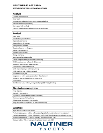 NAUTINER 40 AFT CABIN SPECYFIKACJA WERSJI STANDARDOWEJ Kadłub Laminat monolityczny Kolor biały Laminatowa wkładka denna usztywniająca kadłub Ster strumieniowy dziobowy Szare pasy linii wodnej Pomost kąpielowy z powierzchnią przeciwślizgową Pokład Kolor biały Konstrukcja przekładkowa 2 pokłady słoneczne Dwa półkosze dziobowe Dwa pólkosze rufowe Słupki relingowe z relingiem 6 knag cumowniczych 2 półkluzy na dziobie Reling dachowy Mocowanie kotwicy z rolką 1 duży luk pokładowy w kabinie dziobowej 2 luki nieotwierane w kabinie dziobowej po 1 luku otwieranym w każdym WC 1 otwierany bulaj w kambuzie 1 luk nieotwierany w kabinie rufowej 1 luk otwierany w kabinie rufowej Światła nawigacyjne Magazyn na butlę gazową zamykany drzwiczkami Reling na pomost kąpielowy ze stopniami Kaczy dziób Nierdzewny wlew paliwa, wody czystej i pobór wody brudnej Sterówka zewnętrzna Fotel sternika Konsola z kierownicą Zejściówka zamykana drzwiami i suwklapą Elektryczny sygnał dźwiękowy Oświetlenie stanowiska sterowania Próg zejściówki okuty listwą ze stali nierdzewnej Wnętrze Wybudowa wnętrza w mahoniu Podwójna zamykana kabina rufowa z szafą, jaskółkami zamykanymi i siedziskami Podwójna zamykana kabina dziobowa z szafą, jaskółkami zamykanymi i siedziskami Dziobowa kabina WC, z ręczną toaletą i zbiornikiem min. 50 l Rufowa kabina WC, z ręczną toaletą i zbiornikiem min. 50 l Kambuz ze zlewozmywakiem Kuchenka gazowa dwupalnikowa Lodówka 75 l 2 kosze na smieci Bakisty pod materacami Wykładzina dywanowa Prostokatny stół w mesie z sofą i oparciami Szafki i jaskółki zamykane Tapicerka do wyboru Instalacja wodna Zbiornik wody pitnej 220 l Instalacja ciepłej i zimnej wody Bojler 30l 1 elektryczna pompa ciśnieniowa 1 elektryczna automatyczna pompa zęzowa 1 pompa zęzowa ręczna Instalacja elektryczna 12V/230V Bateria akumulatorów 300AH Rozdzielnia 12 punktowa Oświetlenie sufitowe wszystkich kabin (25 punktów świetlnych) 2 gniazda 230V 1 gniazdo 12V przy rozdzielni Ładowarka 230/12V z kablem 20 m i gniazdem, 30 A Silnik Silnik 30KM Zbiornik paliwa min. 73litry Dane techniczne Długość maksymalna [m] Długość kadłuba [m] szerokość maksymalna [m] Szerokość kadłuba [m] zanurzenie [m] Wysokość ponad KLW (bez bimini) wysokość w messie i kabinach [m] wysokość w sterówce [m] waga jachtu [kg] balast [kg] załoga/koje 8 [osób] Rejon żeglugi 12,70 11,50 3,71 3,50 0,75 2,85 1,97 2,00 7500 2500 4-8 C