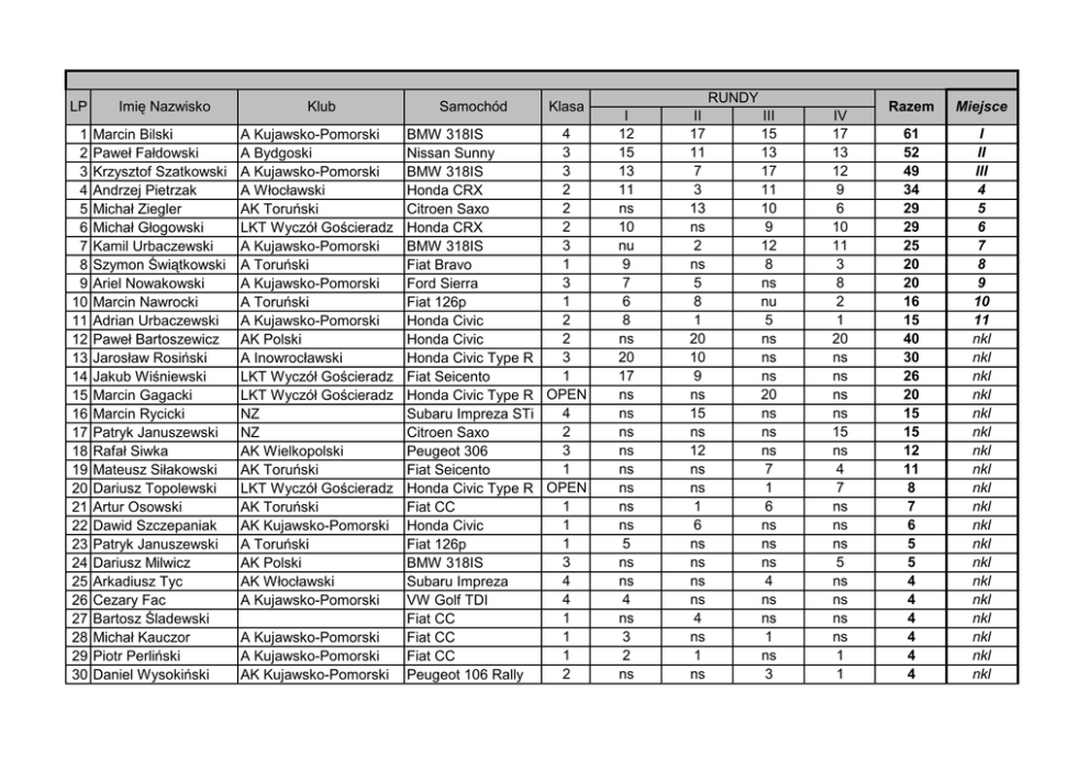LP 1 2 3 4 5 6 7 8 9 10 11 12 13 14 15 16 17 18 19 20 21 22 23 24 25 26 27 28 29 30 Imię Nazwisko Marcin Bilski Paweł Fałdowski Krzysztof Szatkowski Andrzej Pietrzak Michał Ziegler Michał Głogowski Kamil Urbaczewski Szymon Świątkowski Ariel Nowakowski Marcin Nawrocki Adrian Urbaczewski Paweł Bartoszewicz Jarosław Rosiński Jakub Wiśniewski Marcin Gagacki Marcin Rycicki Patryk Januszewski Rafał Siwka Mateusz Siłakowski Dariusz Topolewski Artur Osowski Dawid Szczepaniak Patryk Januszewski Dariusz Milwicz Arkadiusz Tyc Cezary Fac Bartosz Śladewski Michał Kauczor Piotr Perliński Daniel Wysokiński Klub A Kujawsko-Pomorski A Bydgoski A Kujawsko-Pomorski A Włocławski AK Toruński LKT Wyczół Gościeradz A Kujawsko-Pomorski A Toruński A Kujawsko-Pomorski A Toruński A Kujawsko-Pomorski AK Polski A Inowrocławski LKT Wyczół Gościeradz LKT Wyczół Gościeradz NZ NZ AK Wielkopolski AK Toruński LKT Wyczół Gościeradz AK Toruński AK Kujawsko-Pomorski A Toruński AK Polski AK Włocławski A Kujawsko-Pomorski A Kujawsko-Pomorski A Kujawsko-Pomorski AK Kujawsko-Pomorski Samochód Klasa 4 BMW 318IS 3 Nissan Sunny 3 BMW 318IS 2 Honda CRX 2 Citroen Saxo 2 Honda CRX 3 BMW 318IS 1 Fiat Bravo 3 Ford Sierra 1 Fiat 126p 2 Honda Civic 2 Honda Civic 3 Honda Civic Type R 1 Fiat Seicento Honda Civic Type R OPEN 4 Subaru Impreza STi 2 Citroen Saxo 3 Peugeot 306 1 Fiat Seicento Honda Civic Type R OPEN 1 Fiat CC 1 Honda Civic 1 Fiat 126p 3 BMW 318IS 4 Subaru Impreza 4 VW Golf TDI 1 Fiat CC 1 Fiat CC 1 Fiat CC 2 Peugeot 106 Rally RUNDY I 12 15 13 11 ns 10 nu 9 7 6 8 ns 20 17 ns ns ns ns ns ns ns ns 5 ns ns 4 ns 3 2 ns II 17 11 7 3 13 ns 2 ns 5 8 1 20 10 9 ns 15 ns 12 ns ns 1 6 ns ns ns ns 4 ns 1 ns III 15 13 17 11 10 9 12 8 ns nu 5 ns ns ns 20 ns ns ns 7 1 6 ns ns ns 4 ns ns 1 ns 3 IV 17 13 12 9 6 10 11 3 8 2 1 20 ns ns ns ns 15 ns 4 7 ns ns ns 5 ns ns ns ns 1 1 Razem Miejsce 61 52 49 34 29 29 25 20 20 16 15 40 30 26 20 15 15 12 11 8 7 6 5 5 4 4 4 4 4 4 I II III 4 5 6 7 8 9 10 11 nkl nkl nkl nkl nkl nkl nkl nkl nkl nkl nkl nkl nkl nkl nkl nkl nkl nkl nkl 31 32 33 34 35 36 37 38 39 Łukasz Matusiak Dawid Pracz Tomasz Jędrzejczak Piotr Perliński Łukasz Bednarek Łukasz Kuraśkiewicz Wojciech Hirsch Waldemar Nowak Mirosław Witkowski 1 2 3 4 5 6 7 8 9 10 11 12 KLASA 1 Szymon Świątkowski Marcin Nawrocki Piotr Perliński Jakub Wiśniewski Mateusz Siłakowski Łukasz Matusiak Michał Kauczor Dawid Szczepaniak Bartosz Śladewski Patryk Januszewski Tomasz Jędrzejczak Artur Osowski 1 2 3 4 5 6 7 8 KLASA 2 Andrzej Pietrzak Michał Głogowski Michał Ziegler Adrian Urbaczewski Paweł Bartoszewicz Daniel Wysokiński Patryk Januszewski Artur Osowski Fiat SC Peugeot 206 Honda Civic Fiat CC Honda Civic Honda Civic Subaru Impreza Seat Leon Mitsubishi Lancer 1 3 1 1 2 2 4 3 4 ns ns ns ns ns ns ns ns nu 1 1 1 1 ns ns ns ns ns 2 ns ns ns ns ns ns ns ns ns ns ns ns 1 1 1 1 ns 3 1 1 1 1 1 1 1 0 nkl nkl nkl nkl nkl nkl nkl nkl nkl AK Toruński Fiat Bravo Fiat 126p Fiat CC Fiat Seicento Fiat Seicento Fiat SC Fiat CC Honda Civic Fiat cc Fiat 126p Honda Civic Fiat CC 1 1 1 1 1 1 1 1 1 1 1 1 17 15 11 20 ns ns 12 ns ns 13 ns ns ns 17 9 20 ns 11 ns 15 13 ns 12 10 20 nkl ns ns 17 15 13 ns ns ns ns ns 17 15 13 ns 20 ns ns ns ns ns ns ns 54 47 33 40 37 26 25 15 13 13 12 10 I II III nkl nkl nkl nkl nkl nkl nkl nkl nkl A Włocławski LKT Wyczół Gościeradz AK Toruński A Kujawsko-Pomorski AK Polski AK Kujawsko-Pomorski NZ AK Toruński Honda CRX Honda CRX Citroen Saxo Honda Civic Honda Civic Peugeot 106 Rally Citroen Saxo Honda Civic 2 2 2 2 2 3 2 2 20 17 ns 15 ns ns ns ns 15 ns 17 2 20 ns ns ns 20 15 17 12 ns 12 ns 13 13 15 11 9 20 10 17 ns 68 47 45 38 40 22 17 13 I II III 4 nkl nkl nkl nkl AK Bydgoski AK Bydgoski AK Kujawsko-Pomorski A Toruński A Toruński A Toruński A Kujawsko-Pomorski LKT Wyczół Gościeradz AK Toruński AK Bydgoski A Kujawsko-Pomorski AK Kujawsko-Pomorski A Toruński 9 10 11 12 Ariel Nowakowski Daniel Wysokiński Łukasz Bednarek Łukasz Kuraśkiewicz AK Kujawsko-Pomorski AK Kujawsko-Pomorski NZ NZ Honda CRX Peugeot 106 Rally Honda Civic Honda Civic 2 2 2 2 ns ns ns ns ns ns ns ns ns 11 ns ns 12 ns 8 7 12 11 8 7 nkl nkl nkl nkl 1 2 3 4 5 6 7 8 9 KLASA 3 Paweł Fałdowski Krzysztof Szatkowski Kamil Urbaczewski Jarosław Rosiński Ariel Nowakowski Rafał Siwka Dariusz Milwicz Waldemar Nowak Dawid Pracz A Bydgoski A Kujawsko-Pomorski A Kujawsko-Pomorski A Inowrocławski A Kujawsko-Pomorski AK Wielkopolski AK Polski NZ AK Bydgoski Nissan Sunny BMW 318IS BMW 318IS Honda Civic Type R Ford Sierra Peugeot 306 BMW 318IS Seat Leon Peugeot 206 3 3 3 3 3 3 3 3 3 17 15 nu 20 13 ns ns ns ns 17 13 11 15 12 20 ns ns 10 17 20 15 ns ns ns ns ns ns 20 17 15 ns ns ns 13 12 ns 71 65 41 35 25 20 13 12 10 I II III nkl nkl nkl nkl nkl nkl 1 2 3 4 5 6 KLASA 4 Marcin Bilski Marcin Rycicki Arkadiusz Tyc Dariusz Topolewski Wojciech Hirsch Mirosław Witkowski A Kujawsko-Pomorski NZ AK Włocławski LKT Wyczół Gościeradz NZ A Toruński BMW 318IS Subaru Impreza STi Subaru Impreza Porsche 911 Carrera Subaru Impreza Mitsubishi Lancer 4 4 4 4 4 4 20 ns ns ns ns nu 20 17 ns ns ns ns 20 ns 17 ns ns ns 20 ns ns 17 15 ns 80 17 17 17 15 0 I nkl nkl nkl nkl nkl ns ns ns ns 20 17 ns ns 20 17 nkl nkl KLASA OPEN 1 Marcin Gagacki 2 Dariusz Topolewski LKT Wyczół Gościeradz Honda Civic Type R OPEN LKT Wyczół Gościeradz Honda Civic Type R OPEN