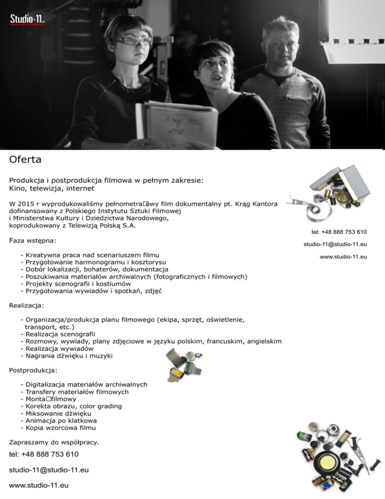 Oferta Produkcja i postprodukcja filmowa w pełnym zakresie: Kino, telewizja, internet W 2015 r wyprodukowaliśmy pełnometrażowy film dokumentalny pt. Krąg Kantora dofinansowany z Polskiego Instytutu Sztuki Filmowej i Ministerstwa Kultury i Dziedzictwa Narodowego, koprodukowany z Telewizją Polską S.A. tel: +48 888 753 610 Faza wstępna: - Kreatywna praca nad scenariuszem filmu Przygotowanie harmonogramu i kosztorysu Dobór lokalizacji, bohaterów, dokumentacja Poszukiwania materiałów archiwalnych (fotograficznych i filmowych) Projekty scenografii i kostiumów Przygotowania wywiadów i spotkań, zdjęć Realizacja: - Organizacja/produkcja planu filmowego (ekipa, sprzęt, oświetlenie, transport, etc.) - Realizacja scenografii - Rozmowy, wywiady, plany zdjęciowe w języku polskim, francuskim, angielskim - Realizacja wywiadów - Nagrania dźwięku i muzyki Postprodukcja: - Digitalizacja materiałów archiwalnych Transfery materiałów filmowych Montaż filmowy Korekta obrazu, color grading Miksowanie dźwięku Animacja po klatkowa Kopia wzorcowa filmu Zapraszamy do współpracy. tel: +48 888 753 610 [email protected] www.studio-11.eu [email protected] www.studio-11.eu