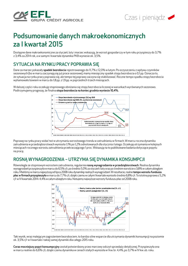 Podsumowanie danych makroekonomicznych za I kwartał 2015 Dostępne dane makroekonomiczne za styczeń, luty i marzec wskazują, że wzrost gospodarczy w tym roku przyspieszy do 3,7% z 3,4% za 2014 rok, a w samym I kwartale dynamika PKB wyniesie ok. 3,5%. SYTUACJA NA RYNKU PRACY POPRAWIA SIĘ Dane za marzec pokazały spadek bezrobocia rejestrowanego do 11,7% z 12,0% w lutym. Po oczyszczeniu z wpływu czynników sezonowych (bo w marcu zaczynają się już prace sezonowe), mamy miesięczny spadek stopy bezrobocia o 0,1 pp. Oznacza to, że sytuacja na rynku pracy poprawia się, ale tempo tej poprawy zaczyna się stabilizować. Roczne tempo spadku stopy bezrobocia wyhamowało bowiem w marcu do 1,8 pp. z 1,9 pp. w poprzednich trzech miesiącach. W dalszej części roku oczekuję stopniowego obniżania się stopy bezrobocia liczonej w warunkach wyrównanych sezonowo. Podtrzymujemy prognozę, że finalna stopa bezrobocia na koniec grudnia wyniesie 10,4%. Poprawę na rynku pracy widać też w utrzymaniu wzrostowego trendu w zatrudnieniu w firmach. W marcu roczna dynamika zatrudnienia w przedsiębiorstwach wyniosła 1,1% po 1,2% odnotowanych dla stycznia i lutego. Oczekuję utrzymania w kolejnych miesiącach rocznego wzrostu zatrudnienia przekraczającego 1 proc. Wskazują na to publikowane badania dotyczące popytu na pracę. ROSNĄ WYNAGRODZENIA – UTRZYMA SIĘ DYNAMIKA KONSUMPCJI Równolegle ze stopniowym wzrostem zatrudnienia, regularnie rosną wynagrodzenia w przedsiębiorstwach. Realna dynamika wynagrodzeń przyspieszyła w marcu do 6,5% r/r, po średnio 5,0% za styczeń i luty oraz po średnim wzroście o 3,8% w całym ubiegłym roku. Mieliśmy w marcu najwyższą od lipca 2008 roku dynamikę realnych wynagrodzeń. W rezultacie, realne tempo wzrostu funduszu płac w firmach przyspieszyło w marcu do 7,7% r/r, dzięki czemu w całym I kwartale wyniosło średnio 6,8% r/r. To istotna poprawa z 5,2% r/r w IV kwartale 2014 i 4,4% w całym ubiegłym roku. Notujemy najwyższe wzrosty funduszu płac od 2008 roku. Taki wynik, wraz malejącym zagrożeniem bezrobociem, to bardzo silne wsparcie dla utrzymania dynamiki konsumpcji na poziomie ok. 3,5% r/r w I kwartale i takiej samej dynamiki dla całego 2015 roku. Coraz mocniejszy popyt konsumpcyjny został potwierdzony przez marcowy odczyt sprzedaży detalicznej. Przyspieszyła ona w marcu realnie do 6,6% r/r, dzięki czemu dynamika w cenach stałych wyniosła w I kw. br. 4,4%, po 3,7% w IV kw. ub. roku. Marcowy wynik sprzedaży detalicznej w części został podbity przez Święta Wielkanocne, dzięki czemu realne wydatki na żywność wzrosły o 14,1% r/r. Mieliśmy jednak jednocześnie istotny wzrost w kategoriach obejmujących dobra trwałego użytku (rzędu 10% r/r), co zapowiada stabilny wzrost popytu konsumpcyjnego w kolejnych miesiącach. Uważam, że dynamika sprzedaży detalicznej będzie stopniowo rosła w kolejnych miesiącach, głównie za sprawą dalszej poprawy na rynku pracy. Konsumpcję wspierać też będą dobre nastroje konsumentów, co pokazuje wysoka wartość publikowanego przez GUS bieżącego wskaźnika ufności konsumenckiej. PRODUKCJA PRZEMYSŁOWA WZROSŁA O 4,9% w IQ 2015 Odczyty PMI sektora przemysłowego w Polsce zapowiadają dalszy silny wzrost aktywności w przemyśle w całym 2015 roku. Indeks ten w marcu utrzymał się na relatywnie wysokim poziomie: 54,8 pkt., po 55,1 pkt. w lutym i 55,2 w styczniu. Co więcej, w marcu utrzymała się bardzo korzystna struktura wskaźnika PMI. Po pierwsze, mieliśmy najwyższy w historii badań (ex aequo ze styczniem 2014 r) odczyt dla składowej zatrudnienia. Po drugie, od sześciu miesięcy firmy pokazują wyraźny wzrost nowych zamówień (w tym szczególnie z eksportu), dzięki czemu składowa dotycząca bieżącej produkcji utrzymuje się na bardzo wysokim poziomie. Wyniki przemysłu za marzec potwierdzają stopniowy wzrost aktywności i są zgodne z notowaną od pół roku poprawą PMI dla sektora przemysłowego. Wyrównana sezonowo dynamika produkcji przemysłowej wyniosła w marcu 6,0% r/r, po 4,0% i 4,7% odpowiednio w styczniu i lutym. W I kwartale produkcja rosła średnio o 4,9%, co było wyraźną poprawę w stosunku do II połowy 2014, kiedy to dynamika przemysłu wyniosła średnio 1,9% r/r. Marcową dynamikę wciąż zawdzięczamy przede wszystkim branżom o znacznym udziale eksportu w przychodach ze sprzedaży. Widać więc, że obserwowana obecnie poprawa koniunktury w strefie euro jest mocnym wsparciem dla naszego eksportu, a spadek popytu z Rosji i Ukrainy nie ma już tak negatywnego wpływu na aktywność gospodarczą w Polsce. Z punktu widzenia inwestycji finansowanych leasingiem, ważne, że bardzo dobre wyniki w marcu osiągnęło przetwórstwo przemysłowe: wzrost o 9,6% r/r, po 6,6% w lutym. Taki wynik przetwórstwa świadczy, że marcowy skok produkcji (łącznie +8,8% r/r wg danych niewyrównanych sezonowo) nie jest tylko zdarzeniem statystycznym, ale już trwałą tendencją. Oczekuję, że wyniki przemysłu w dalszej części roku w coraz większym stopniu będą wynikały z kontrybucji popytu krajowego. Odczyty PMI wskazują, że dynamika produkcji przemysłowej w II kwartale przyspieszy do ok. 6% z 4,9% r/r za I kwartał br, a w IV kwartale możemy już zobaczyć dynamikę na poziomie ok. 7,5% r/r. Utrzymujemy prognozę dynamiki produkcji przemysłowej w całym 2015 roku na poziomie 6,3% r/r. Europejski Fundusz Leasingowy SA z siedzibą we Wrocławiu, 53-605 Wrocław, pl. Orląt Lwowskich 1 zarejestrowany w Sądzie Rejonowym dla Wrocławia-Fabrycznej we Wrocławiu, VI Wydział Gospodarczy Krajowego Rejestru Sądowego pod nr KRS: 0000026609 NIP: 897-001-26-57. Wysokość kapitału zakładowego: 674.112.374,73 zł wpłacony w całości. OTOCZENIE ZAGRANICZNE I WYNIKI EKSPORTU Odbudowa koniunktury w strefie euro jest kluczową determinantą dla naszego eksportu. Publikowane w kwietniu dane miesięczne o aktywności gospodarczej wskazują na scenariusz cora
