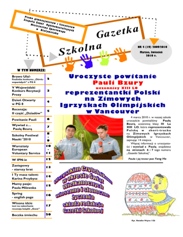 Pism o gim Zesp nazj ołu Szkó al istów i l ł Mist rzos Ogólnok icealistó twa szta łcąc w Sp w B ych iałym ortoweg o stok u Sz a k t e Ga z a n l o k NR 4 (19) 2009/2010 Marzec, kwiecień 2010 r. W TYM NUMERZE: Brawo Ula!finalistka konkursu ,,Ośmiu wspaniałych” z PG 8 2 V Wojewódzki Konkurs Recytacji Prozy 3 Dzień Otwarty w PG 8 4 Recenzja: II część ,,Dziadów” 5 Powitanie Pauli 6 Wywiad z… Paulą Bzurą 7 Szkolny Festiwal Nauki ’2010 8 9 Warsztaty European Voluntary Service 10 11 W IPN-ie 12 Zastępowy - starszy brat 13 I Ty masz talent: Karina Przybysz 14 Mamy pasje: Paula Milewska 15 Spring - english page 16 Wiosna idzie test na zakochanie recenzja ksiąŜki ,,Gone” 17 Beczka śmiechu 20 Uroczyste powitanie Pauli Bzury u czenn icy XIII LO reprezentantki Polski na Zimowych Igrzyskach Olimpijskich w Vancouver 4 marca 2010 r. w naszej szkole uroczyście powitaliśmy Paulę Bzurę, uczennicę klasy III La XIII LO, która reprezentowała Polskę w short-tracku na Zimowych Igrzyskach Olimpijskich w Vancouver, zajmując 14 miejsce. Więcej informacji o uroczystości i wywiad z Paulą znajdziesz na stronach 6 i 7 tego numeru ,,Gazetki Szkolnej”. Paula i jej trener pan Yang He Rys. Natalka Wojno I Gb PISMO GIMNAZJALISTÓW I LICEALISTÓW ZSOMS W BIAŁYMSTOKU Zdarzyło się... Katastrofa „Titanica" 15 kwietnia 1912 Upadek stacji kosmicznej „Mir” 23 marca 2001 W nocy 23 marca 2001 r. mieszkańcy Wysp FidŜi mieli okazję zobaczyć niecodzienne zjawisko. Na niebie pojawiła się lecąca z duŜą prędkością kula, a chwilę potem rozpoczęła się seria eksplozji. Tak wyglądało zepchnięcie z orbity rosyjskiej stacji kosmicznej MIR, której szczątki spłonęły w atmosferze i spadły do Pacyfiku. Ok. godz. 130 sterczący juŜ niemal pionowo "Titanic" przełamał się na dwie części. Szczątki statku osiadły na dnie na głębokości ok. 4000 m w odległości ok. 400 mil morskich na południowy wschód od nowej Funlandii. Była to najgłośniejsza katastrofa morska na początku XX w. Pierwsza zmiana czasu zimowego na letni 30 kwietnia 1916 Idea zmiany czasu zimowego na letni – a następnie letniego na zimowy – została po raz pierwszy wcielona w Ŝycie w Niemczech podczas I wojny światowej. W nocy 30 kwietnia 1916 r. wskazówki niemieckich zegarów zost ały posunięte o godzinę do przodu, a 1 października tego samego roku cofnięte o godzinę wstecz. Opr. Kamila Golc I Gb XX Olimpiada Teologii Katolickiej Brawo Ula!!! 11 marca 2010 r. w siedzibie Centrum Formacji Chrześcijańskiej Laikatu im. Ks. M. Sopoćki przy ul. Warszawskiej 50 w Białymstoku odbyły się eliminacje diecezjalne XX Olimpiady Teologii Katolickiej. Zorganizowano je we współpracy Wydziału Katechetycznego Kurii Metropolitalnej Białostockiej i Zespołu Szkół Ogólnokształcących Mistrzostwa Sportowego w Białymstoku. 24 marca 2010 r. w sali Kina Forum odbyła się Uroczysta Gala XV białostockiej edycji Samorządowego Konkursu Nastolatków „Ośmiu Wspaniałych”. Pomysłodawcą, jednocześnie koordynatorem ogólnopolskiego Konkursu jest Fundacja "Świat na TAK", zaś honorowy patronat nad ideą konkursu objął Ks. Kardynał Józef Glemp Prymas Polski. Tegoroczna, jubileuszowa edycja OTK przebiegała pod hasłem „Bądźmy świadkami miłości i sprawiedliwości społecznej”. Uczestniczyło w niej 33 uczniów z 15 szkół ponadgimnazjalnych, wśród których byli równieŜ uczniowie XIII LO: Kamila Boguszewska i Piotrek Drewnowski (II Ld) oraz Magda Zawadzka (III Le). Mimo iŜ nie zajęli czołowych miejsc, to naleŜą się im słowa uznania, za zainteresowanie się trudną problematyką teologiczno-religijną z zakresu katolickiej nauki społecznej oraz dzielne zmaganie się z pytaniami testu pisemnego. Konkurs ma na celu promowanie pozytywnych działań, postaw dzieci i młodzieŜy oraz upowszechnianie młodzieŜowego wolontariatu. Olimpiada została wzbogacona częścią artystyczną, w której wystąpili uczniowie i absolwenci ZSOMS. Za stroną www.zsoms.pl Wśród 75 kandydatów zgłoszonych do konkursu znalazła się równieŜ ucz. klasy III Gc PG nr 8 Urszula Bartoszuk, która uzyskała tytuł finalisty. Uczennica systematycznie (od września 2009 r.) dwa razy w tygodniu udziela się w świetlicy socjoterapeutycznej Prawosławnego Ośrodka Miłosierdzia „Eleos”. Pomaga podopiecznym w odrabianiu lekcji i nadrabianiu zaległości, wykazując się przy tym duŜym zaangaŜowaniem i cierpliwością, a w wolnym czasie organizuje im ciekawe gry integrujące grupę. Ponadto Urszula chętnie bierze udział w licznych akcjach charytatywnych organizowanych przez Szkolne Koło Wolontariuszy działające w naszej szkole. Motywem podejmowanych przez nią działań jest bezinteresowna pomoc oraz płynąca z serca potrzeba czynienia dobra na rzecz społeczeństwa i najbliŜszego środowiska. Za stroną www.zsoms.pl Str. 2 Uli, naszej redakcyjnej koleŜance, szczerze gratulujemy!!!. GAZETKA SZKOLNA NR 4(19) 2009/2010 (MARZEC, KWIECIEŃ) V Wojewódzki Konkurs Recytacji Prozy Str. 3 HISTORIA DIALOG EDUKACJA 27 lutego 2010 r. w naszej szkole odbył się finał V Wojewódzkiego Konkursu Recytacji Prozy pod honorowym patronatem Prezydenta Miasta Białegostoku, Marszałka Województwa Podlaskiego, Wojewody Podlaskiego oraz Podlaskiego Kuratora Oświaty. Organizatorami konkursu byli nauczyciele języka polskiego PG 8 i XIII LO. Jury w składzie: Bernard Maciej Bania (aktor Teatru Dramatycznego), Monika Bania (specjalista ds. edukacji w Teatrze Dramatycznym), Sylwia Dunda (nauczycielka jęz. polskiego w ZSOMS) przyznało następujące wyróŜnienia: Gimnazjum: Fot. A. Kozłowska III Le I miejsce - Amadeusz Masny - PG nr 6 w Białymstoku II miejsce - Kamila Golc - PG nr 8 w Białymstoku III miejsce - Justyna Antonina Bublej - PG nr 11 w Białymstoku Szkoły ponadgimnazjalne: I miejsce - Karolina Bielawska - I LO w Białymstoku II miejsce - Marlena Ostrowska - I LO w Białymstoku III miej