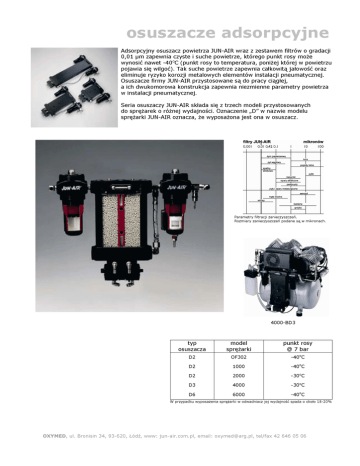 osuszacze adsorpcyjne Adsorpcyjny osuszacz powietrza JUN-AIR wraz z zestawem filtrów o gradacji 0,01 µm zapewnia czyste i suche powietrze, którego punkt rosy moŜe wynosić nawet -40oC (punkt rosy to temperatura, poniŜej której w powietrzu pojawia się wilgoć). Tak suche powietrze zapewnia całkowitą jałowość oraz eliminuje ryzyko korozji metalowych elementów instalacji pneumatycznej. Osuszacze firmy JUN-AIR przystosowane są do pracy ciągłej, a ich dwukomorowa konstrukcja zapewnia niezmienne parametry powietrza w instalacji pneumatycznej. Seria osuszaczy JUN-AIR składa się z trzech modeli przystosowanych do spręŜarek o róŜnej wydajności. Oznaczenie „D” w nazwie modelu spręŜarki JUN-AIR oznacza, Ŝe wyposaŜona jest ona w osuszacz. Parametry filtracji zanieczyszczeń. Rozmiary zanieczyszczeń podane są w mikronach. 4000-BD3 typ osuszacza model spręŜarki punkt rosy @ 7 bar D2 1000 -40oC D2 2000 -30oC D3 4000 -30oC D6 6000 -40oC D2 OF302 -40oC W przypadku wyposaŜenia spręŜarki w odwadniacz jej wydajność spada o około 18-20% OXYMED, ul. Bronisin 34, 93-620, Łódź, www: jun-air.com.pl, email: [email protected], tel/fax 42 646 05 06