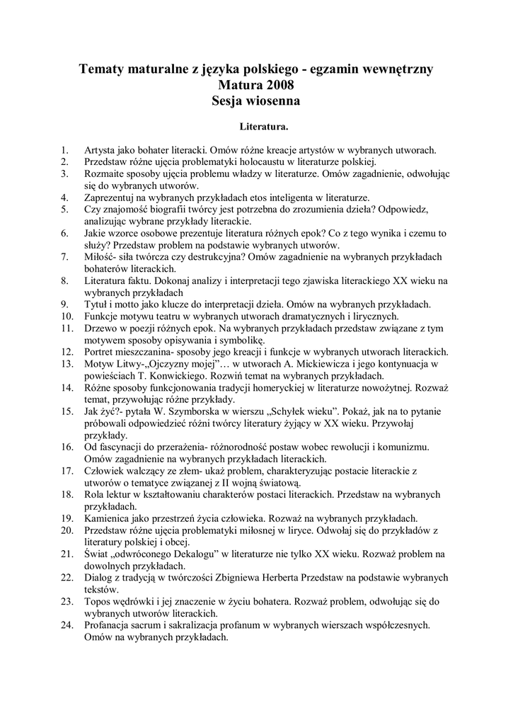 Tematy maturalne z języka polskiego - egzamin wewnętrzny Matura 2008 Sesja wiosenna Literatura. 1. 2. 3. 4. 5. 6. 7. 8. 9. 10. 11. 12. 13. 14. 15. 16. 17. 18. 19. 20. 21. 22. 23. 24. Artysta jako bohater literacki. Omów różne kreacje artystów w wybranych utworach. Przedstaw różne ujęcia problematyki holocaustu w literaturze polskiej. Rozmaite sposoby ujęcia problemu władzy w literaturze. Omów zagadnienie, odwołując się do wybranych utworów. Zaprezentuj na wybranych przykładach etos inteligenta w literaturze. Czy znajomość biografii twórcy jest potrzebna do zrozumienia dzieła? Odpowiedz, analizując wybrane przykłady literackie. Jakie wzorce osobowe prezentuje literatura różnych epok? Co z tego wynika i czemu to służy? Przedstaw problem na podstawie wybranych utworów. Miłość- siła twórcza czy destrukcyjna? Omów zagadnienie na wybranych przykładach bohaterów literackich. Literatura faktu. Dokonaj analizy i interpretacji tego zjawiska literackiego XX wieku na wybranych przykładach Tytuł i motto jako klucze do interpretacji dzieła. Omów na wybranych przykładach. Funkcje motywu teatru w wybranych utworach dramatycznych i lirycznych. Drzewo w poezji różnych epok. Na wybranych przykładach przedstaw związane z tym motywem sposoby opisywania i symbolikę. Portret mieszczanina- sposoby jego kreacji i funkcje w wybranych utworach literackich. Motyw Litwy-„Ojczyzny mojej”… w utworach A. Mickiewicza i jego kontynuacja w powieściach T. Konwickiego. Rozwiń temat na wybranych przykładach. Różne sposoby funkcjonowania tradycji homeryckiej w literaturze nowożytnej. Rozważ temat, przywołując różne przykłady. Jak żyć?- pytała W. Szymborska w wierszu „Schyłek wieku”. Pokaż, jak na to pytanie próbowali odpowiedzieć różni twórcy literatury żyjący w XX wieku. Przywołaj przykłady. Od fascynacji do przerażenia- różnorodność postaw wobec rewolucji i komunizmu. Omów zagadnienie na wybranych przykładach literackich. Człowiek walczący ze złem- ukaż problem, charakteryzując postacie literackie z utworów o tematyce związanej z II wojną światową. Rola lektur w kształtowaniu charakterów postaci literackich. Przedstaw na wybranych przykładach. Kamienica jako przestrzeń życia człowieka. Rozważ na wybranych przykładach. Przedstaw różne ujęcia problematyki miłosnej w liryce. Odwołaj się do przykładów z literatury polskiej i obcej. Świat „odwróconego Dekalogu” w literaturze nie tylko XX wieku. Rozważ problem na dowolnych przykładach. Dialog z tradycją w twórczości Zbigniewa Herberta Przedstaw na podstawie wybranych tekstów. Topos wędrówki i jej znaczenie w życiu bohatera. Rozważ problem, odwołując się do wybranych utworów literackich. Profanacja sacrum i sakralizacja profanum w wybranych wierszach współczesnych. Omów na wybranych przykładach. 25. 26. 27. 28. 29. 30. 31. 32. 33. 34. 35. 36. 37. 38. 39. 40. 41. 42. 43. 44. 45. 46. 47. 48. 49. Literackie obrazy cierpienia i bólu człowieka. Omów na przykładzie wybranych tekstów literackich. Romantyczny rodowód bohaterów polskiej literatury współczesnej. Rozwiń myśl, wykorzystując właściwe przykłady. Łódź jako „ziemia przeklęta” i „ziemia obiecana”. Przedstaw różne wizerunki miasta w literaturze i publicystyce. Od sagi rodzinnej po mikropowieść. Wykorzystując wybrane przykłady, przedstaw drogi rozwoju powieści europejskiej. Świat techniki w powieściach fantastycznonaukowych Stanisława Lema. Omów na wybranych przykładach. Tajemnice polskich rzek ukazane w poezji i prozie. Przedstaw na przykładzie wybranych utworów. Różne kreacje kobiet w literaturze współczesnej. Omów i zinterpretuj różne ujęcia motywu na wybranych przykładach. Orientalizm w literaturze XIX wieku. Przedstaw różne sposoby funkcjonowania motywu. Motyw dworu - różne wizje dworu szlacheckiego w literaturze różnych epok. Omów zagadnienie, odwołując się do wybranych utworów. Krajobraz jako motyw literacki. Przedstaw jego funkcjonowanie w twórczości pisarzy różnych epok. Konflikty rodzinne w dramatach różnych epok literackich. Omów zagadnienie, odwołując się do 3 wybranych dramatów. Od afirmacji do kontestacji - kreacje różnych podstaw wobec Boga. Omów problem, odwołując się do wybranych przykładów. Mit o Prometeuszu i jego literackie przetworzenia. Omów problem, odwołując się do wybranych utworów. Motywy miasta/wsi i jego funkcje. Omów zagadnienia funkcjonowania tego motywu, odwołując się do wybranych utworów. Różne sposoby kreowania wizerunku władców i w literaturze polskiej i obcej. Przedstaw problem, odwołując się do wybranych przykładów. Przemiana wewnętrzna jako motyw określający osobowości bohatera literackiego. Omów problem, opierając się na wybranych przykładów. Problem powinności rządzących w ujęciu twórców różnych epok (np. J. Kochanowski, I. Krasicki, J. Ursyn Niemcewicz, Cz. Miłosz). Fikcja w odwrocie, natarcie dokumentu. Rozważ uwarunkowania tego zjawiska literackiego w literaturze współczesnej. Rozważ problem różnego wykorzystania biografii twórcy w literaturze, odwołaj się do wybranych utworów. Rozważania o inspirującej roli kultury antycznej w literaturze późniejszych epok, omów problem, odwołując się do wybranych utworów. Literacki wizerunek szlachty w wybranych utworach literackich różnych epok. Omów zagadnienie, odwołując się do wybranych przykładów. Różne oblicza miłości w literaturze na przestrzeni wieków. Omów problem, odwołując się do wybranych przykładów literackich. Dom jako miejsce kształtowania charakteru, poglądów i postaw bohaterów literackich. Omów problem, odwołując się do wybranych tekstów literackich. Motywy tańca i jego funkcje w utworze. Omów zagadnienie, odwołując się do wybranych tekstów literackich. Dziecko jako bohater literacki. Zaprezentuj różne ujęcia motywu w wybranych utwor