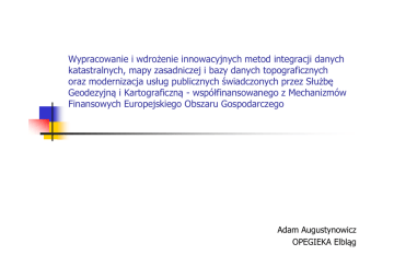 Wypracowanie i wdrożenie innowacyjnych metod integracji danych katastralnych, mapy zasadniczej i bazy danych topograficznych oraz modernizacja usług publicznych świadczonych przez Służbę Geodezyjną i Kartograficzną - współfinansowanego z Mechanizmów Finansowych Europejskiego Obszaru Gospodarczego Adam Augustynowicz OPEGIEKA Elbląg Przedmiot prac Prace eksperckie mające na celu opracowanie zintegrowanego modelu danych katastralnych oraz mapy zasadniczej, zaprojektowanie struktury bazy danych według przyjętego modelu danych, określenie niezbędnych standardów technicznych dla projektu, opracowanie zasad aktualizacji Bazy Danych Topograficznych danymi zawartymi w zintegrowanej bazie danych Przeprowadzenie szkoleń w/w zakresie Analiza przepisów Przeprowadzenie analizy zakresu tematycznego rejestrów i baz danych prowadzonych przez Służbę Geodezyjną i Kartograficzną, w odniesieniu do kompetencji samorządowej i rządowej administracji publicznej, oraz przedsiębiorstw i jednostek organizacyjnych gmin, powiatów, województw i Skarbu Państwa Katalog obiektów Zgodność ze standardem ISO 19110:2005 w zakresie typów obiektów, atrybutów typów obiektów, związków pomiędzy typami obiektów, operacji typów obiektów, relacji dziedziczenia pomiędzy typami obiektów. Specyfikacje Ogólny obiekt przestrzenny i geodezyjny Szczegółowe modele georeferencyjne Katalog obiektów danych georeferencyjnych, obejmujący zakres treści baz krajowego systemu informacji o terenie tj. Bazy Bazy Bazy Bazy danych danych danych danych szczegółowych osnów geodezyjnych ewidencji gruntów i budynków geodezyjnej ewidencji sieci uzbrojenia terenu obiektów topograficznych objętych zakresem treści mapy zasadniczej objętych zakresem treści TBD Rejestr cen i wartości nieruchomości Bazy danych tematycznych Schemat aplikacyjny Forma opisu w ISO/TS 19103:2005 Modele pojęciowe z ISO z serii 19100 Typy obiektów i reguły z ISO 19109:2005 Geometria i topologia z ISO 19107 i ISO 19111 Odniesienia czasowe z ISO 19108 Jakość danych z ISO 19114 Format danych GML z ISO 19136:2007 Metadane z ISO 19115:2003/cor.1:2006 Zasady i reguły zawarte w dyrektywie INSPIRE Jednolity system identyfikatorów Unikalność i jednoznaczność identyfikatorów dla całego kraju Stałość i niezmienność identyfikatora przez cały „cykl życia” obiektu Jednoznaczne referencje do obiektów Przestrzenie nazw identyfikujące źródło danych Uwzględnienie cyklu życia obiektów i zmian ich stanu w czasie Metadane Identyfikacja zbiorów danych (dataset) i serii zbiorów danych (series), Zgodność specyfikacji z Polskim krajowym profilem metadanych w zakresie geoinformacji ISO 19115:2003/cor.1:2006 ISO/TS 19139:2007. Wytyczne, zalecenia, rekomendacje Opracowanie wytycznych i zaleceń implementacji schematu aplikacyjnego w środowisku relacyjnej lub relacyjno-obiektowej bazy danych oraz wymagań dla systemów zarządzania tymi bazami danych Opracowanie szczegółowych zasad logicznych i procedur organizacyjnych wymiany danych pomiędzy bazami danych Opracowanie w formie rekomendacji projektów aktów prawnych, dotyczących zmian przepisów technicznych i organizacyjnych prawa geodezyjnego i kartograficznego w odniesieniu do wymagań normatywnych ISO serii 19100 interoperacyjności i współużytkowania danych i usług uwzględniających Założenia dyrektywy INSPIRE Projekt ustawy o infrastrukturze informacji przestrzennej Potrzeby odbiorców i użytkowników danych Szkolenia Szkolenia bezpośrednie System zbierania uwag Szkolenia pośrednie Podstawy norm ISO serii 19100 i języka UML Model danych Uwarunkowania organizacyjne, prawne i techniczne Wdrożenie systemu e-learningu i kursów e-lerningowych Grupa szkoleniowa 800 osób Pracownicy Starostwa Powiatowego w Piasecznie, Miasta Płocka, BGWM w Warszawie Pracownicy GUGIK, CODGIK i WODGIK Geodeci województw, wojewódzcy inspektorzy nadzoru geodezyjnego i kartograficznego, Geodeci powiatowi, kierownicy PODGIK, Geodeci gminni woj. mazowieckiego. Stan początkowy Analiza przepisów Różnice pojęciowe Redundancja danych Nieaktualność Ograniczona dostępność Wytyczne implementacyjne INSPIRE Przechowywanie, udostępnianie oraz utrzymywanie i aktualizowanie danych przestrzennych powinno się odbywać na tym poziomie gdzie będzie to robione najefektywniej; Możliwość łączenia w jednolity sposób danych przestrzennych pochodzących z różnych źródeł i wspólne korzystanie z nich przez wielu użytkowników i wiele aplikacji; Możliwość łatwego wyszukiwania danych przestrzennych oraz dokonywania oceny ich przydatności dla określonego celu. Rola Służby Geodezyjnej Rozważana problematyka Nowe role Twórca danych przestrzennych Integrator danych przestrzennych Dystrybutor danych przestrzennych Operator infrastruktury danych przestrzennych Nowe uwarunkowania Sytuacja prawna Sytuacja biznesowa Cele budowy baz danych Możliwości technologiczne Ukierunkowanie na usługi sieciowe Twórca danych przestrzennych Rozważana problematyka Na ile treść objęta urzędową (ustawową) ewidencją ma charakter źródłowy a na ile referencyjny i dla kogo? W jaki sposób na podstawie danych z jednej ewidencji tworzyć inne zasoby referencyjne? Np. Budynek na mapie ewidencyjnej, zasadniczej, topograficznej Na ile dobór treści tworzonych zasobów jest zdeterminowany możliwością ich skutecznej aktualizacji? Np. Ewidencja dróg i mostów – a mapa zasadnicza i topograficzna Na ile powinniśmy ograniczać (eliminować) prowadzoną treść a na ile ją powielać (redundancja) i dla jakich celów? Np. Ewidencja gruntów, budynków i lokali - a dane NKW Np. Ewidencja GESUT - a systemy branżowe Np. Mapa ewidencyjna - Użytki W jakim zakresie obsługiwać „obcą logikę” danych przestrzennych? Np. Uzbrojenie podziemne Integrator danych przestrzennych Rozważana problematyka W jakim stopniu uda się wymusić na podmiotach zewnętrznych (komercyjnych, instyt