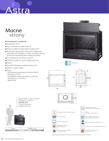 Astra Mocne strony szczędność i wydajność O Sprawność 78 % Moc nominalna 10 kW (Astra 2) Wnętrze żeliwne; tylna żeliwna płyta „fale” Możliwość demontażu elementów żeliwnych paleniska od wewnątrz: w razie wymiany, nie jest konieczne demontowanie całego kominka! Drzwi żeliwne; otwieranie boczne Deflektor spalin ze stali nierdzewnej inox Szyber Popielnik dostępny podczas pracy 5,2 l. System „czysta szyba” Opcje: • Dystrybutor gorącego powietrza DA101 • Obudowa CP101 • Dodatkowe dysze gorącego powietrza (dla DA101) ø 125 mm • Nóżki PS67 ASTRA 2 Model Astra 2 jest również dostępny w wersji: Astra 2 D z automatyczną sprężyną drzwi. 10 H Dystrybutor powietrza jako wyposażenie opcjonalne 1,75 m FEU CONTINU Oznaczenie jakości Zielony Płomień Szyber: zmniejsza zużycie drewna Norma francuska Ogień ciągły, utrzymywanie żaru przez ponad 10 godz Astra 2 System „czysta szyba” BÛCHES STANDARD MODEL otwieranie drzwi astra 2 / 2 D Boczne KOD 111893 / 111894 Maksymalna długość 50cm polan do 50 cm* Korpus grzewczy wykonany w całości z żeliwa Popielnik dostępny podczas pracy Podstawa w wyposażeniu opcjonalnym Ogrzewana powierzchnia (tabela na str. 113) * Określenie standardowych rozmiarów polan dostępnych w handlu. 92 Parametry techniczne: patrz strona 114