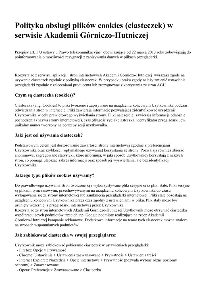 Polityka obsługi plików cookies (ciasteczek) w serwisie Akademii Górniczo-Hutniczej Przepisy art. 173 ustawy „ Prawo telekomunikacyjne" obowiązujące od 22 marca 2013 roku zobowiązują do poinformowania o możliwości rezygnacji z zapisywania danych w plikach przeglądarki. Korzystając z serwisu, aplikacji i stron internetowych Akademii Górniczo-Hutniczej wyrażasz zgodę na używanie ciasteczek zgodnie z polityką ciasteczek. W przypadku braku zgody należy zmienić ustawienia przeglądarki zgodnie z zaleceniami producenta lub zrezygnować z korzystania ze stron AGH. Czym są ciasteczka (cookies)? Ciasteczka (ang. Cookies) to pliki tworzone i zapisywane na urządzeniu końcowym Użytkownika podczas odwiedzania stron w internecie. Pliki zawierają informację pozwalającą zidentyfikować urządzenie Użytkownika w celu prawidłowego wyświetlania strony. Pliki najczęściej zawierają informację odnośnie pochodzenia (nazwa strony internetowej), czas (długość życia) ciasteczka, identyfikator przeglądarki, ew. unikalny numer tworzony na potrzeby sesji użytkownika. Jaki jest cel używania ciasteczek? Podstawowym celem jest dostosowanie zawartości strony internetowej zgodnie z preferencjami Użytkownika oraz szybkości (optymalnego używania) korzystania ze strony. Pozwalają również zbierać anonimowe, zagregowane statystyki, które informują, w jaki sposób Użytkownicy korzystają z naszych stron, co pomaga ulepszać zakres informacji oraz sposób jej wyświetlania, ale bez identyfikacji Użytkownika. Jakiego typu plików cookies używamy? Do prawidłowego używania stron tworzone są i wykorzystywane pliki sesyjne oraz pliki stałe. Pliki sesyjne są plikami tymczasowymi, przechowywanymi na urządzeniu końcowym Użytkownika do czasu wylogowania się ze strony internetowej lub zamknięcia przeglądarki internetowej. Pliki stałe pozostają na urządzeniu końcowym Użytkownika przez czas zgodny z ustawieniami w pliku. Plik stały może być usunięty wcześniej z przeglądarki internetowej przez Użytkownika. Korzystając ze stron internetowych Akademii Górniczo-Hutniczej Użytkownik może otrzymać ciasteczka współpracujących podmiotów trzecich, np. Google podmioty realizujące na rzecz Akademii Górniczo-Hutniczej kampanie reklamowe. Dodatkowe informacje na temat tych ciasteczek można znaleźć na stronach wspomnianych podmiotów. Jak zablokować ciasteczka w swojej przeglądarce: Użytkownik może zablokować pobieranie ciasteczek w ustawieniach przeglądarki: - Firefox: Opcje > Prywatność - Chrome: Ustawienia > Ustawienia zaawansowane > Prywatność > Ustawienia treści - Internet Explorer: Narzędzia > Opcje internetowe > Prywatność (pozwala wybrać różne poziomy ochrony) > Zaawansowane - Opera: Preferencje > Zaawansowane > Ciasteczka