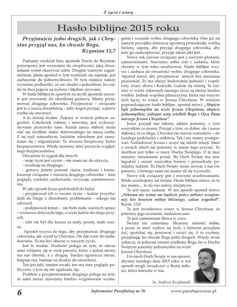 Z życia i wiary Hasło biblijne 2015 roku Przyjmujcie jedni drugich, jak i Chrystus przyjął nas, ku chwale Boga. Rzymian 15,7 Piętnasty rozdział listu apostoła Pawła do Rzymian poświęcony jest wezwaniu do cierpliwości, jaką chrześcijanie winni okazywać sobie. Drugim ważnym zagadnieniem, jakim apostoł w tym rozdziale się zajmuje, jest zachęcenie do jednomyślności. W tym miejscu należy wyraźnie podkreślić, że nie chodzi o jednolitość, bo często te dwa pojęcia są mylone i błędnie używane. W haśle biblijnym opartym na myśli apostoła zawarte jest wezwanie do określonej postawy. Mamy przyjmować drugiego człowieka. Przyjmować – związane jest to z naszą otwartością – żeby kogoś przyjąć, wpierw trzeba się otworzyć. A to dzisiaj trudne. Żyjemy w świecie pełnym zagrożeń. Cokolwiek robimy i mówimy, jest wykorzystywane przeciwko nam. Każda nasza słabość może stać się źródłem ataku skierowanego na naszą osobę. Z tej racji naturalnym, ludzkim odruchem jest zamykanie się i odgradzanie. To stwarza bezpieczny bufor bezpieczeństwa. Wtedy możemy mieć poczucie względnego bezpieczeństwa. Otwartość to sygnał dla innych: - moje życie jest czyste – nie mam nic do ukrycia, - oczekuję na drugiego, - gotowy jestem ponosić ciężar, trudność i konsekwencje związane z innością drugiego człowieka – inne poglądy, wartości, zachowanie, zwyczaje, zainteresowania. W jaki sposób Jezus podchodził do ludzi: - przyjmował ich w swoim życiu – ludzie przychodzili do Niego z chorobami, problemami – nikogo nie odrzucił, - podejmował temat – nie było mało ważnych spraw – rozmowa dotyczyła tego, z czym ludzie do niego przyszli, - nikt nie był dla Jezusa za mały, prosty, mało ważny. Apostoł wzywa do tego, aby przyjmować drugiego człowieka, jak czynił to Chrystus. On dał wzór do naśladowania. To ma być obecne w naszym życiu. Jest to trudne. Trudność polega na tym, że nieraz sami wbijamy się w swój pancerz, który z jednej strony ma nas chronić, a z drugiej bardzo ogranicza nieraz, krępuje nas, hamuje na drodze do otwartości. Ten jest taki, tamten owaki, ten ma inne poglądy polityczne, z tym się nie zgadzam, itp. Problem z przyjmowaniem drugiego polega na tym, że sami nieraz stawiamy bardzo wygórowane wyma- 6 gania i warunki wobec drugiego człowieka. One już na samym początku stanowią ogromną przeszkodę, wielką barierę, zaporę, aby przyjąć drugiego człowieka, aby móc go zaakceptować, przyjąć takim jaki jest. Nowy rok zawsze związany jest z nowymi planami, zamierzeniami. Stawiamy sobie cele i zadania, które chcemy w tym roku zrealizować. Hasło biblijne wzywa i zachęca do otwartości wobec drugiego człowieka. Apostoł mówi, aby przyjmować innych bez stawiania przeszkód. To ma służyć budowaniu jedności i wspólnoty wiary zboru i Kościoła. Ludzie się różnią. Te różnice w wielu zakresach naszego życia są nieraz bardzo wielkie. Jednak wspólna płaszczyzna, która nas wszystkich łączy, to wiara w Jezusa Chrystusa. W wierszu poprzedzającym hasło biblijne apostoł mówi: „Abyście byli jednomyślni na wzór Jezusa Chrystusa, abyście jednomyślnie, jednymi usty wielbili Boga i Ojca Pana naszego Jezusa Chrystusa”. Jezus przyjął nas takimi, jakimi jesteśmy, z tym wszystkim co mamy. Przyjął z tym, co dobre, ale i nasze słabości, to co złego. Chrystus nie stawia warunków – do każdego podchodzi z miłością. Tak i my mamy postępować. Naśladować Jezusa i uczyć się takich relacji. Sami o swoich siłach nie jesteśmy w stanie tego uczynić. To możliwe jest tylko w mocy Ducha Świętego. O tę moc musimy nieustannie prosić. Bo Duch Święty ma moc łagodzić i znosić wszystkie bariery i przeszkody pomiędzy ludźmi. To Duch Święty może zerwać z nas ów pancerz, z którego sami nie mamy sił się wyzwolić. Nowy rok związany jest z nowymi oczekiwaniami. Wiele oczekujemy od świata. Hasło biblijne mówi, że to my mamy..., to do nas należy inicjatywa. To jest nasze zadanie. W ten sposób apostoł mówi: „Nikomu nic winni nie bądźcie prócz miłości wzajemnej; kto bowiem miłuje bliźniego, zakon wypełnił”. Rzym. 13,8 To jest świadectwo wiary w Jezusa Chrystusa, że jesteśmy jego uczniami, naśladowcami. To jest zamienianie Słowa w czyn. Świata nie zmienimy. Możemy zmienić siebie, a przez to mieć wpływ na tych, z którymi przyjdzie żyć, spotykać się, pracować i uczyć się. A to czyńmy, przyjmując ku chwale Boga jedni drugich. Wtedy świat zobaczy, że jednymi ustami wielbimy Boga, bo w Duchu Świętym jesteśmy jednomyślni na wzór Jezusa Chrystusa. I to niech Duch Święty w nas sprawi, abyśmy każdego dnia 2015 roku w ten sposob mogli świadczyć o Bożej miłości, która mieszka w nas. Informator Parafialny nr 76 ks. Andrzej Krzykowski www.parafiajaworze.pl