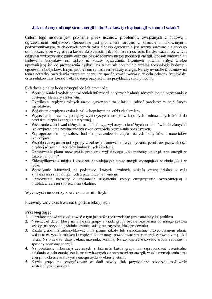Jak możemy uniknąć strat energii i obniżać koszty eksploatacji w domu i szkole? Celem tego modułu jest poznanie przez uczniów problemów związanych z budową i ogrzewaniem budynków. Ogrzewanie jest problemem zarówno w klimacie umiarkowanym i podzwrotnikowym, w chłodnych porach roku. Sposób ogrzewania jest ważny zarówno dla dobrego samopoczucia, ze względu na koszty eksploatacji, jak i klimatu na świecie. Bardzo ważną rolę w tym odgrywa wykorzystanie paliw oraz znajomość różnych metod produkcji energii. Sposób budowania i izolowania budynków ma wpływ na koszty ogrzewania. Uczniowie powinni nabyć wiedzę uprawniającą ich do prowadzenia dyskusji na temat jak optymalnie wybrać technologię budowy i ogrzewania budynków. Innym problemem są nadmierne straty energii. Należy uwrażliwić uczniów na temat potrzeby zarządzania zużyciem energii w sposób zrównoważony, w celu ochrony środowiska oraz redukowania kosztów eksploatacji budynków, na przykładzie szkoły i domu. Składać się na to będą następujące ich czynności: • • • • • • • • • • • Wyszukiwanie i wybór odpowiednich informacji dotyczące badania różnych metod ogrzewania z dostępnej literatury i Internetu, Określenie wpływu różnych metod ogrzewania na klimat i jakość powietrza w najbliższym sąsiedztwie, Wyjaśnienie wpływu spalania paliw kopalnych na efekt cieplarniany, Wyjaśnienie różnicy pomiędzy wykorzystywaniem paliw kopalnych i odnawialnych źródeł do produkcji ciepła i energii elektrycznej, Wskazanie zalet i wad różnych metod budowy, wykorzystania różnych materiałów budowlanych i izolacyjnych oraz powiązanie ich z koniecznością ogrzewania pomieszczeń. Zaproponowanie sposobów badania przewodzenia ciepła różnych budynków i materiałów izolacyjnych Współpraca z partnerami z grupy w zakresie planowania i wykonywania pomiarów przewodności cieplnej różnych materiałów budowlanych i izolacji, Opracowanie planu rozwiązania problemu wyjściowego „Jak możemy uniknąć strat energii w szkole i w domu? Zidentyfikowanie miejsc i urządzeń powodujących straty energii występujące w zimie jak i w lecie. Wyszukanie informacji, na podstawie, których uczniowie wskażą szereg działań w celu zmniejszenia strat związanych z przenoszeniem energii Opracowanie broszury o sposobach uczynienia szkoły energetycznie oszczędniejszą i przedstawienie jej społeczności szkolnej. Wykorzystanie wiedzy z zakresu chemii i fizyki. Przewidywany czas trwania: 6 godzin lekcyjnych Przebieg zajęć 1. Uczniowie powinni dyskutować o tym jak można je rozwiązać przedstawiony im problem. 2. Nauczyciel dzieli klasę na mniejsze grupy i każda grupa będzie przypisana do innego sektora szkoły (na przykład, jadalnia, szatnie, sala gimnastyczna, klasopracownie). 3. Każda grupa ma zidentyfikować i na planie szkoły lub samodzielnie przygotowanym planie wskazać wszystkie miejsca i urządzeń, które mogą powodować straty energii zarówno zimą jak i latem. Na przykład: drzwi, okna, grzejniki, kominy. Należy opisać wszystkie źródła i rodzaje i sposoby wymiany energii. 4. Na podstawie informacji zebranych z Internetu każda grupa ma zaproponować ewentualne działania w celu zmniejszenia strat związanych z przenoszeniem energii, w celu zmniejszenia strat energii w okresie zimowym i energii zyski w okresie letnim. 5. Każda grupa ma zweryfikować w skali szkoły (lub przydzielone sektorze) możliwość znalezionych rozwiązań. 6. Każda grupa ma napisać raport z sugestiami i opisem działań niezbędne do zwiększenia efektywności wymiany energii w szkle. 7. Wspólne przygotowanie broszury informacyjnej o możliwości uczynienia szkoły energetycznie oszczędniejszą. 8. Przygotowanie raportu o możliwości uczynienia domu energetycznie oszczędniejszym. Powyższe efekty zajęć powinny być przedmiotem oceny w odniesieniu do poszczególnych grup uczniów.
